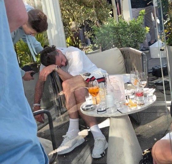 还在养伤当中的格拉利什,周日在一个屋顶酒吧喝醉后直接睡过去了。