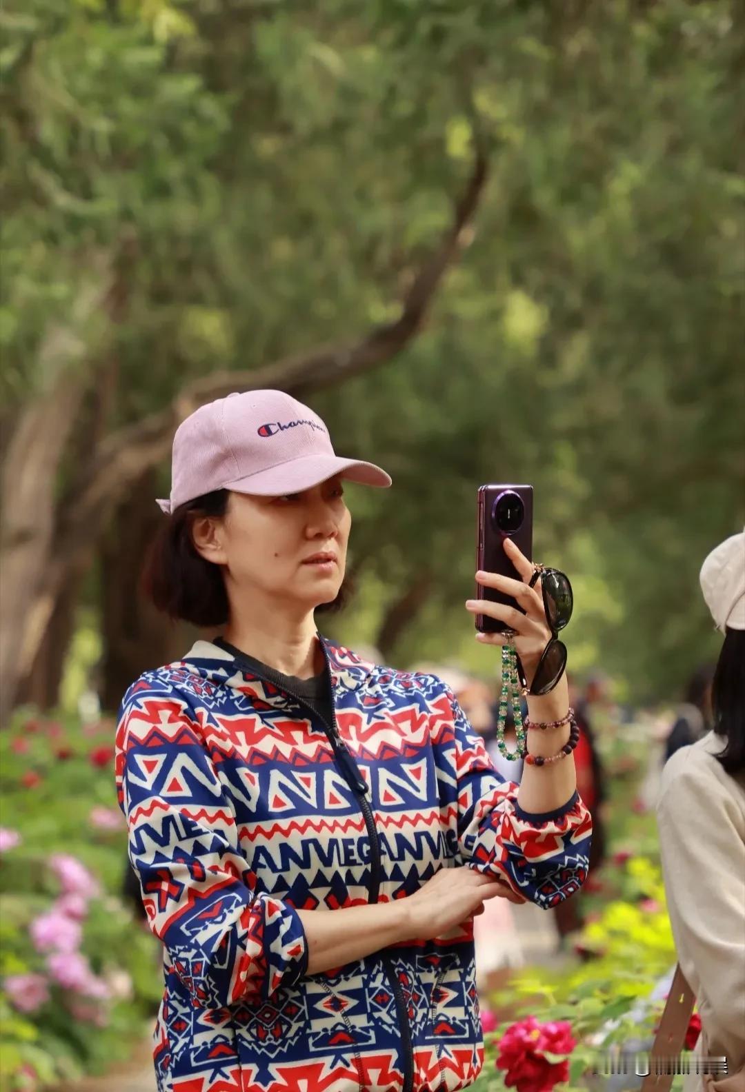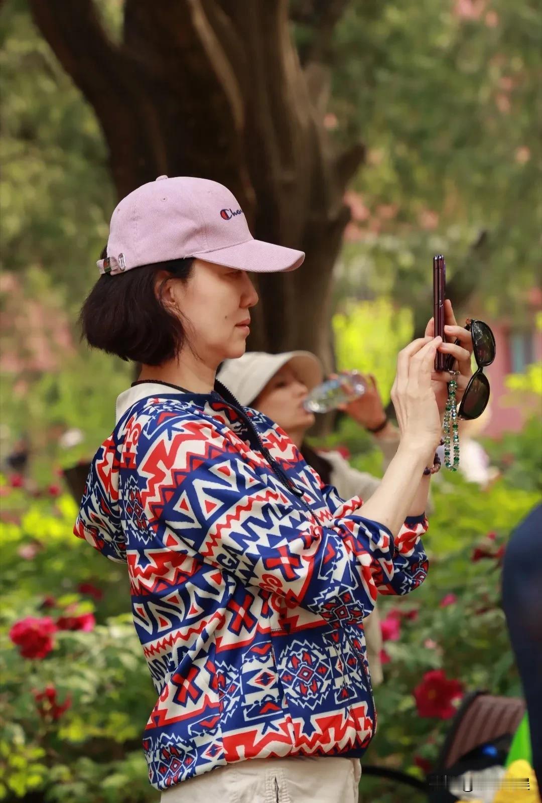 戴着粉紫色棒球帽的她,穿着一件花色连帽外套,搭配白色裤子,穿搭得体、优雅,个子高挑清瘦。