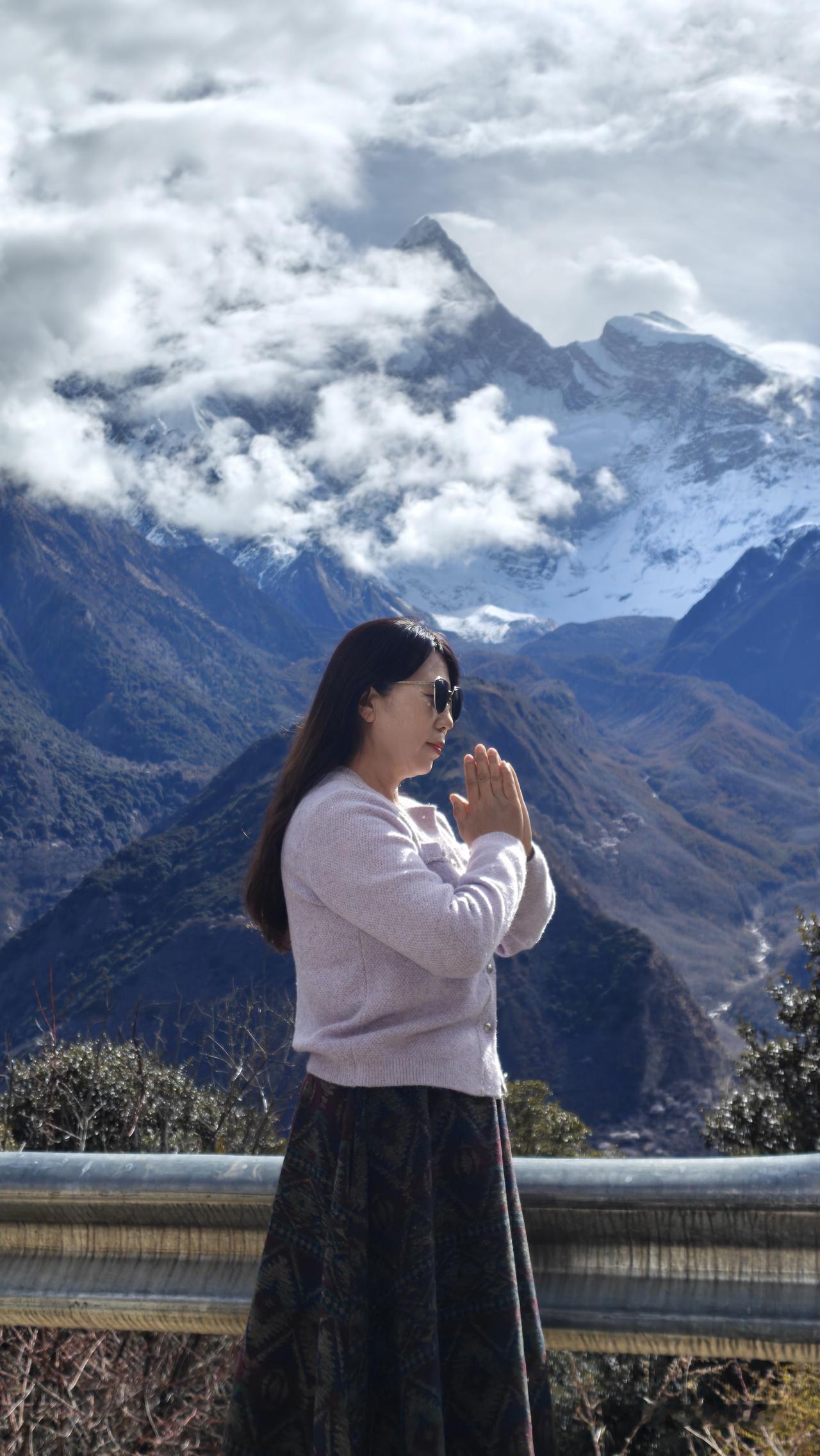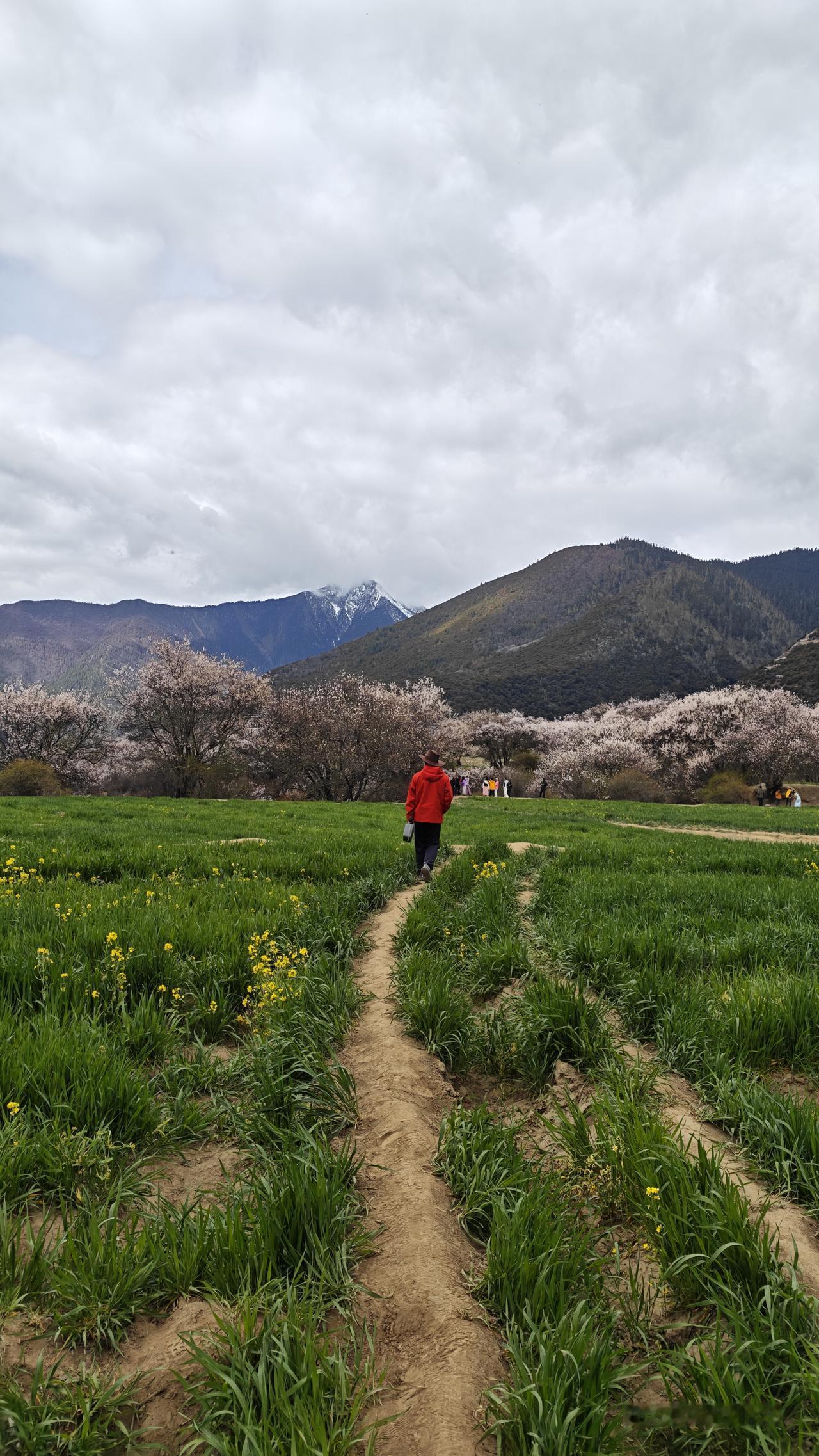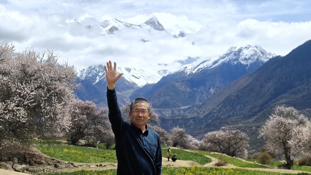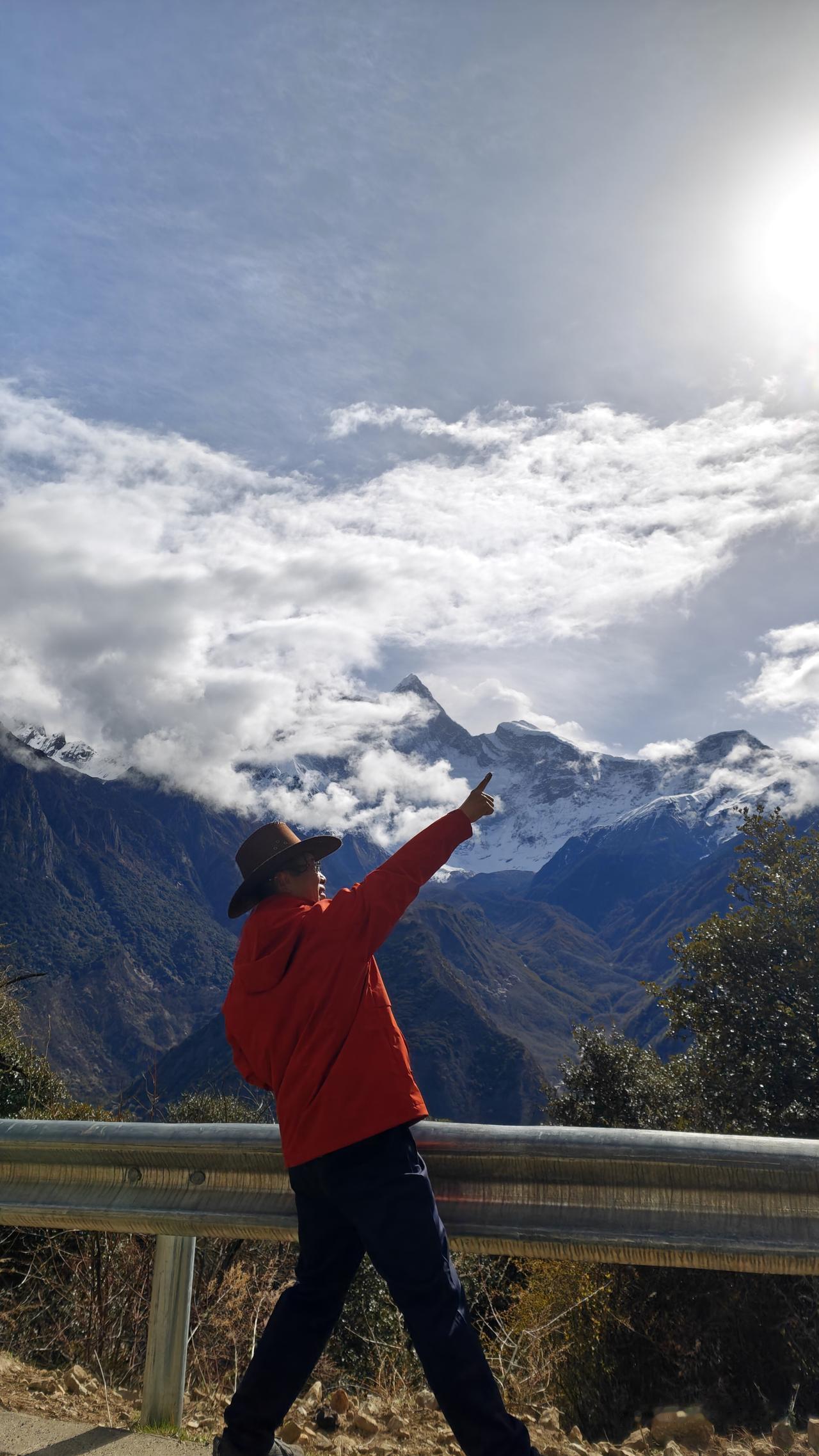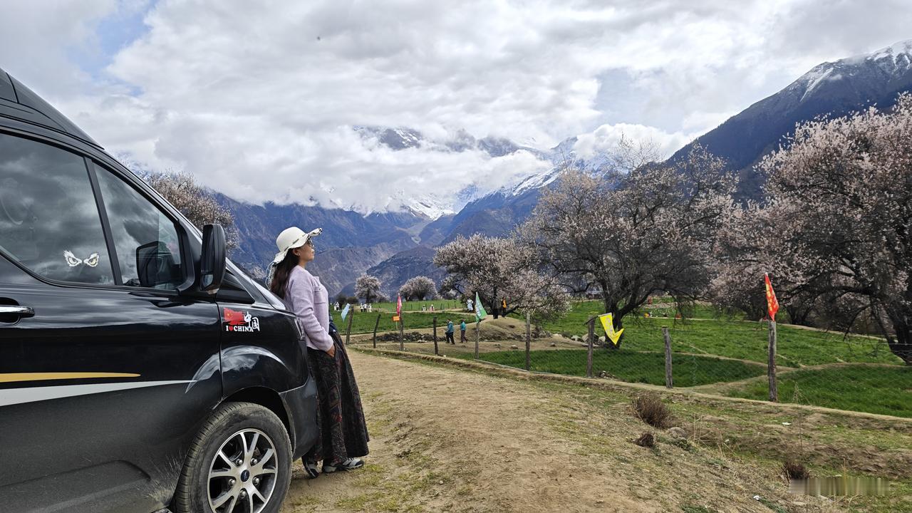 但是云雾瞬息万变,整个山峰始终没有全部露出来。我们又回到昨天露营的附近的停车场,但是这里还是云雾缭绕。在这里等了好长时间,感觉够呛了。已经发动车,准备回返。暮然回首,主峰已经出来了。哇,又一次激动,抓紧再回返到停车场。又是一通狂拍。游客们也非常兴奋。终于雪山、峡谷、桃花、油菜花、南迦巴瓦峰同框了。圆满了,幸运了,如愿了!