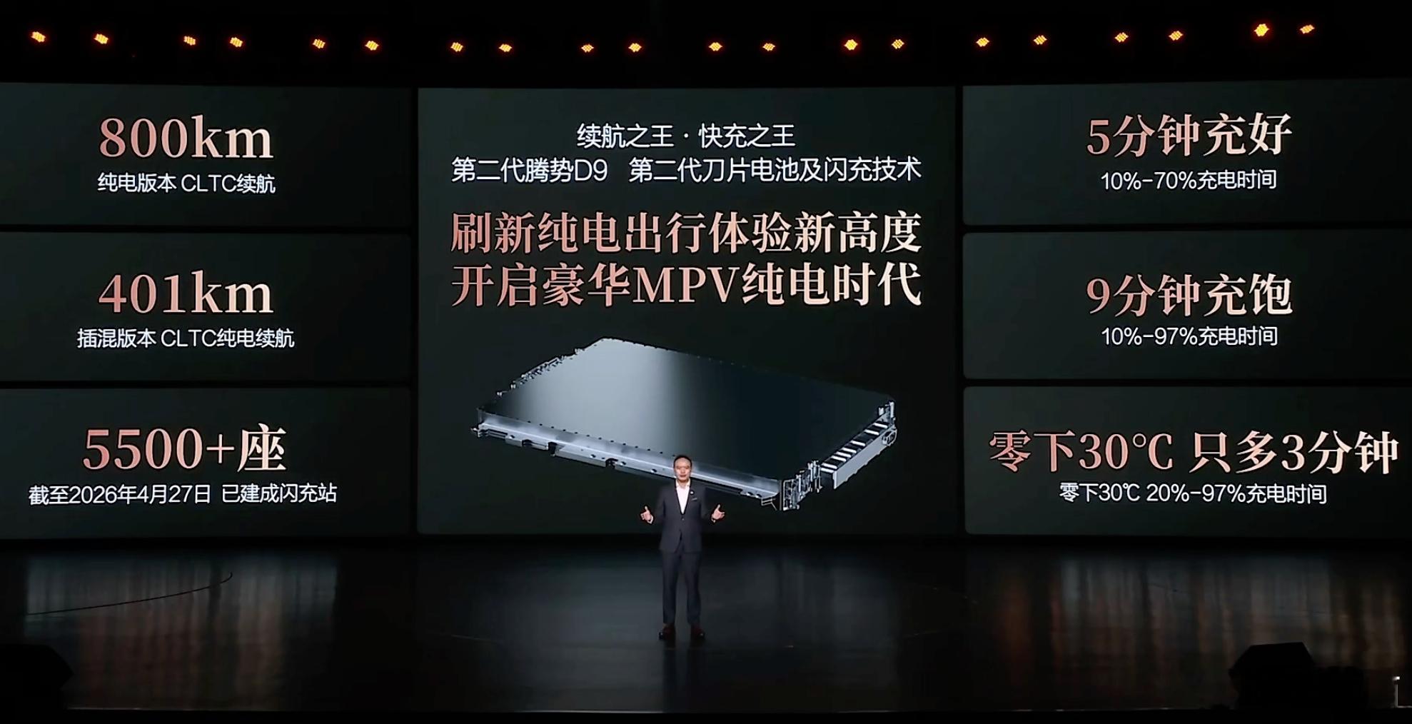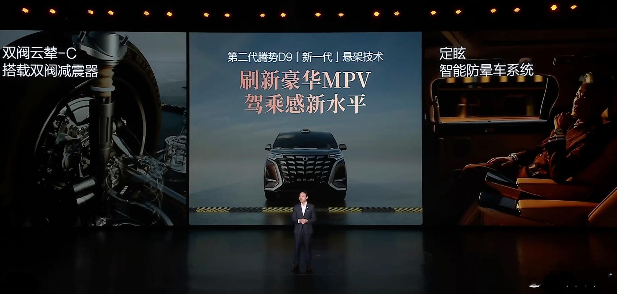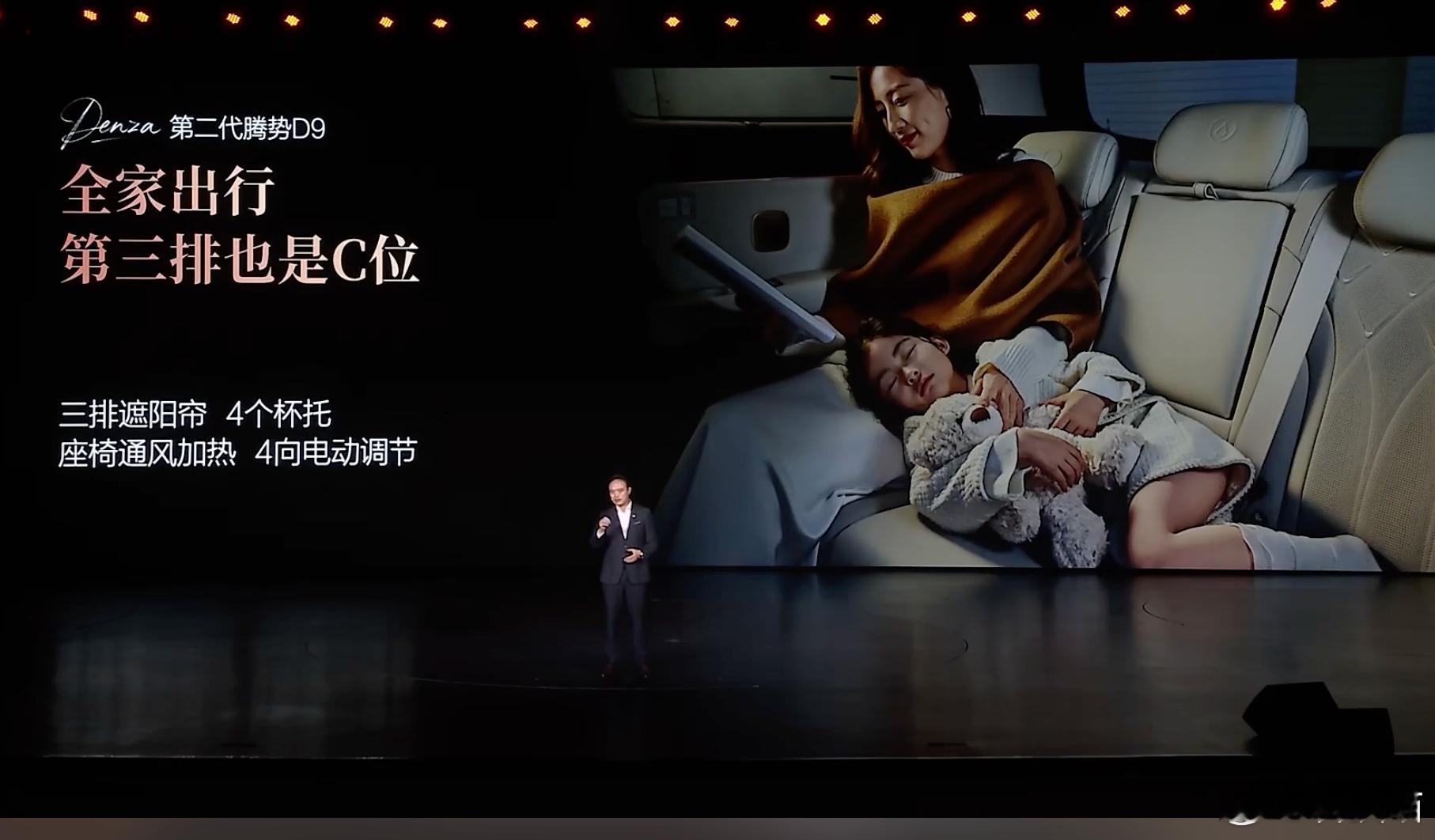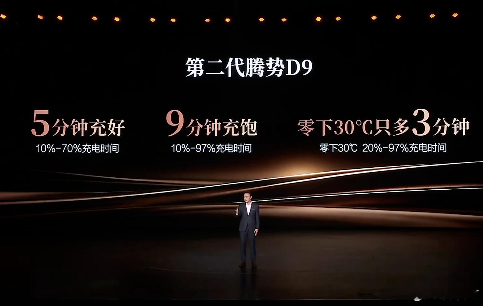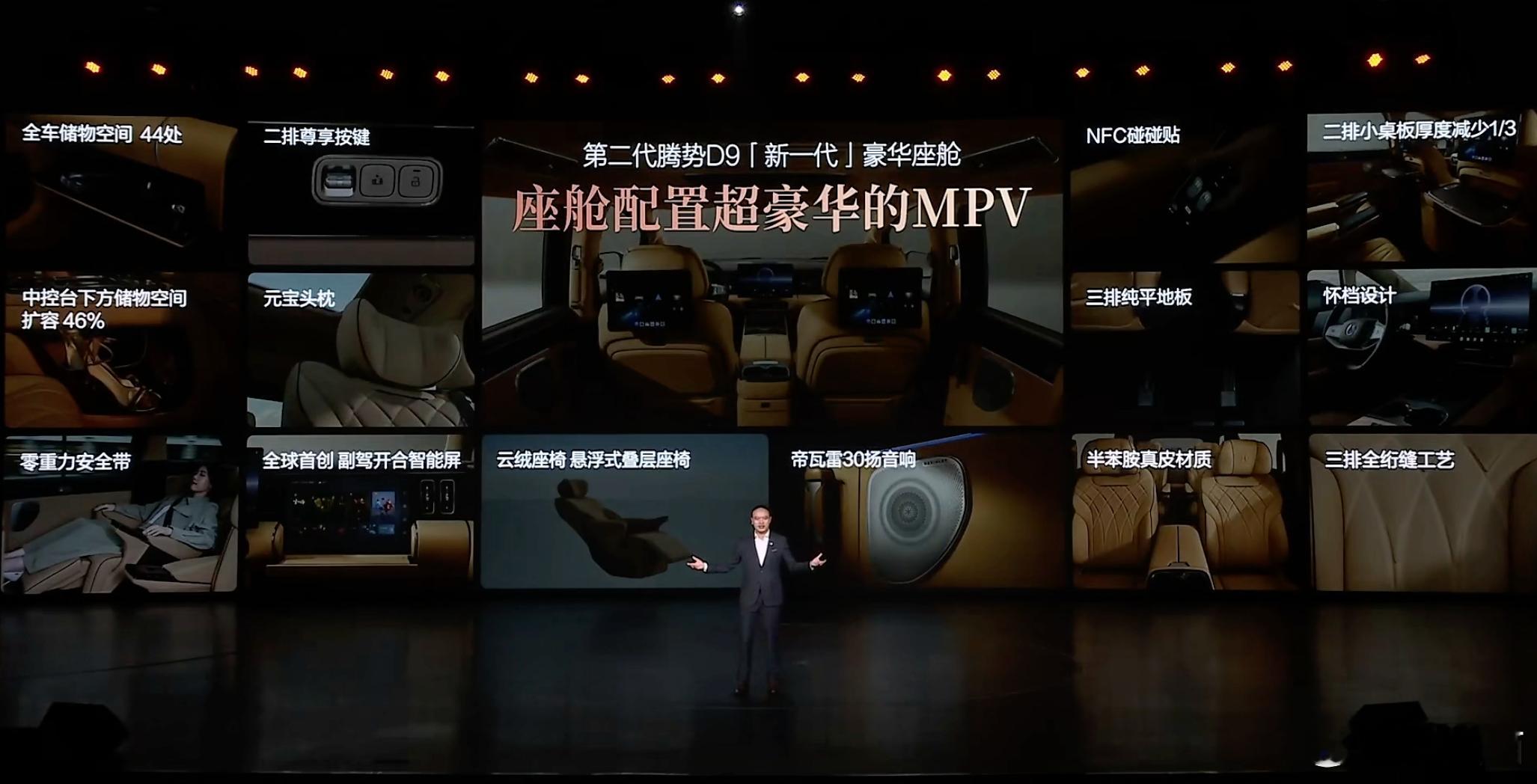 第二代腾势D9搭载闪充今晚上市第二代腾势D9上市发布,全新内饰设计,全新中控,全新座椅,第三排标配座椅通风加热和电动调节,全系标配双50w无线充电,副驾有开合智能屏,也有智能冷暖冰箱,全车储物空间44处