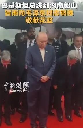 巴基斯坦总统冒雨向毛泽东铜像献花篮,三鞠躬