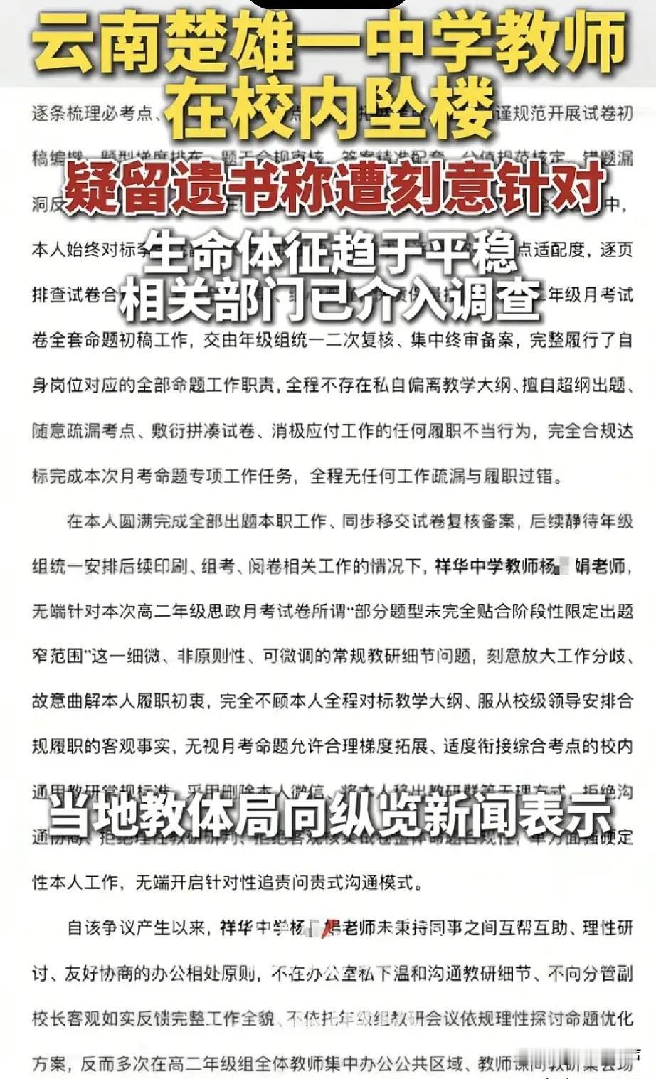 云南中学教师坠楼事件,说实话,看到这个新闻心头拔凉拔凉的。一个在高三带毕业班的老师,按理说正是给学生打气、冲刺高考的时候,结果自己却差点出了事,真的是让人心里堵得慌。