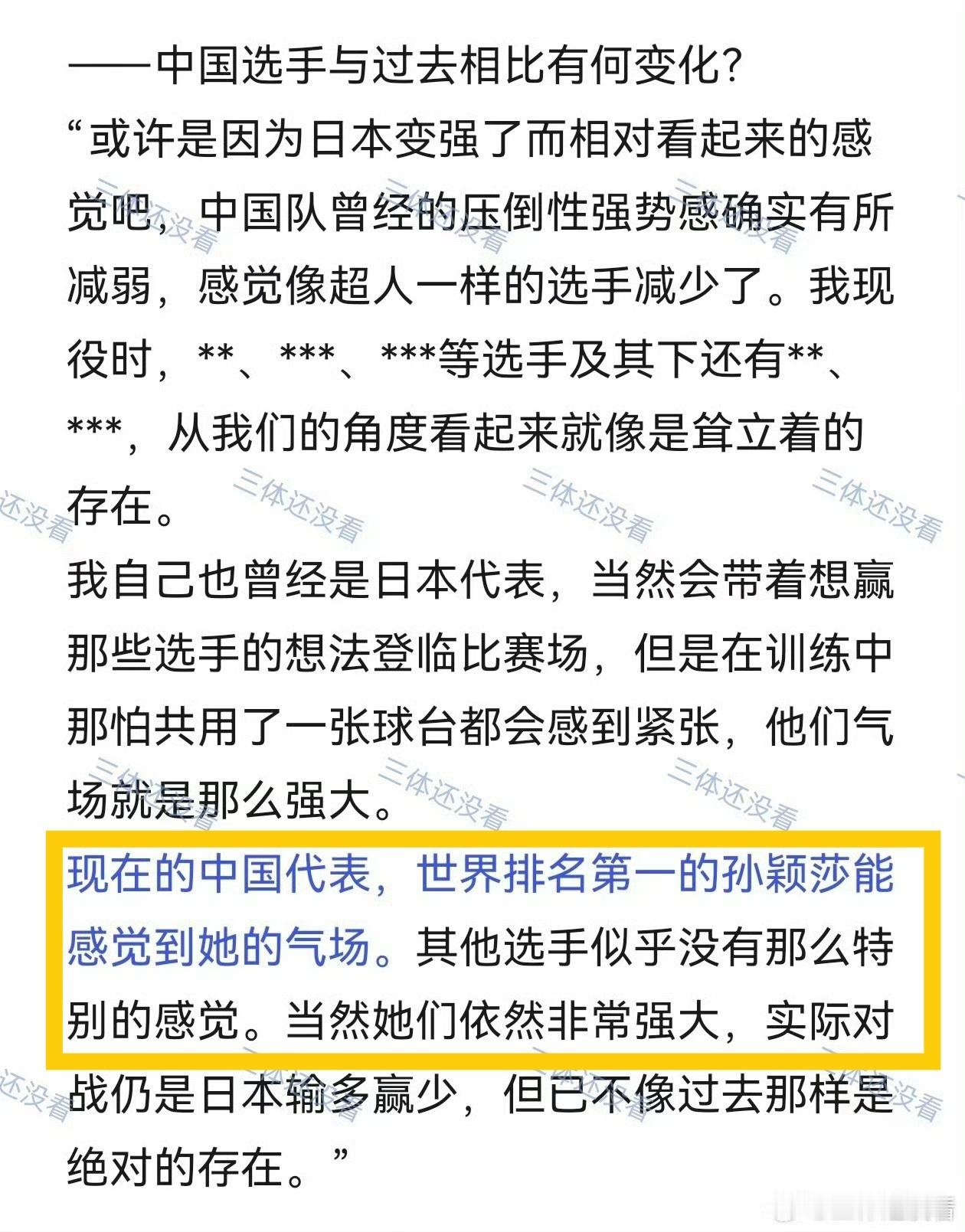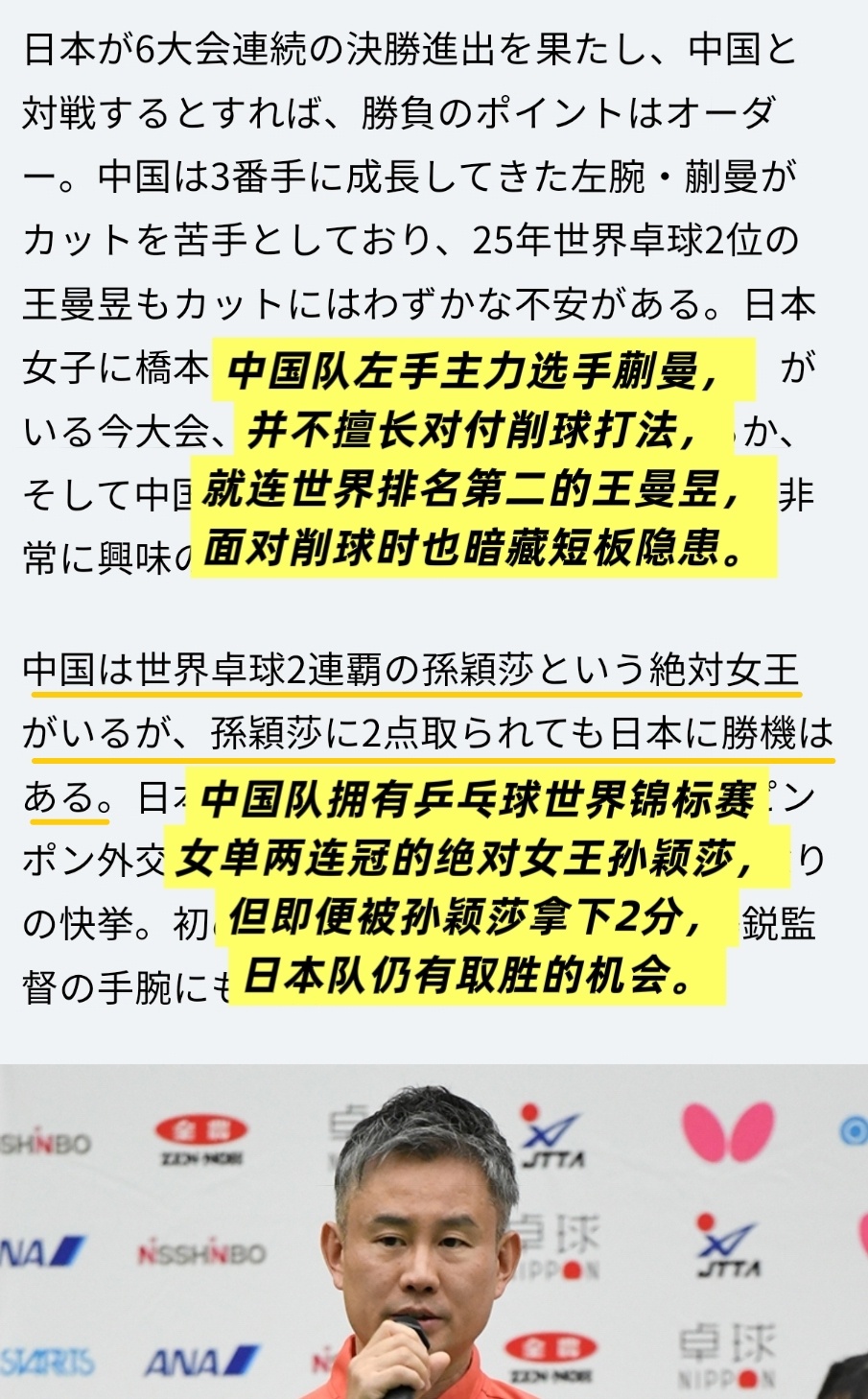 孙颖莎4.27【🇯🇵桌球王国】国乒女队相关——“中国队左手主力选手蒯曼,并不擅长对付削球打法,就连世界排名第二的王曼昱,面对削球时也暗藏短板隐患。”“中国队拥有乒乓球世界锦标赛女单两连冠的「绝对女王」孙颖莎,但即便被孙颖莎拿下2分,日本队仍有取胜的机会。”