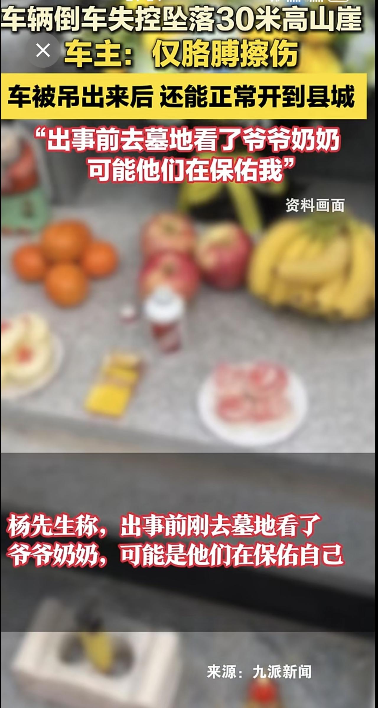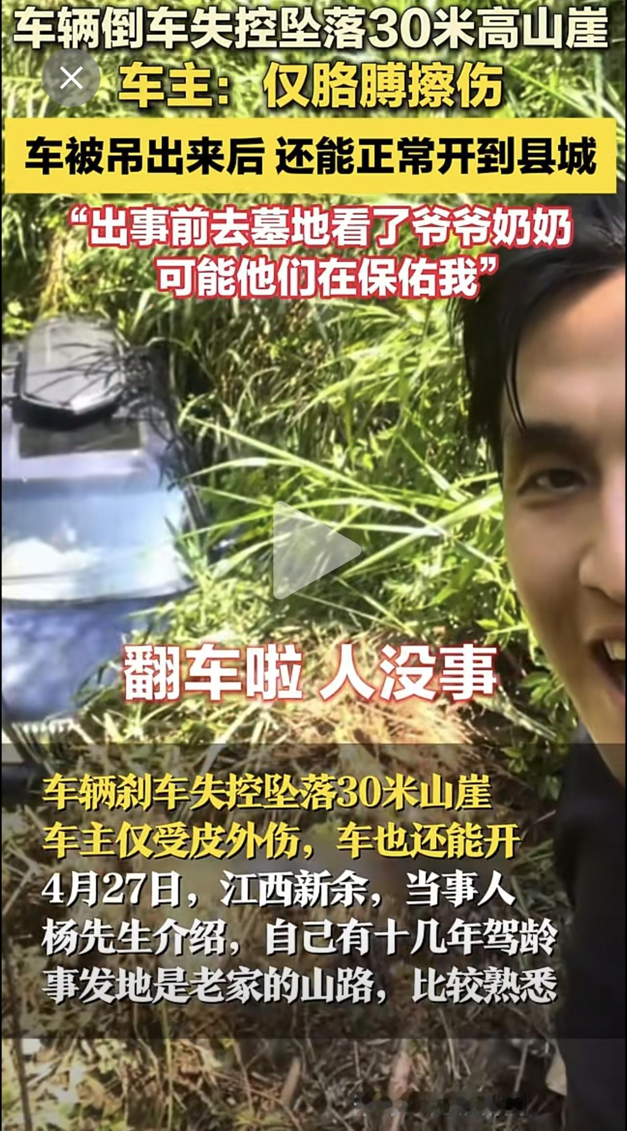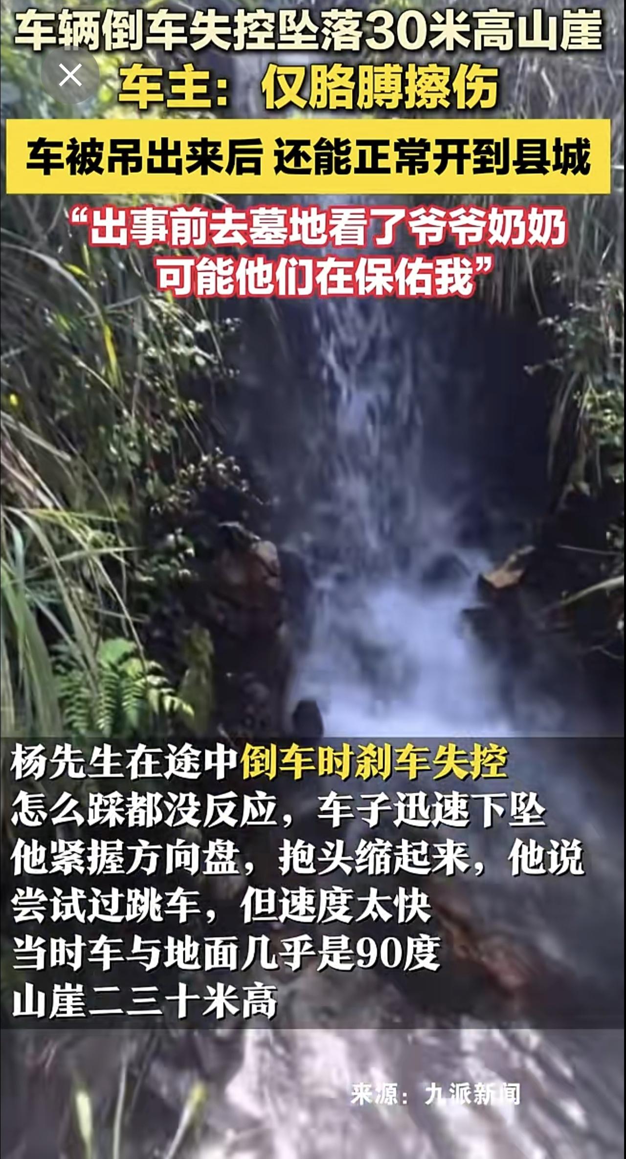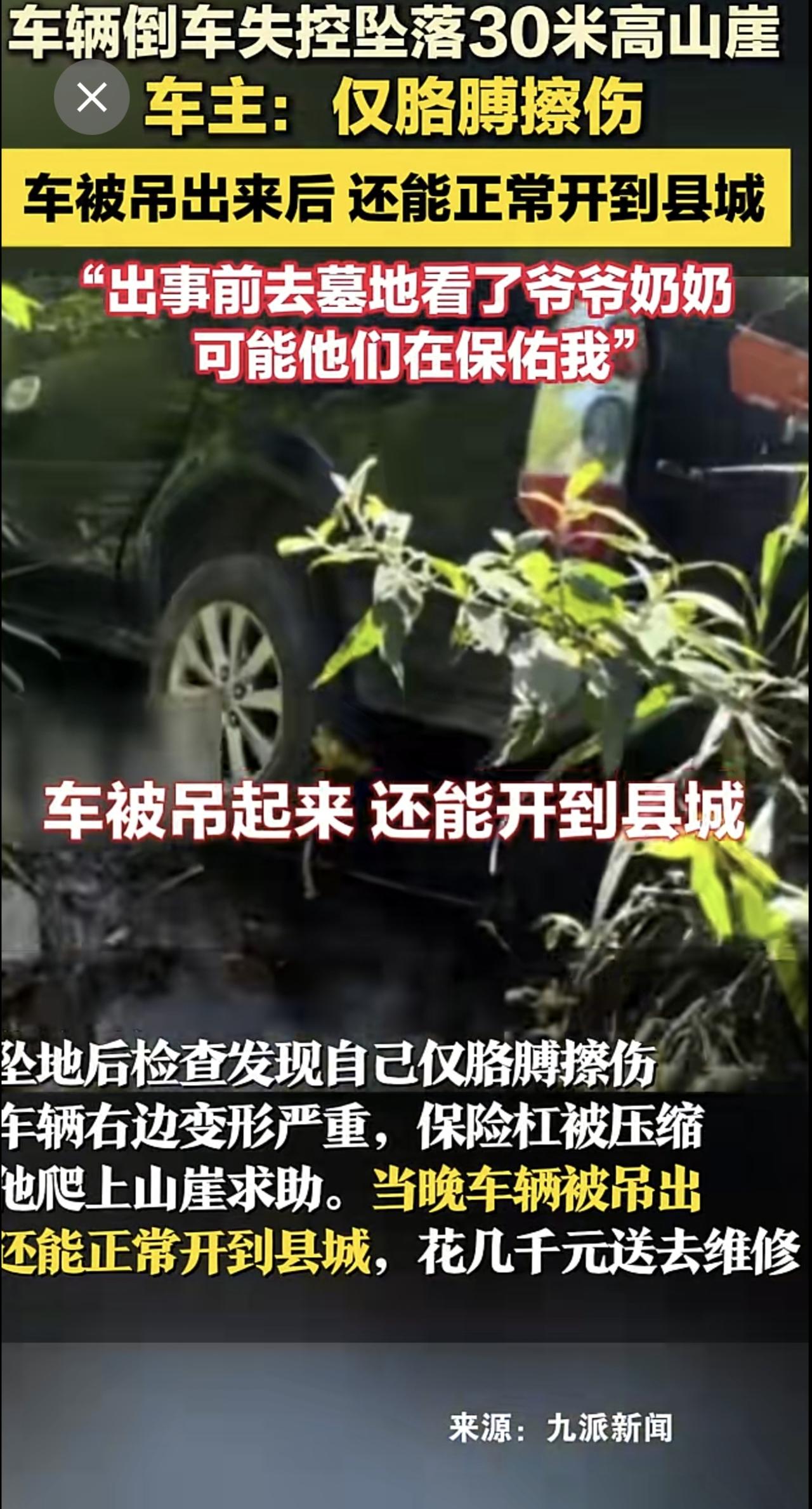 车辆倒车失控坠落30米高山崖,车主:仅胳膊擦伤,车被吊出来后 还能正常开到县城“出事前去墓地看了爷爷奶奶,可能他们在保佑我”