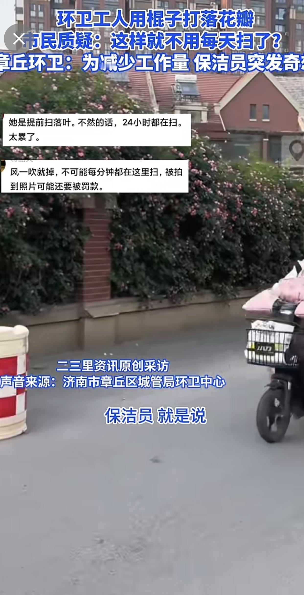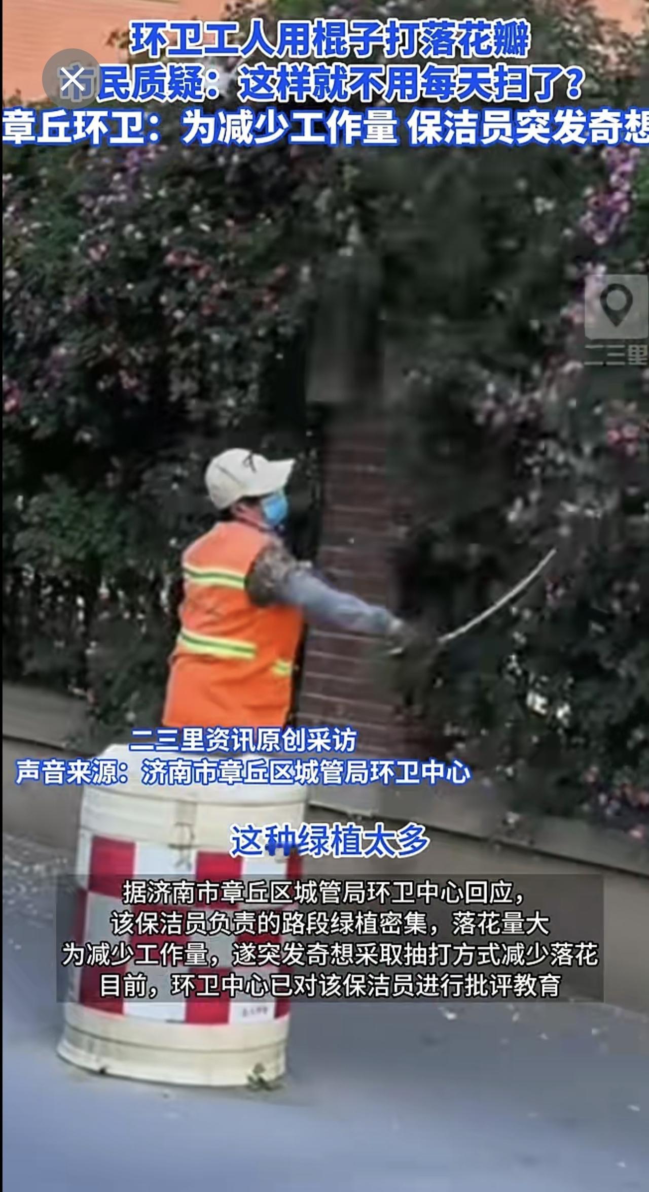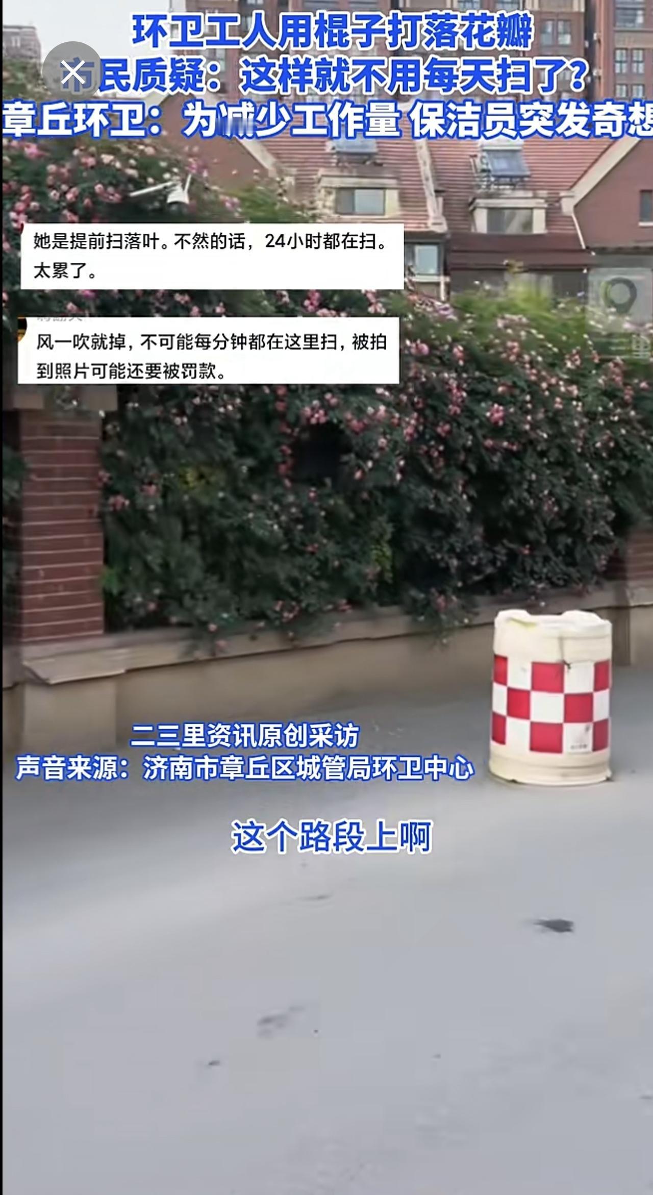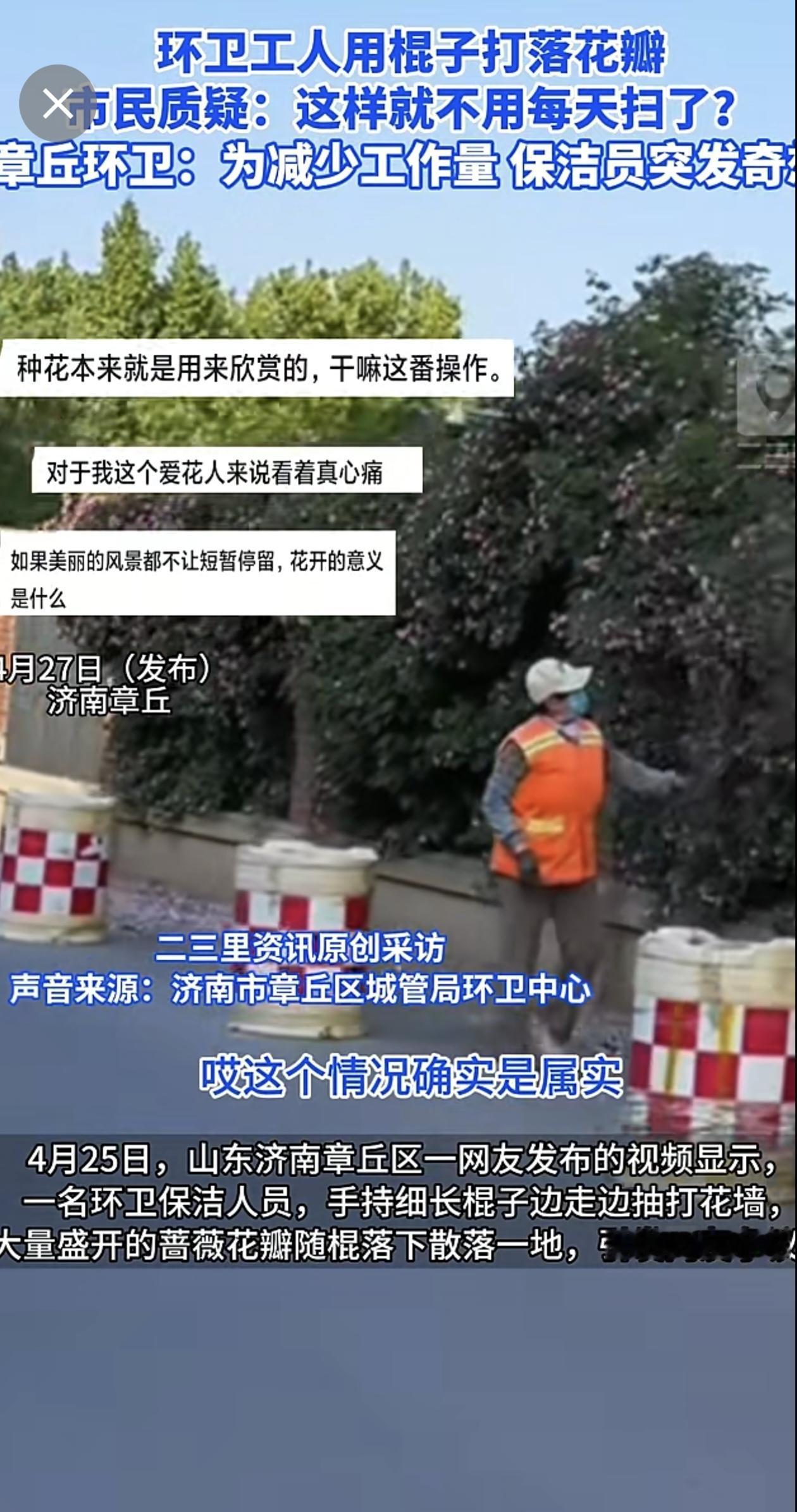 济南章丘一蔷薇花墙花瓣遭环卫工打落,官方回应:个人为减少工作量,已批评教育