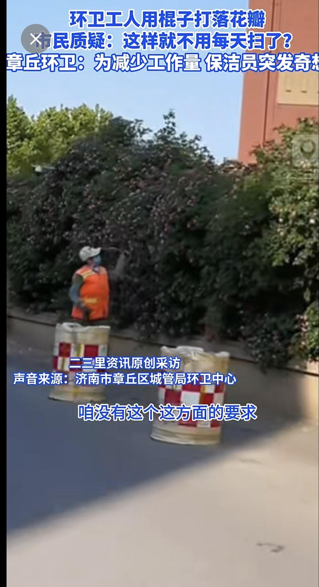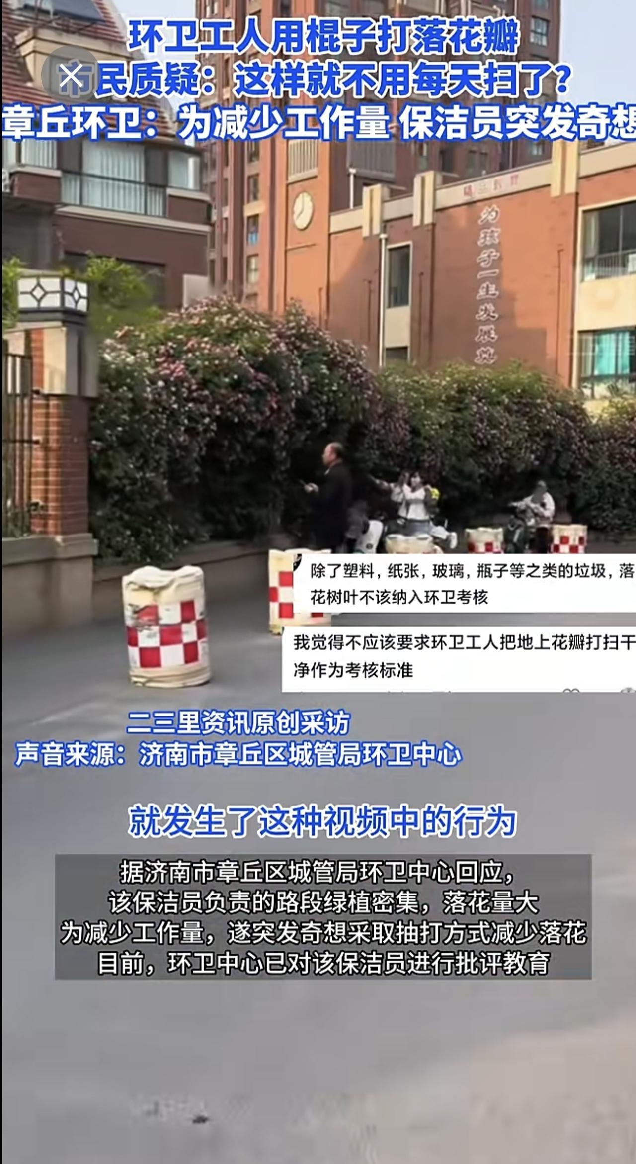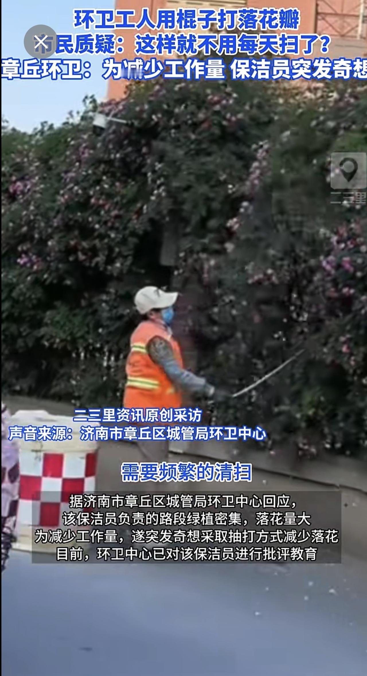 济南章丘一蔷薇花墙花瓣遭环卫工打落,官方回应:个人为减少工作量,已批评教育