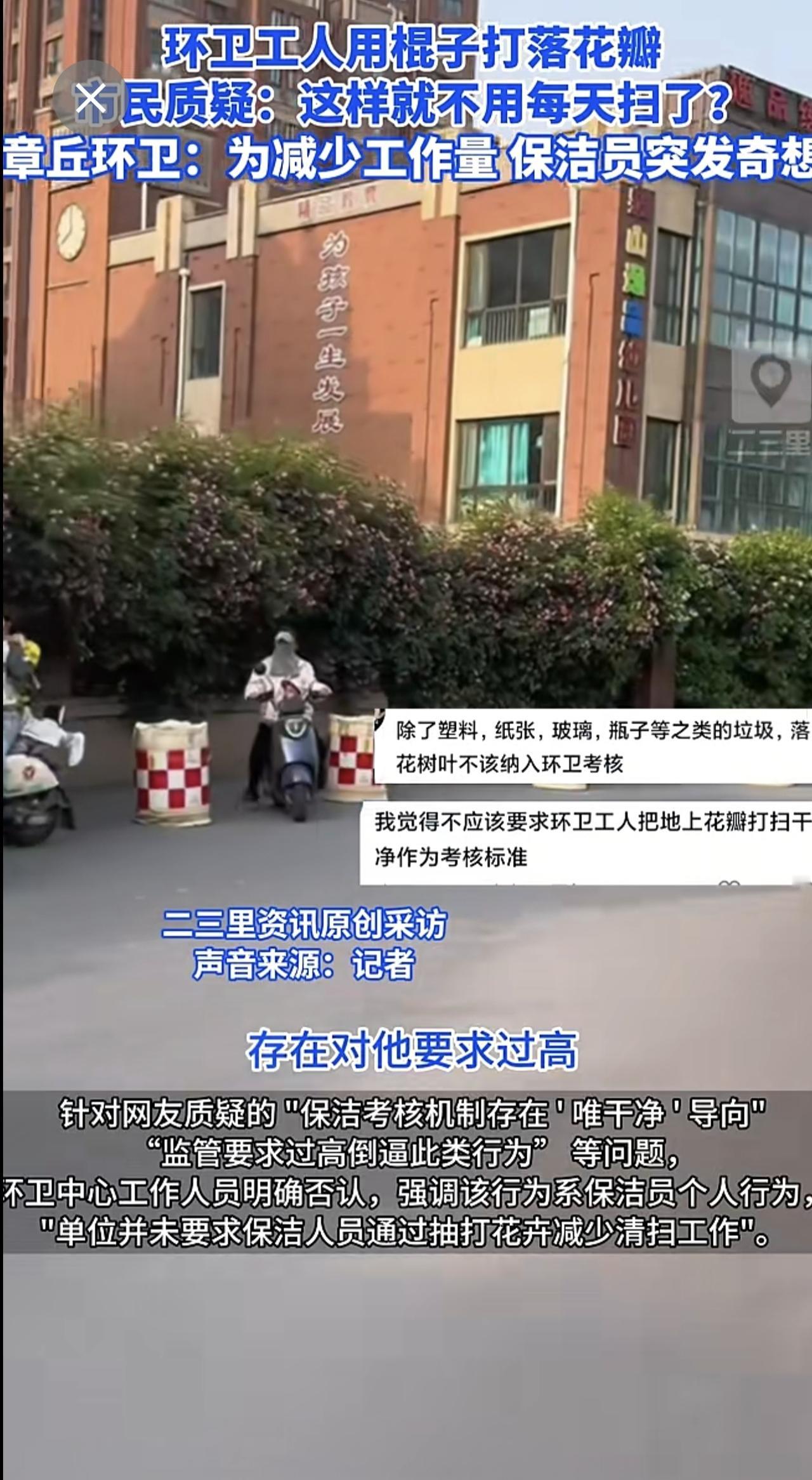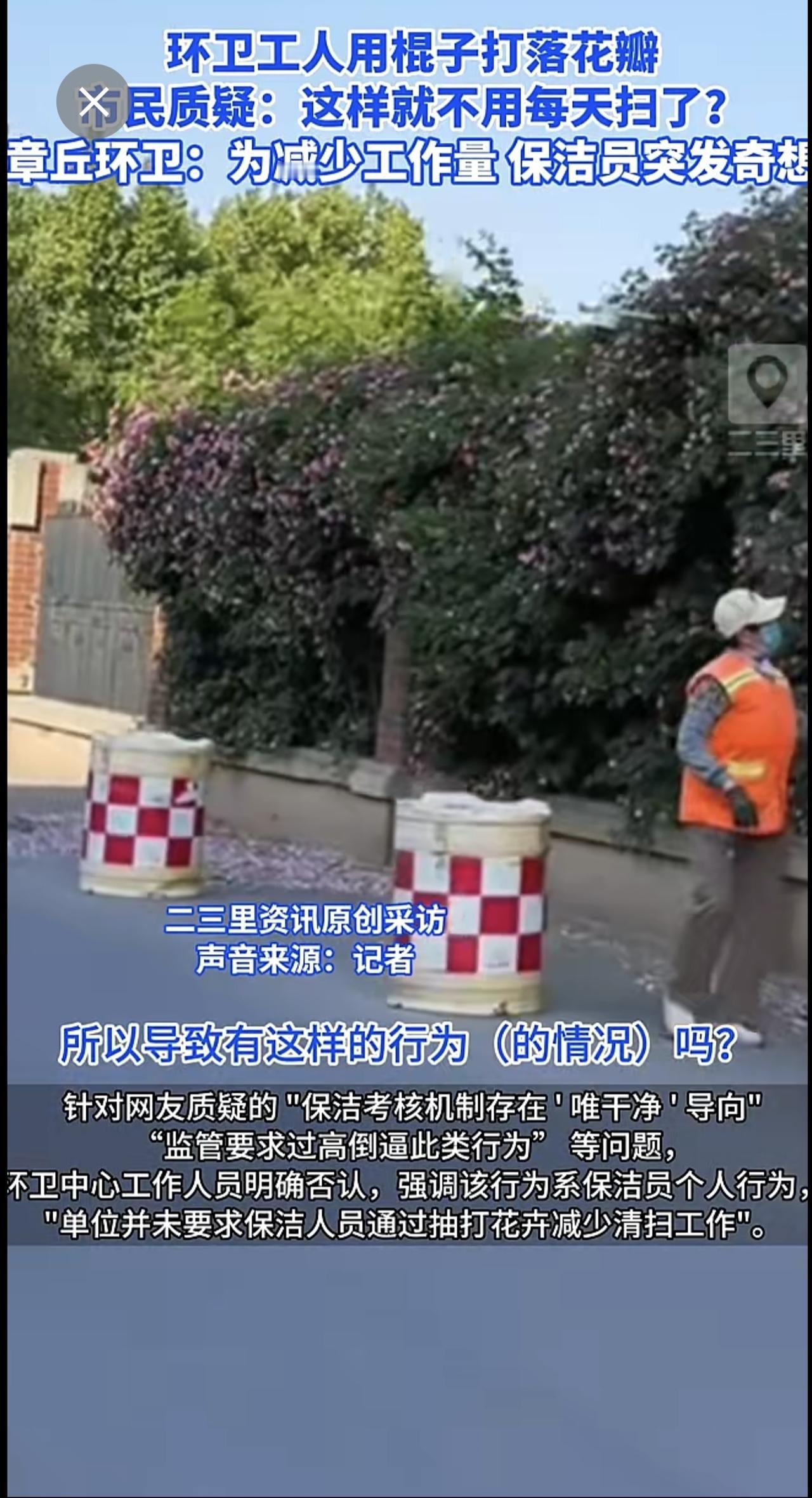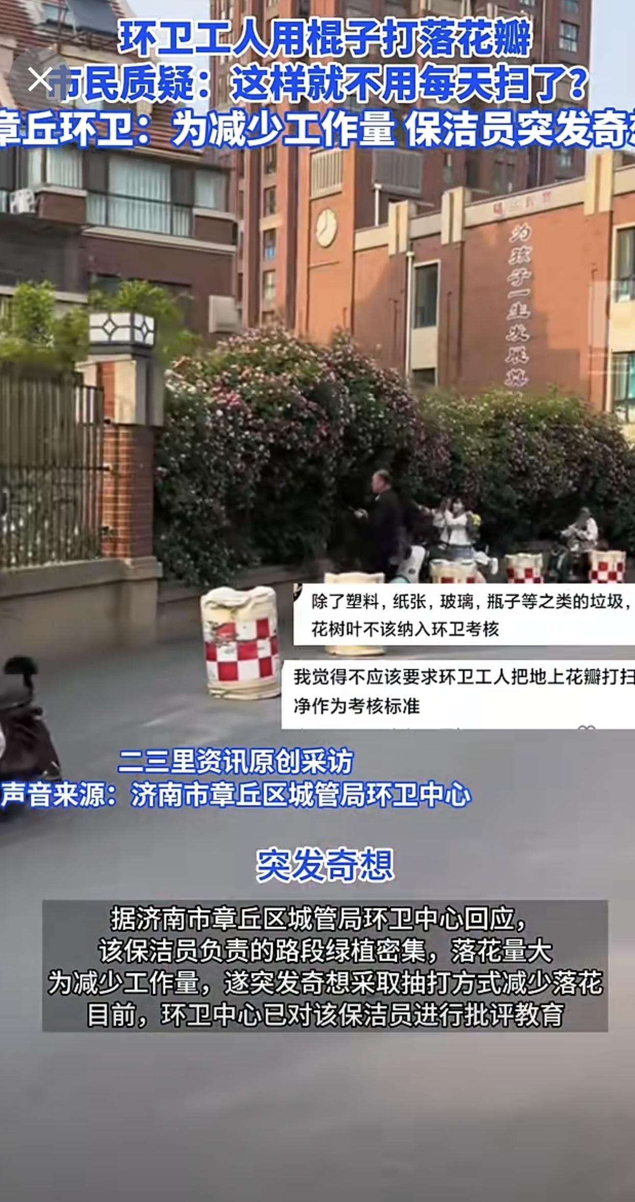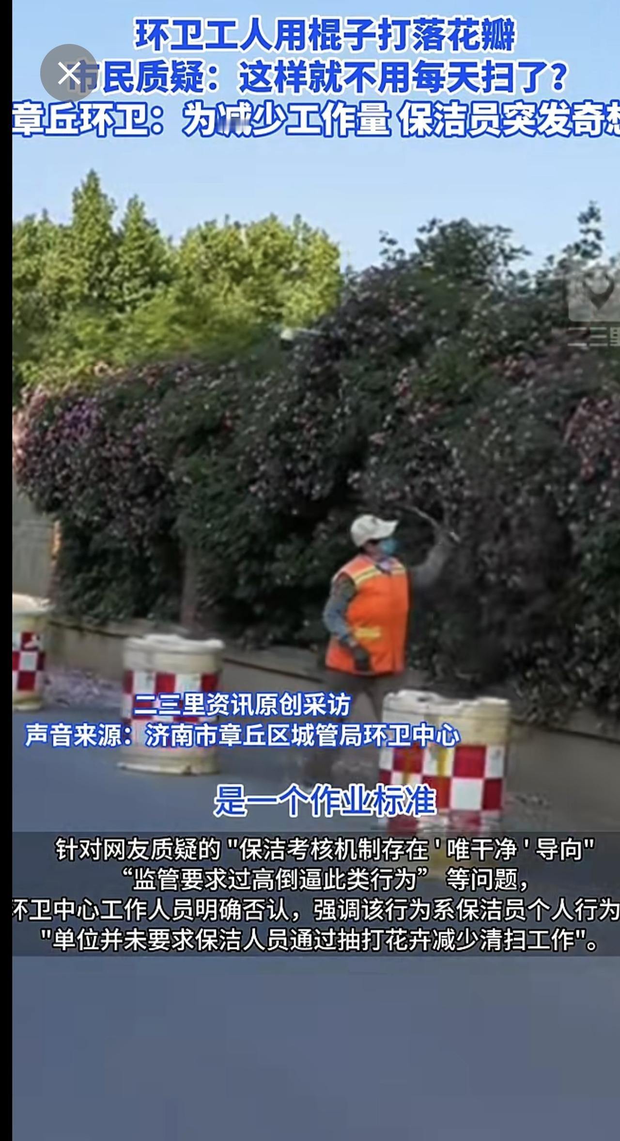 济南章丘一蔷薇花墙花瓣遭环卫工打落,官方回应:个人为减少工作量,已批评教育