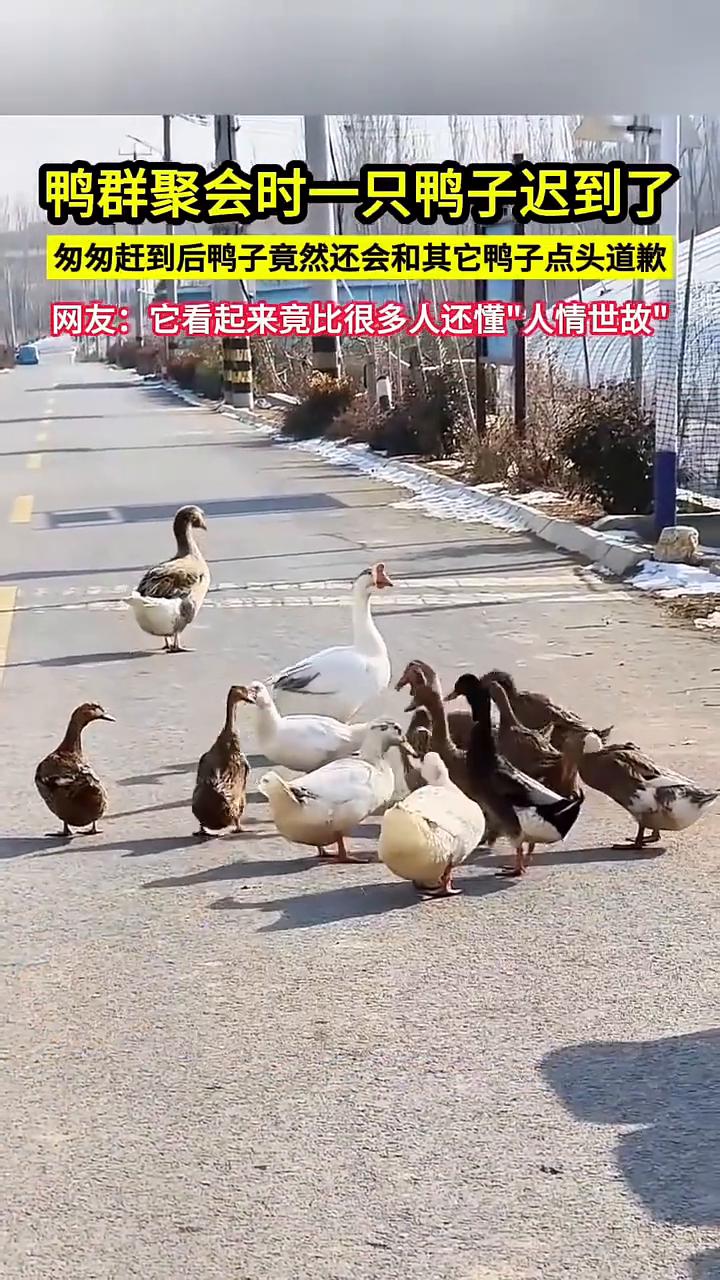 鸭群聚会时一只鸭子迟到了,匆匆赶到后鸭子竟然还会和其它鸭子点头道歉。网友:它看起来竟比很多人还懂"人情世故"。 这么潇洒的步伐,一看就是没有房贷和车贷!网友:大鹅混进了鸭群是在负责带班吗?真是一只"社会鸭",竟然跟同伴点头示意!