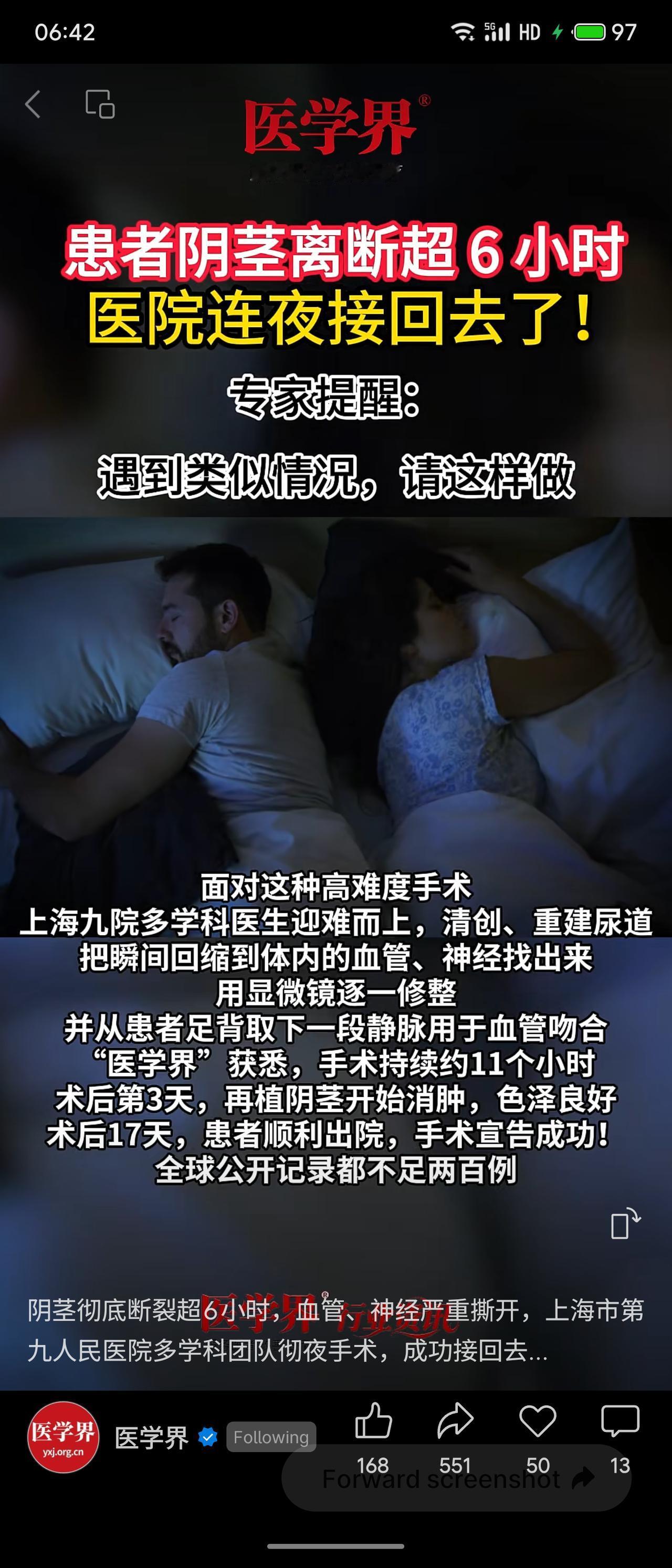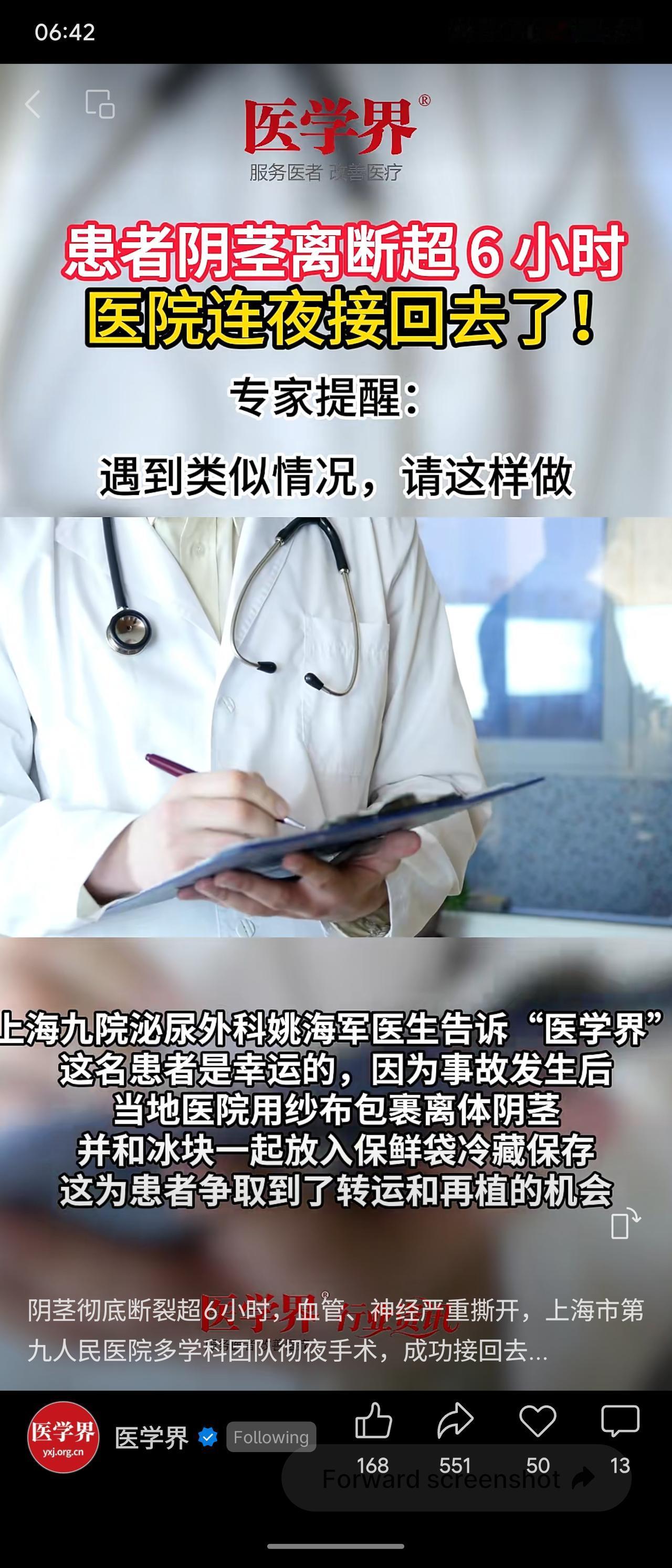 源自医学界新闻,一起阴茎完全离断超6小时的罕见病例(全球不足200例),由上海第九人民医院多学科团队连夜奋战11小时成功再植。术中清创、重建尿道,借助显微镜吻合血管神经,并取足背静脉桥接,术后17天顺利出院。该案例充分彰显了上海九院在显微外科与泌尿修复领域的顶尖实力——尤其面对超长时间“热缺血”器官,仍能精准重建血运,体现了国内领先的急重症创伤救治水平和专科特色。