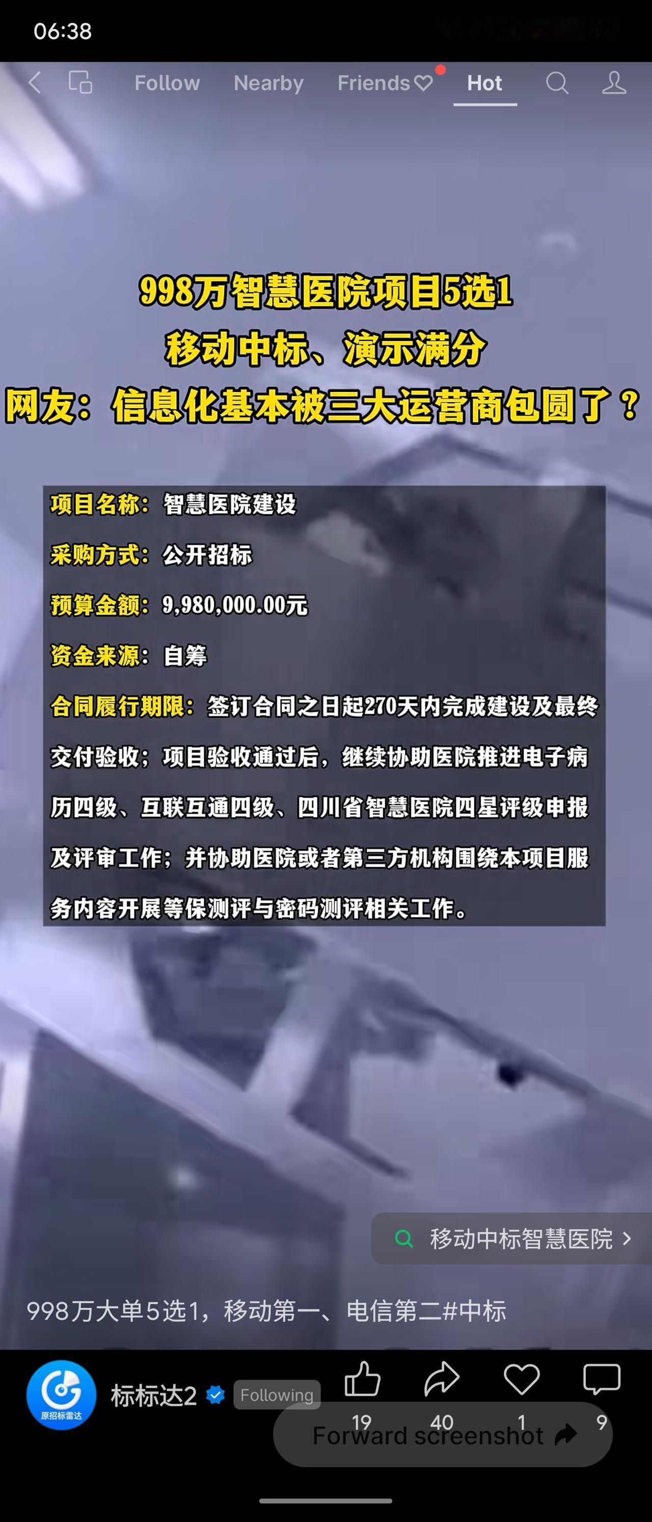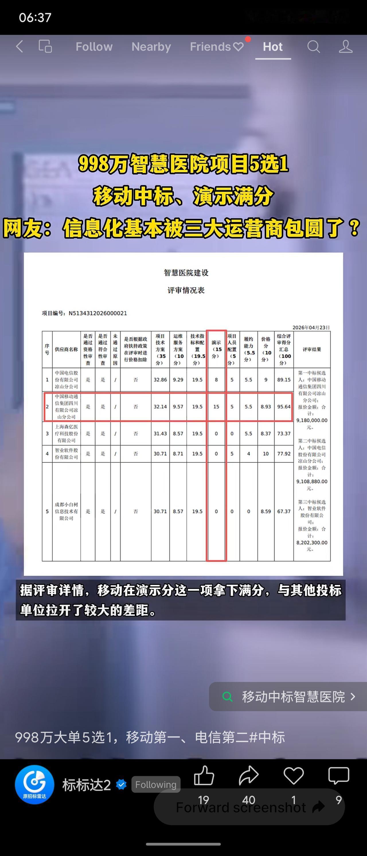 据招标网公开消息,昭觉县某医院智慧该智慧医院医院项目发布中标信息,该项目预算998万元,中国移动以918万元中标,评审总得分95.64分,其中演示环节拿下满分,远超电信(89.15分)及其他三家专业厂商。项目需在270天内完成建设,并协助医院通过电子病历四级、互联互通四级等评级。此次中标再次印证运营商在医疗信息化领域的强势地位——依托网络与集成能力,其方案演示和综合服务得分优势明显,传统医疗IT厂商面临挑战。