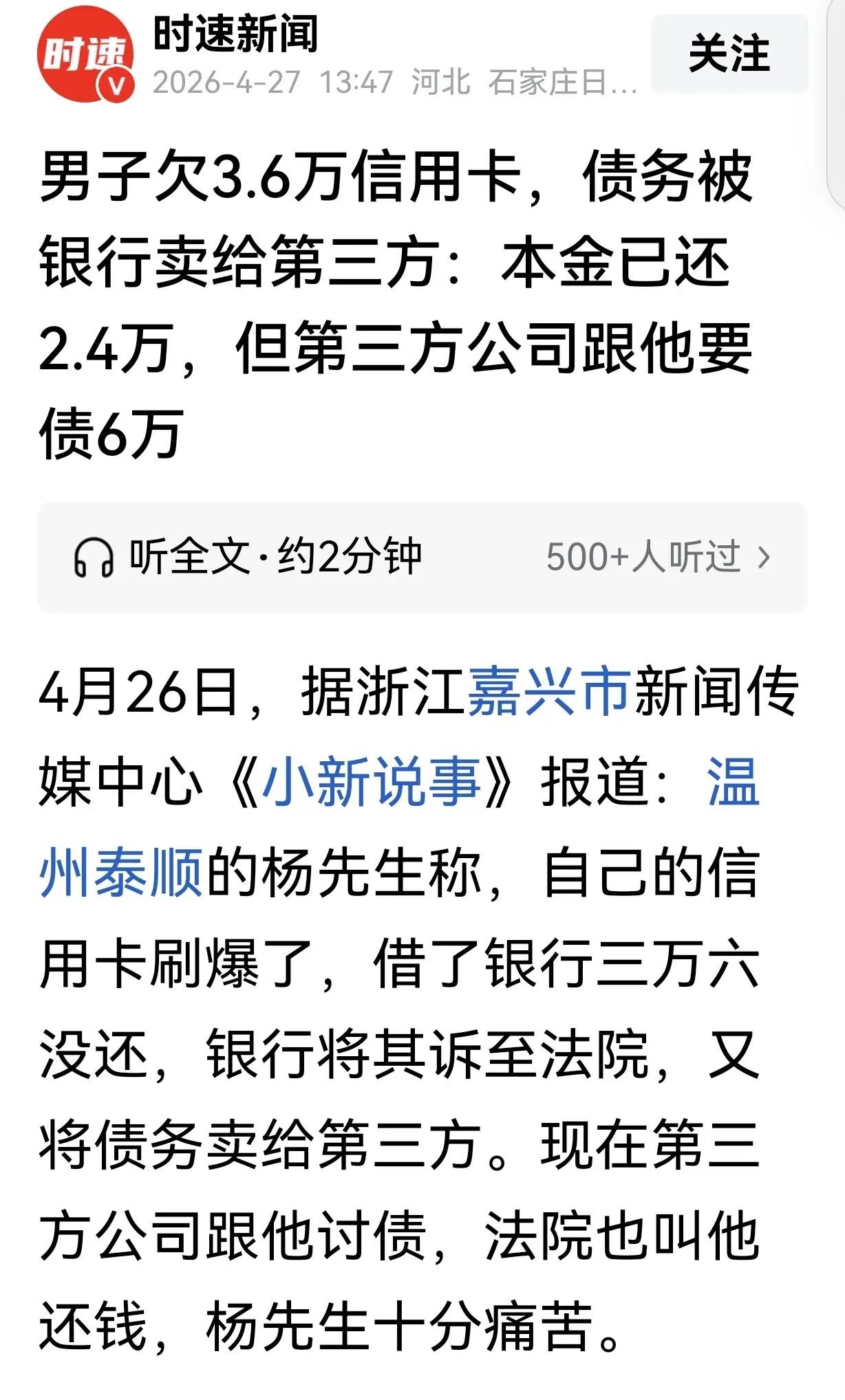 “离大谱了!”浙江温州,一男子欠3.6万信用卡还不上,被银行起诉,法院判他分24个月还,每月还1500元,可他还了2.4万时,发现还不进去了,银行:你的债务被我们卖给第3方公司了。但第3方公司跟他要债6万。男子崩溃了:法院那边让我继续还钱给银行,第3方公司要我还6万,这太奇葩了吧?