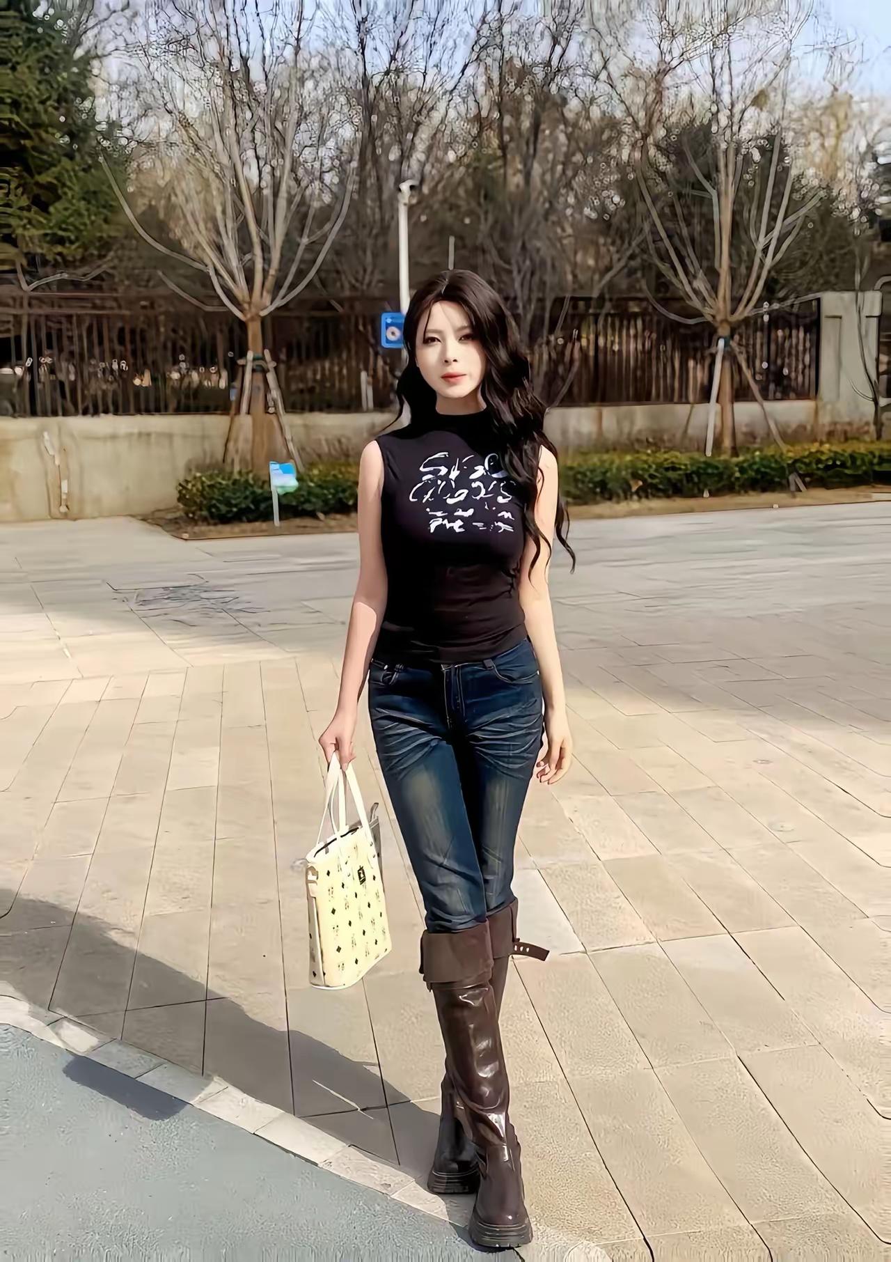 都市时尚女孩,黑色背心搭配牛仔裤,手拿粉色包包,享受夏日饮品。穿搭街拍