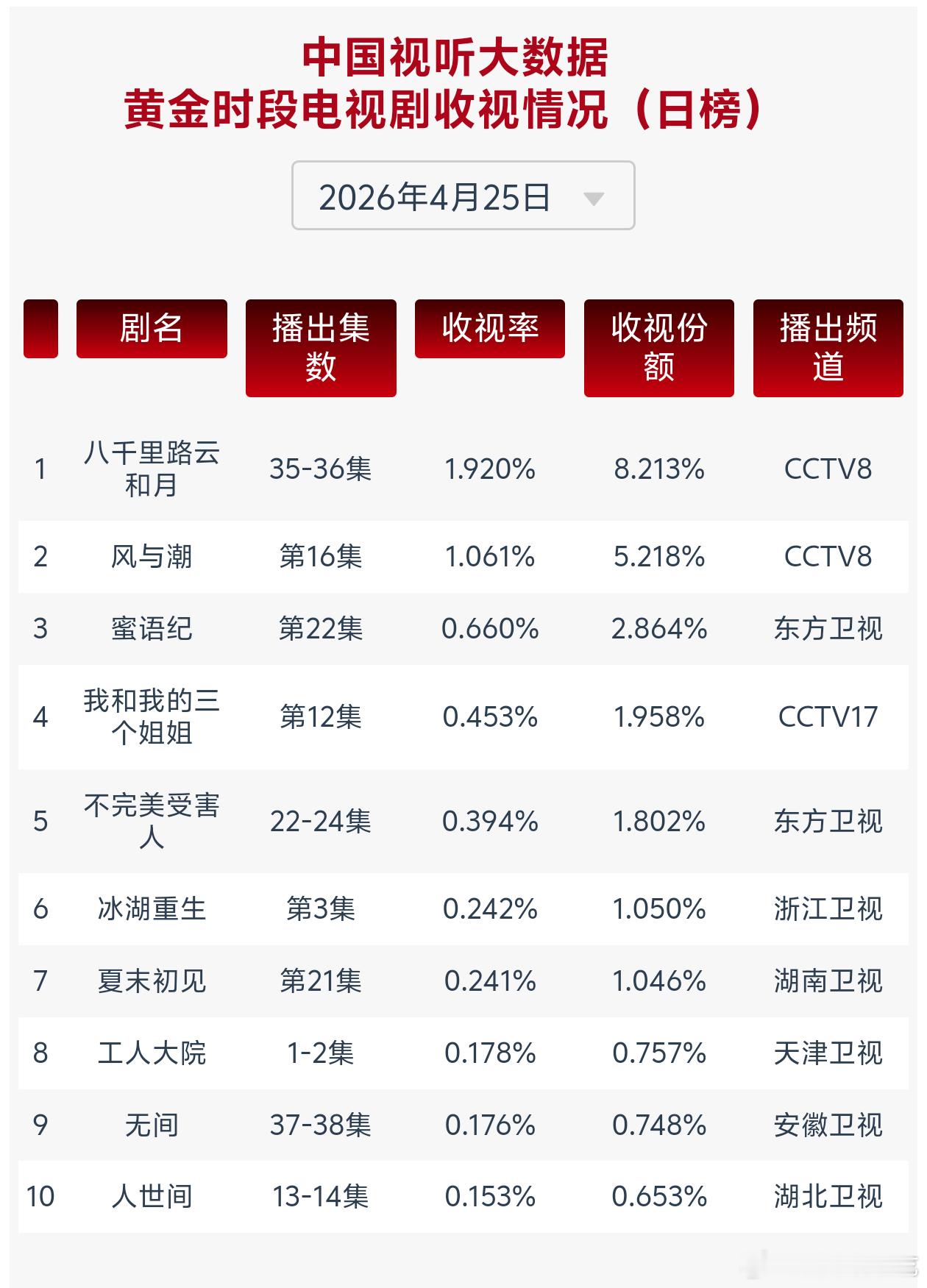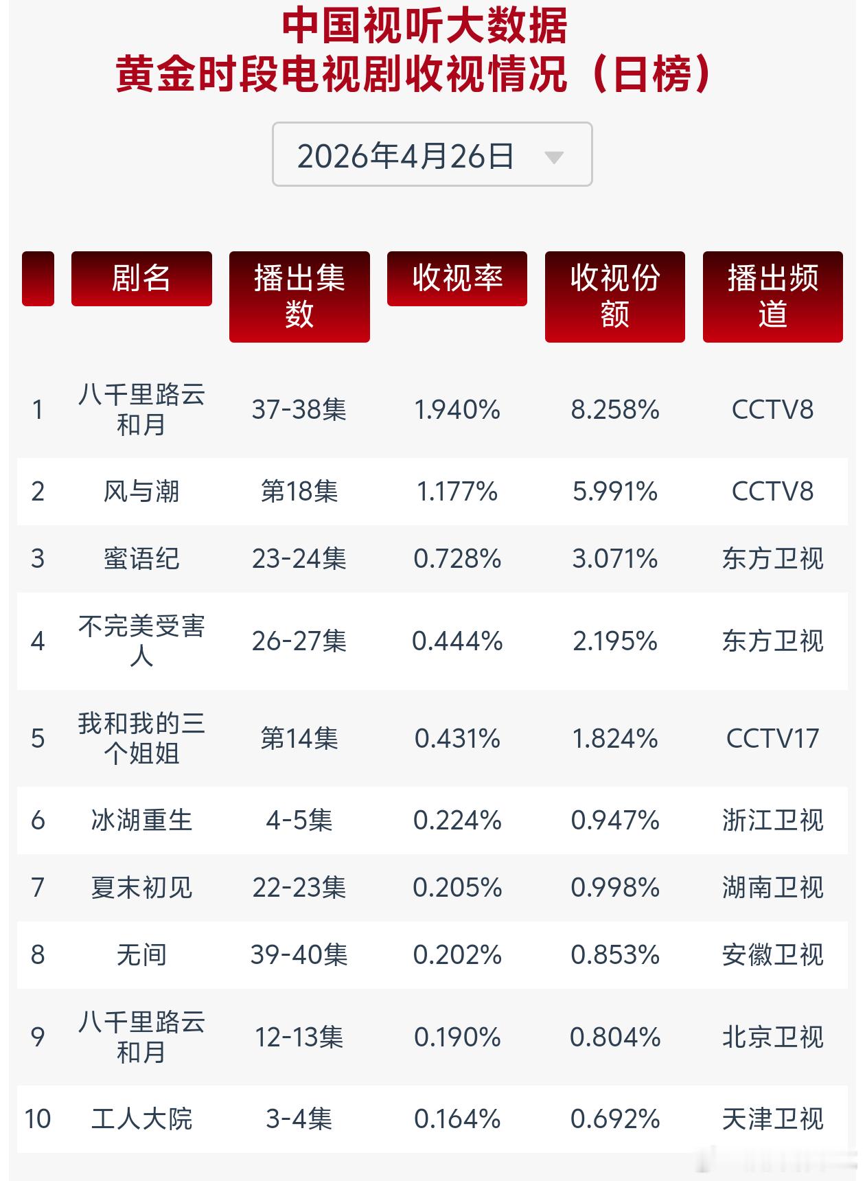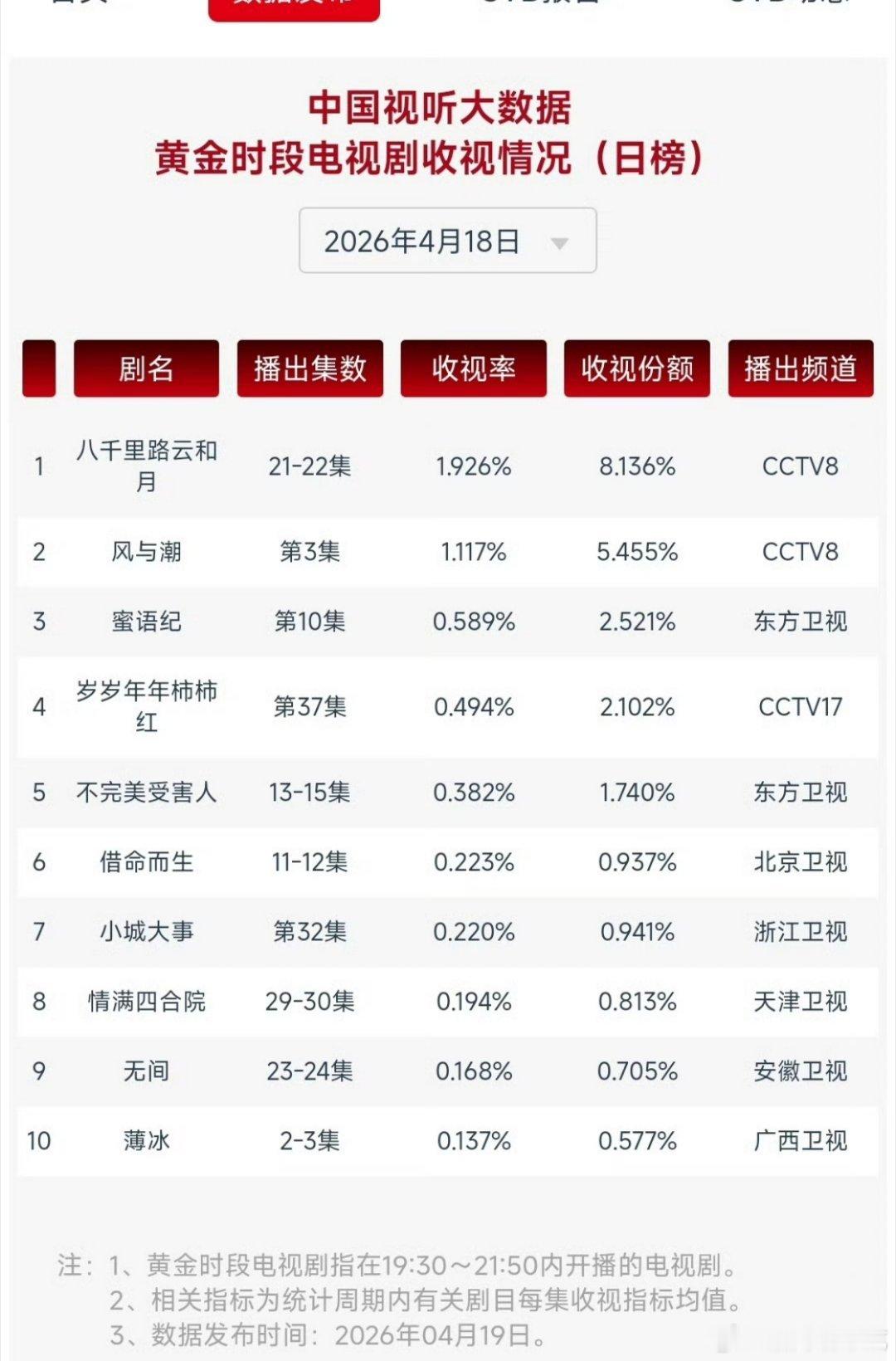 任嘉伦这边佳偶天成热播中工作日热度超休息日,那边风与潮多轮在央8次黄档重播cvb