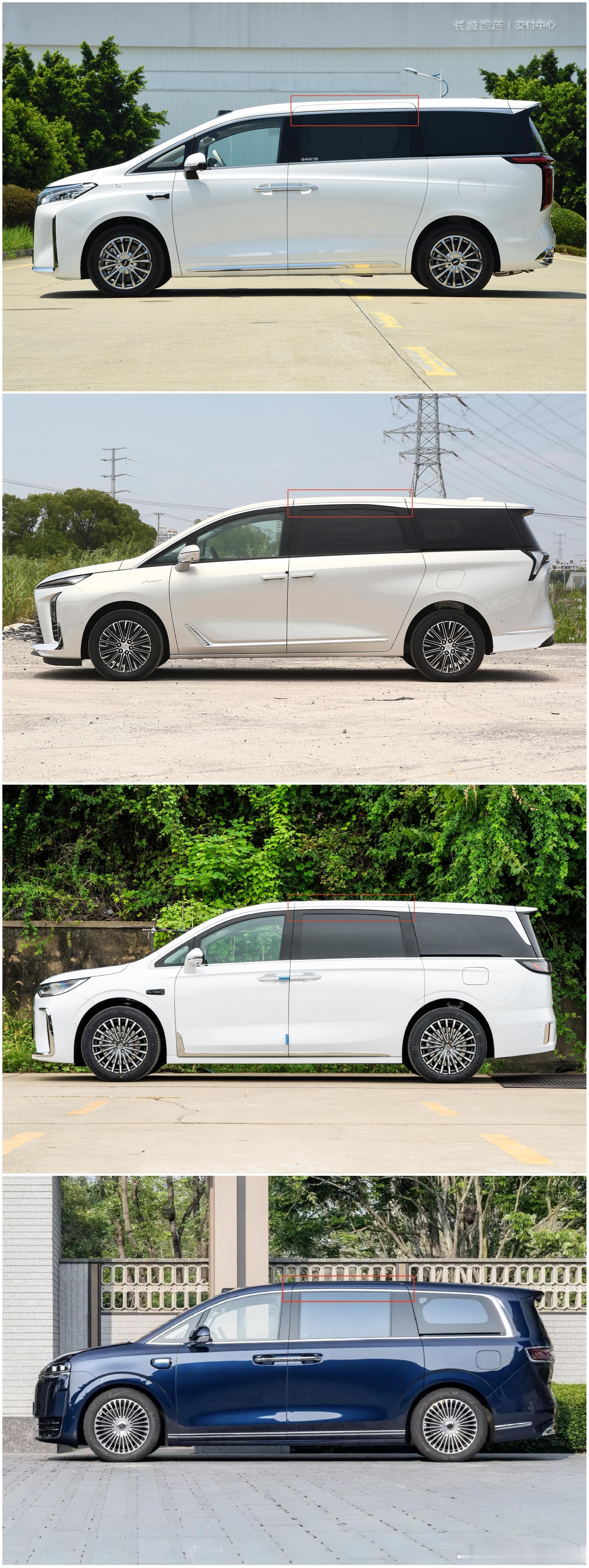 GL8、梦想家、高山、智界V9的侧滑门,上方都有一条缝突出,只有D9是无缝设计