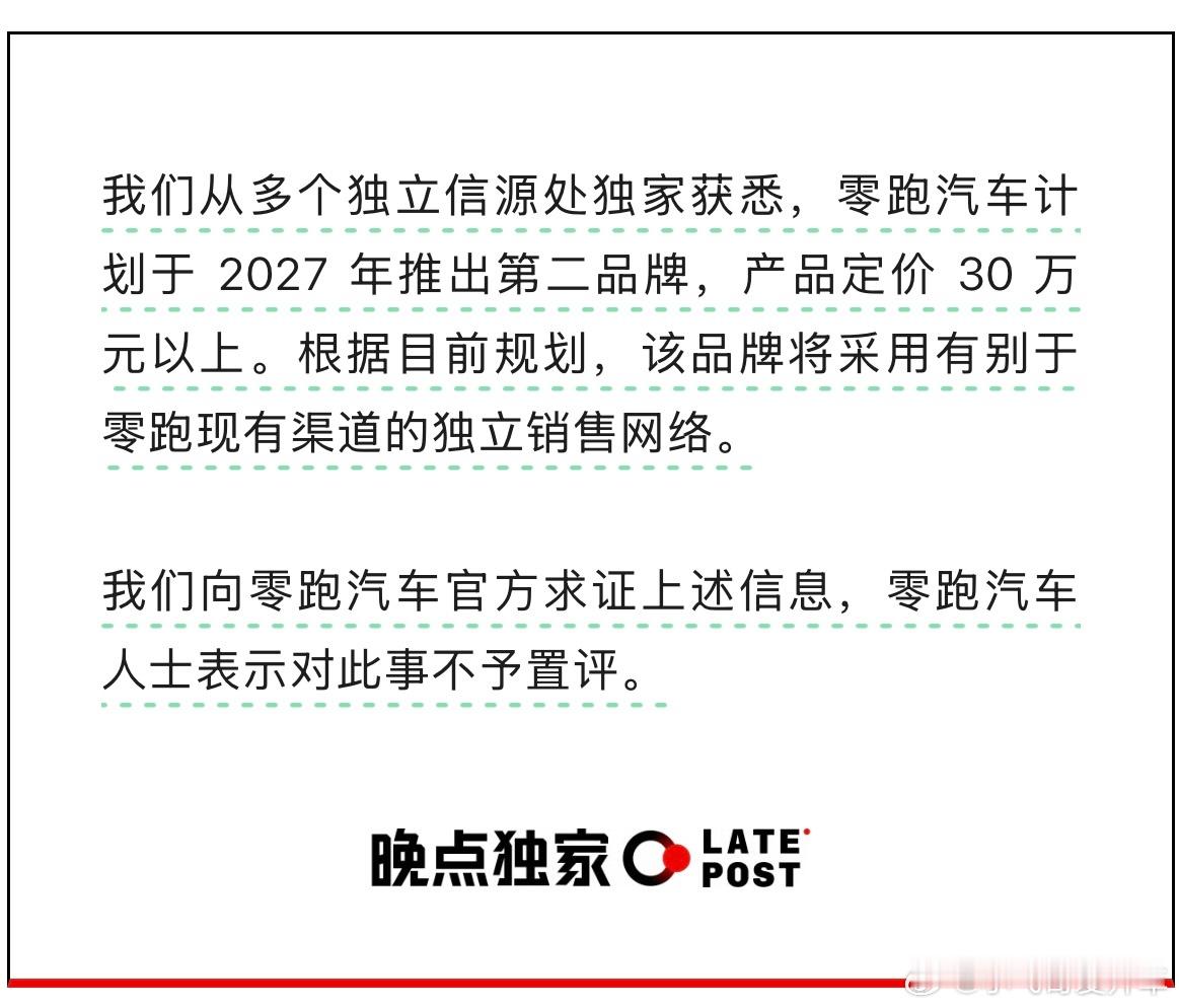 晚点根据多个独立信源处独家获悉,零跑汽车计划于2027年推出第二品牌,产品定价30万元以上。