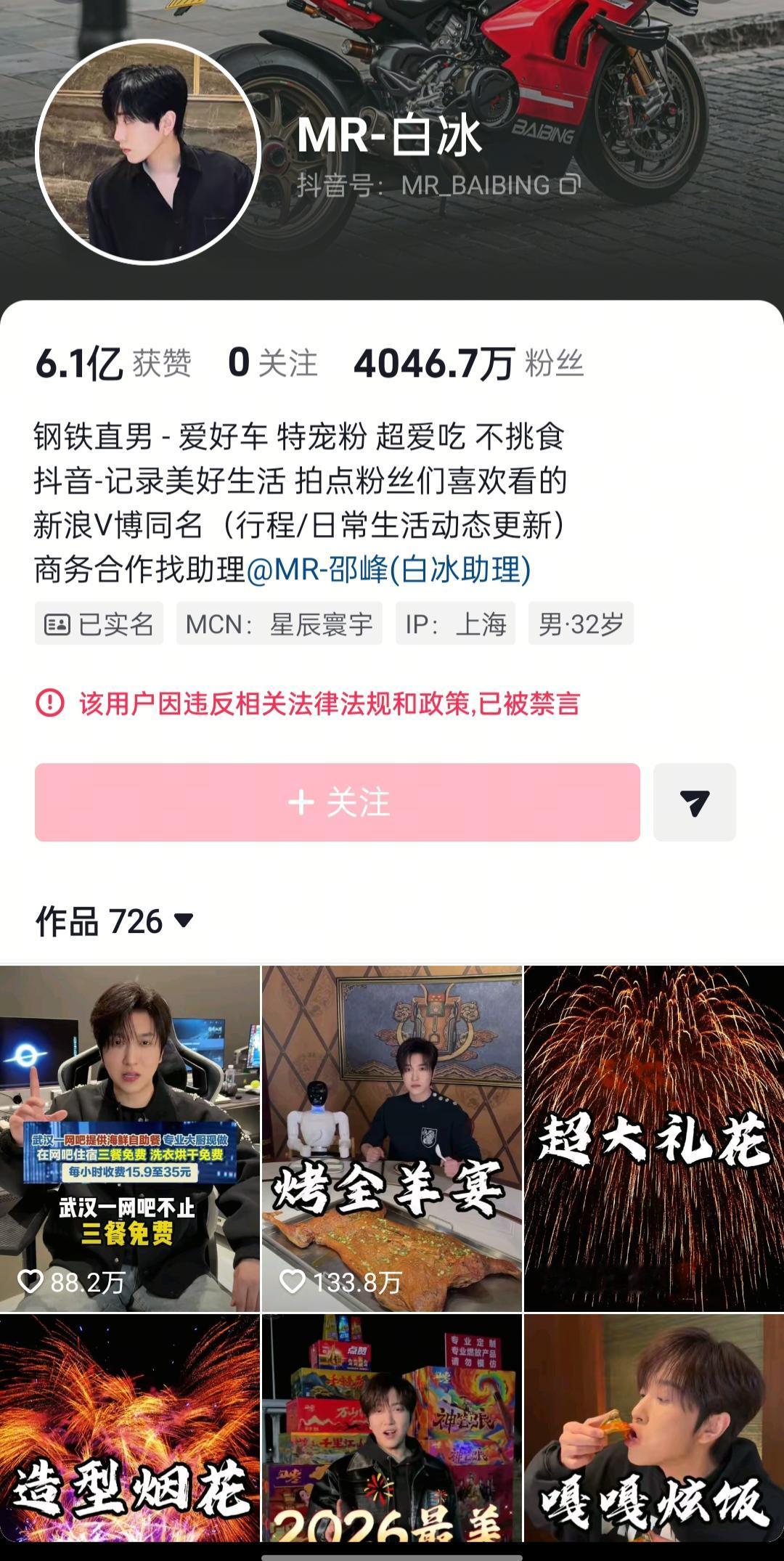 探店网红“白冰”账号已被禁言。 据央视网,网红白冰偷税被查,罚款,1891万元。 4月28日,白冰的个人抖音号上面已经显示被禁言,这是官方平台对网红“白冰”账号的处罚。 在这里还要说一句,依法纳税是每个公民应尽的义务。