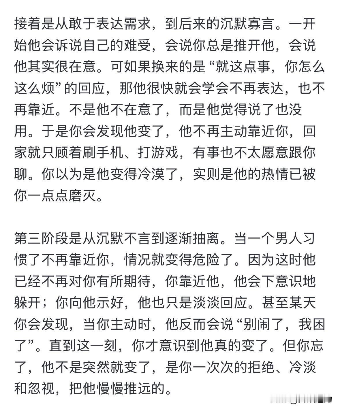 他不会大吵大闹,只会慢慢沉默,慢慢后退,慢慢收起所有的主动和偏爱。等到后来,你抱怨他冷漠寡言,下班只顾低头玩手机,心事不分享,情绪不沟通。