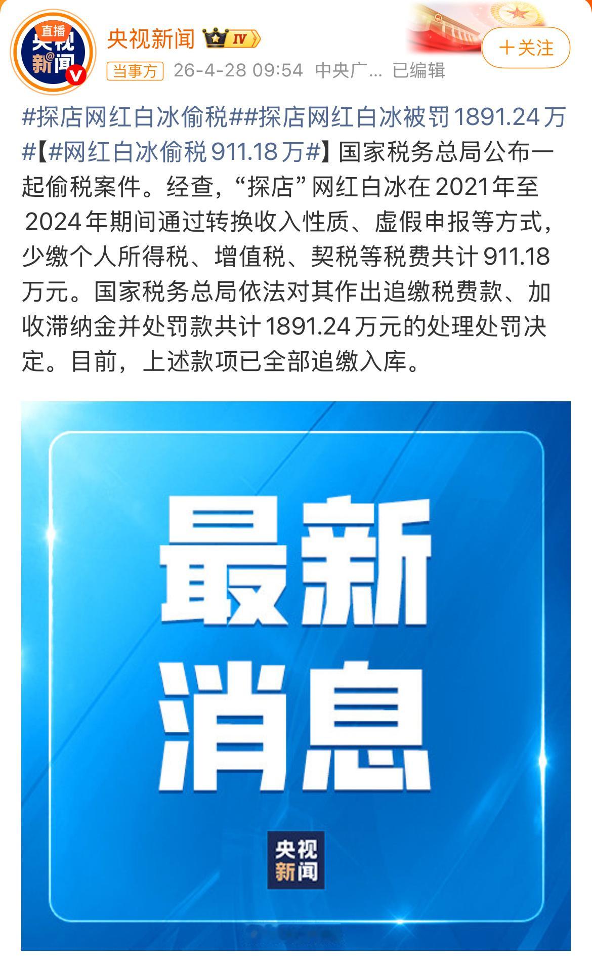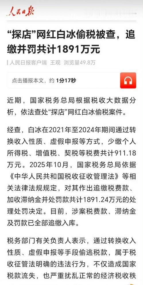 网红白冰偷税911.18万啊?三年偷税900多万,那得赚多少啊