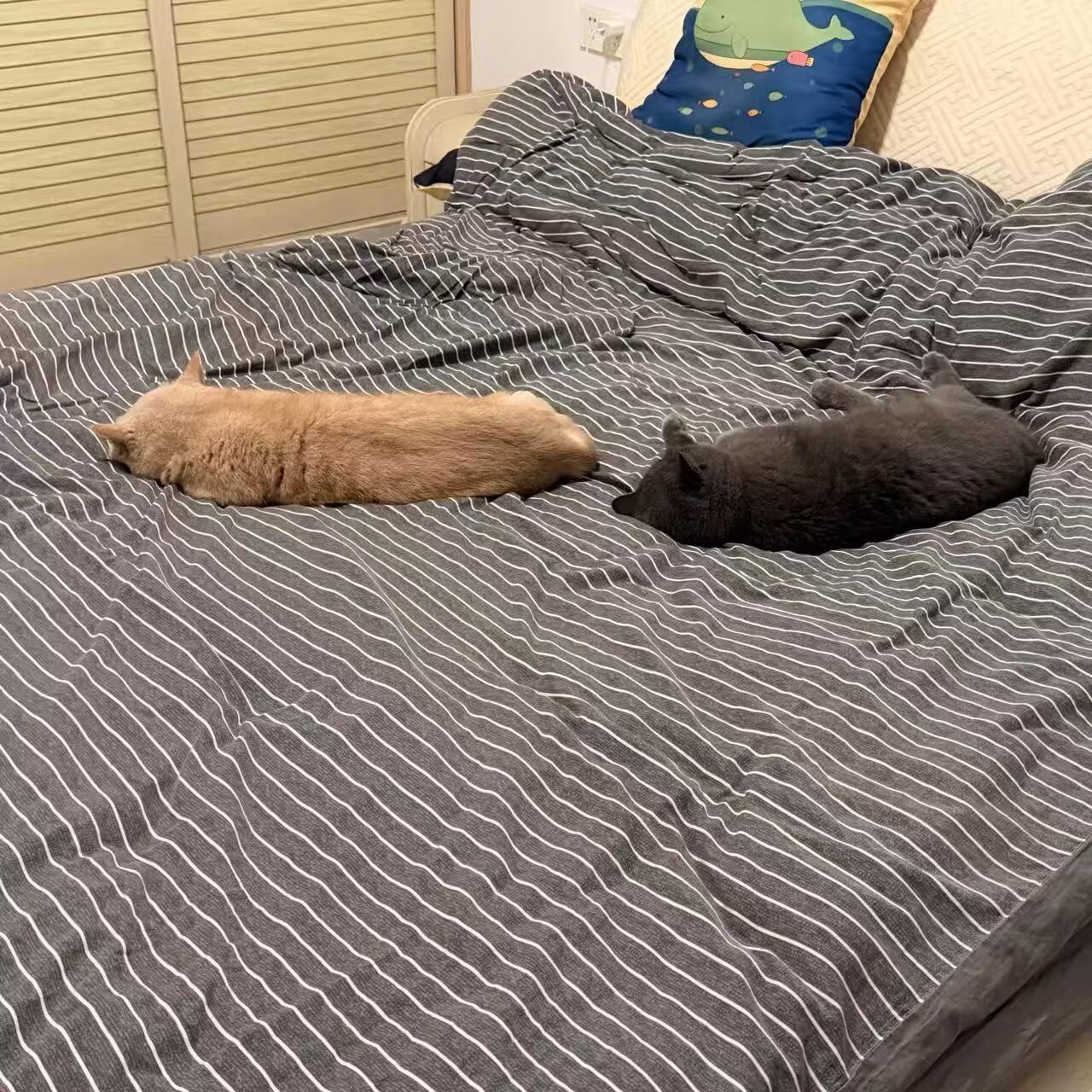 你们俩个小家伙把床位占完了,我怎么睡觉啊,你们不能占一边睡一起吗?给你们的主人我