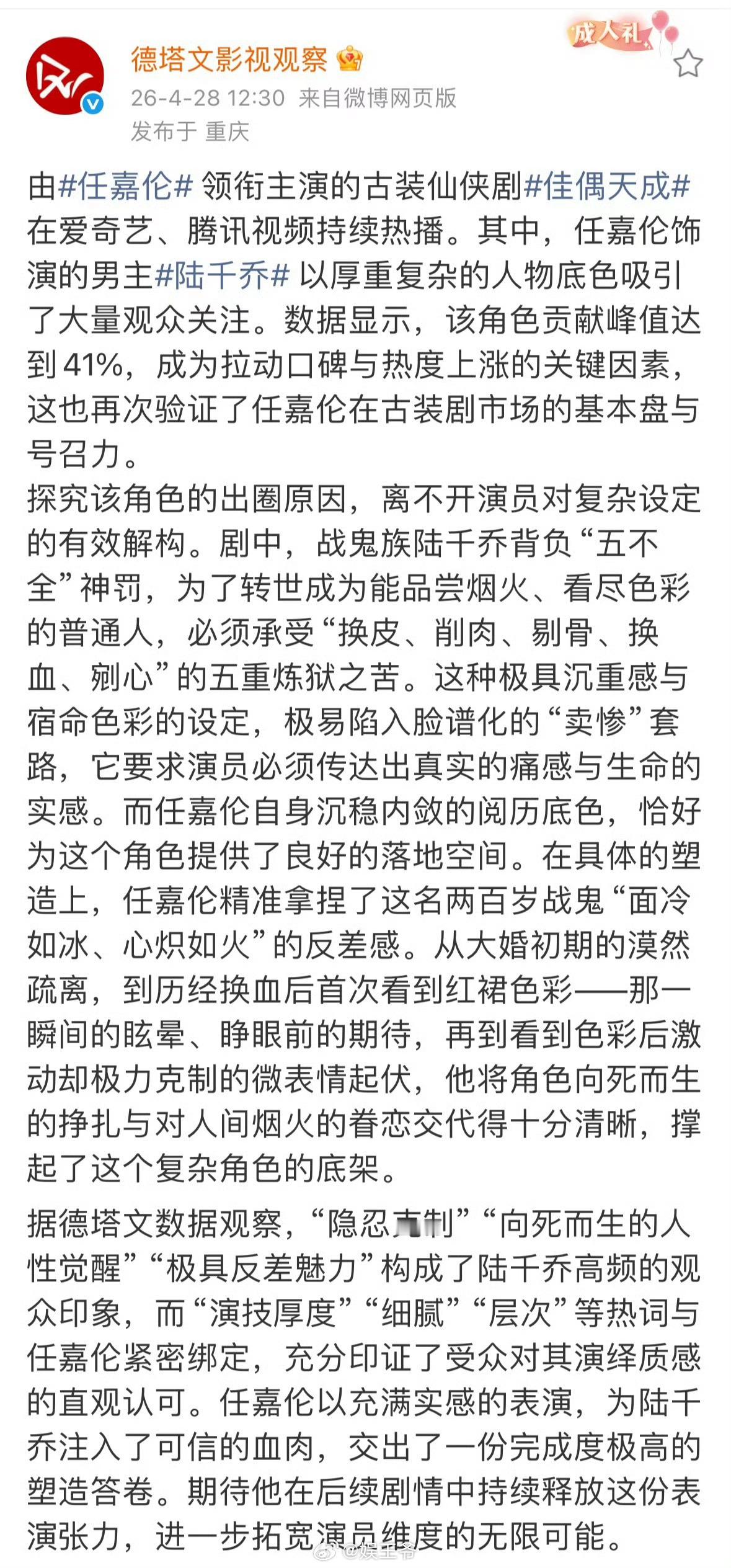 德塔文发长文夸任嘉伦演技 德塔文发长文夸任嘉伦演技:任嘉伦这次用《佳偶天成》中的陆千乔证明了,他不仅能驾驭复杂的仙侠设定更能用扎实的演技去“解构”苦难,把角色的“厚度”和“血肉”一点点填满…德塔文夸任嘉伦演技