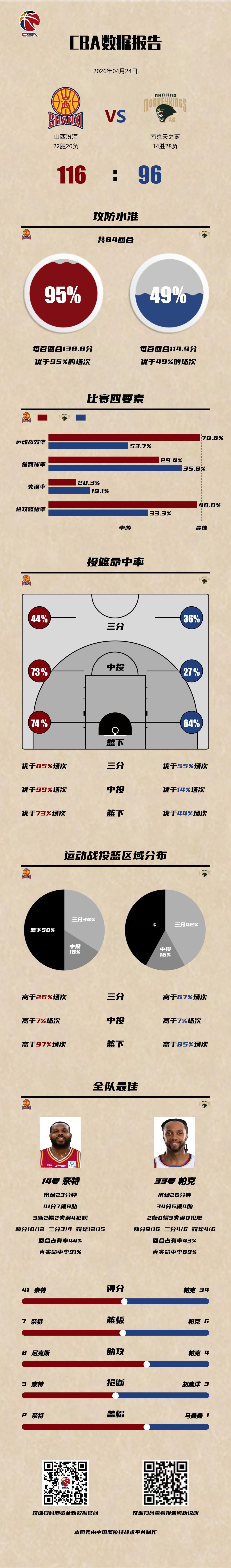 山西汾酒:奈特41分7篮板8助攻3抢断2盖帽,法耶20分7篮板3抢断,张宁14分3篮板;