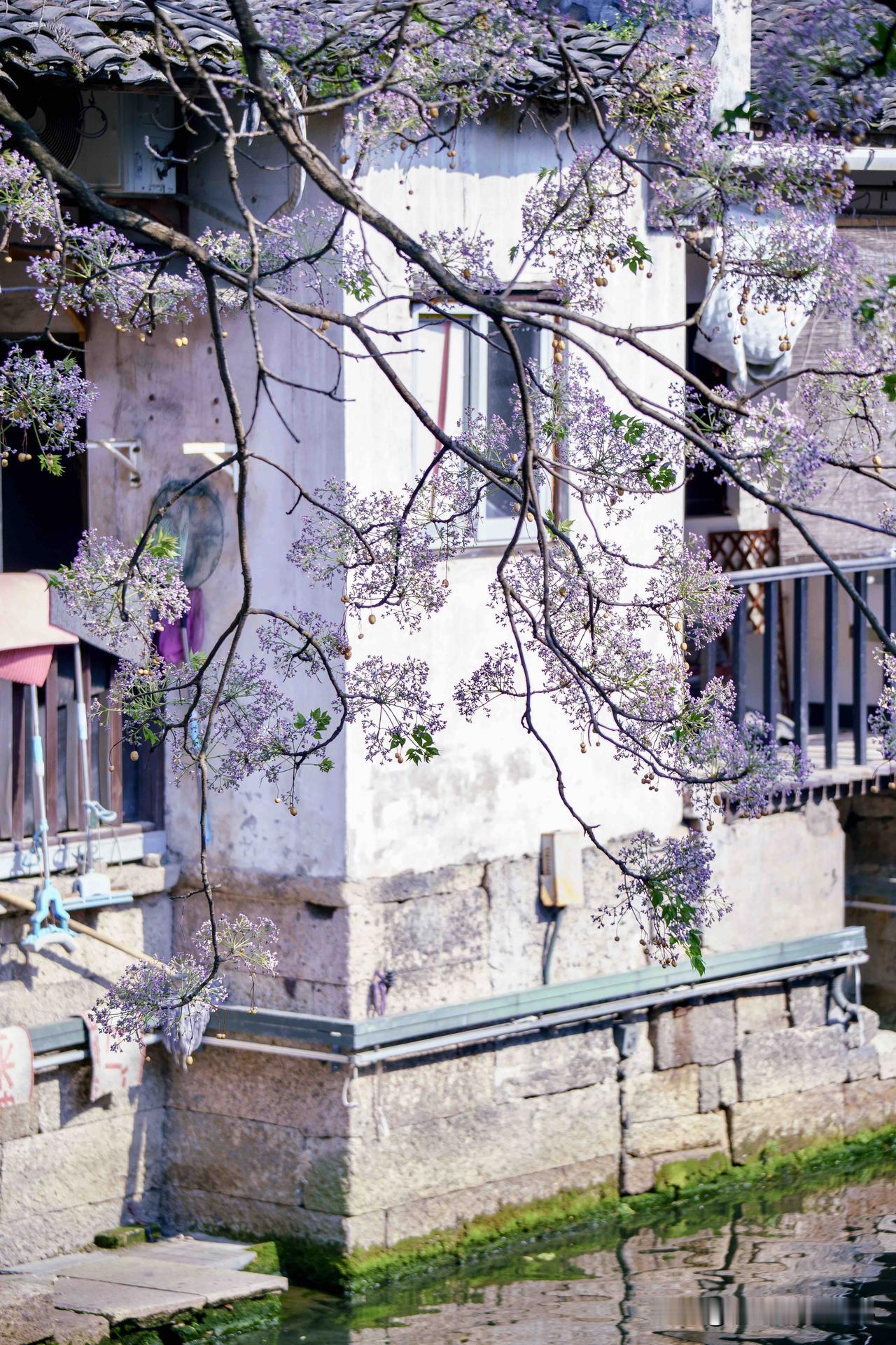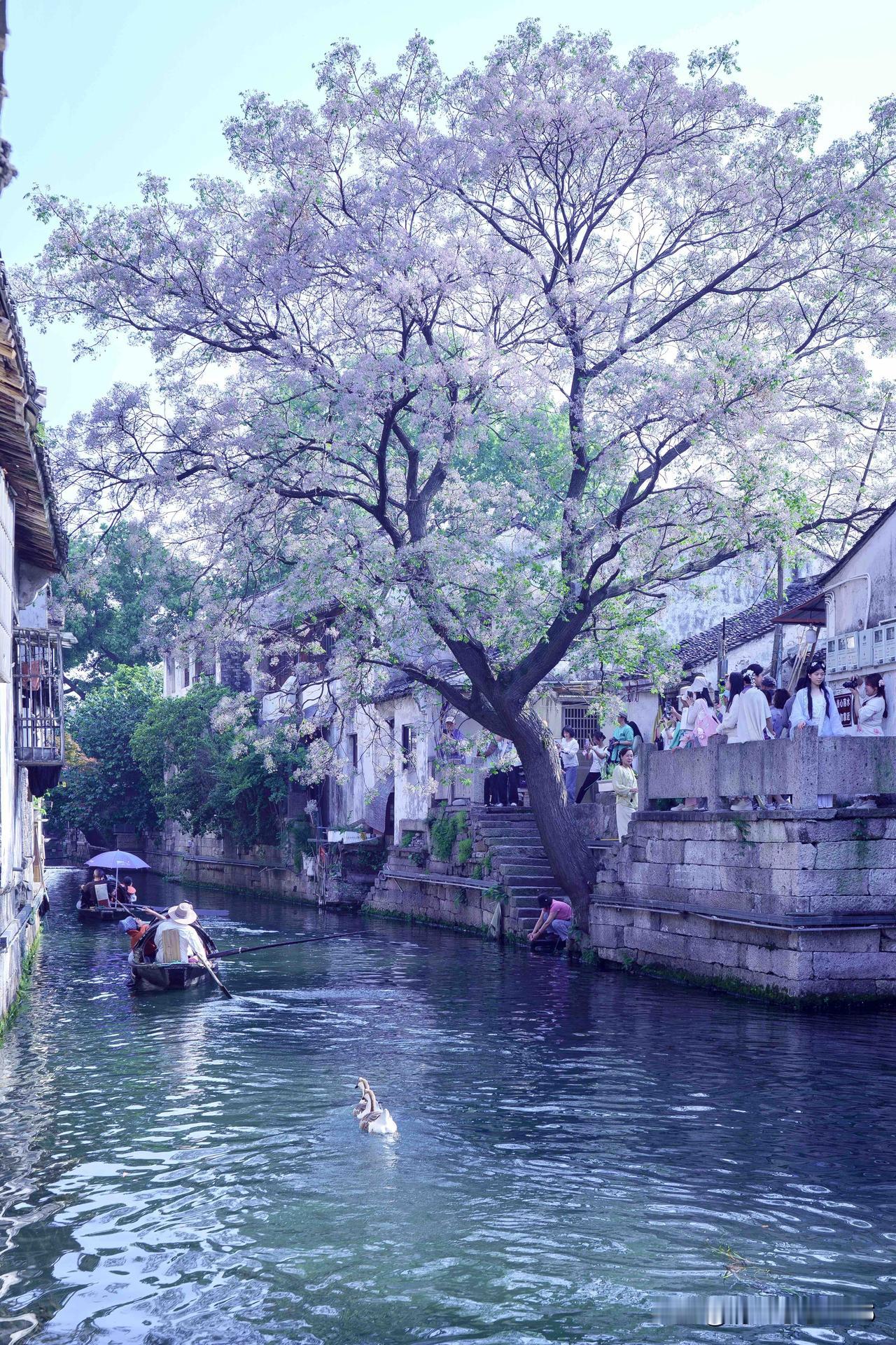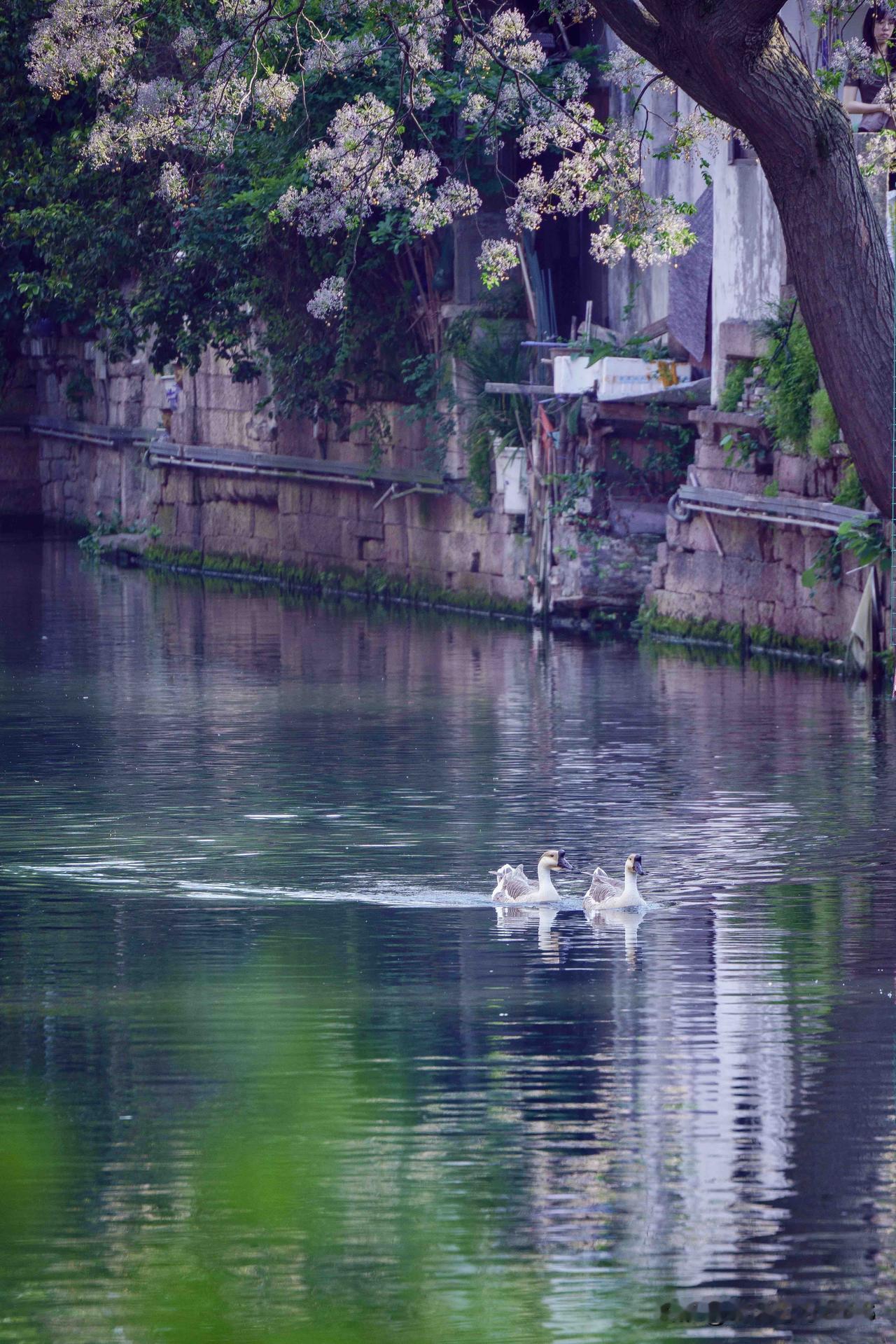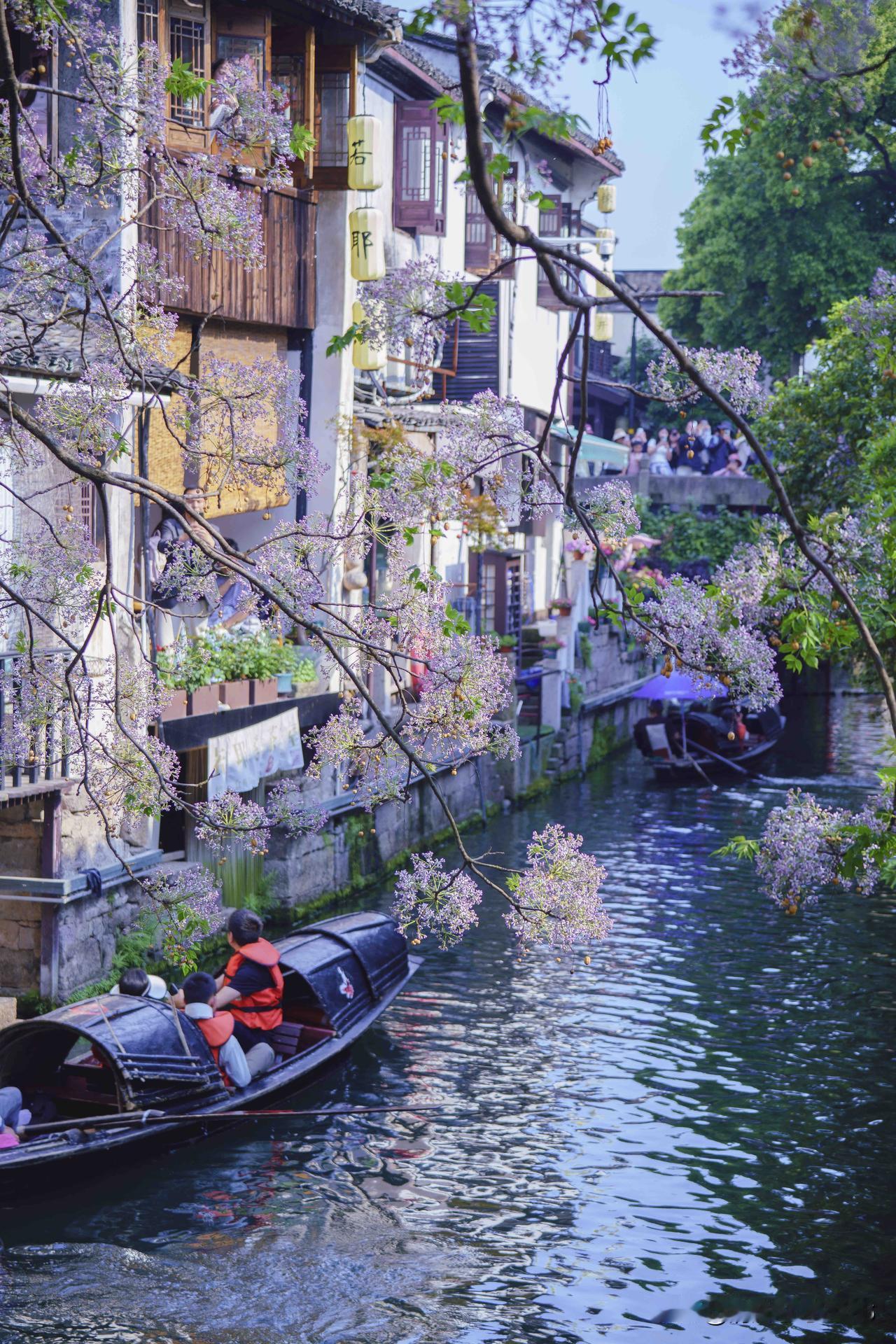 枝桠横斜巷陌,细碎柔紫的花簇静静垂落。清风拂过,花枝轻晃,花影漫过青石板,融进潺潺流水。乌篷船缓缓摇荡,橹声悠悠,水波温柔荡漾。那一对悠游的白鹅,自在追船而行,临水休憩,悠然自得,为安静的江南街巷,添了灵动鲜活的气息。