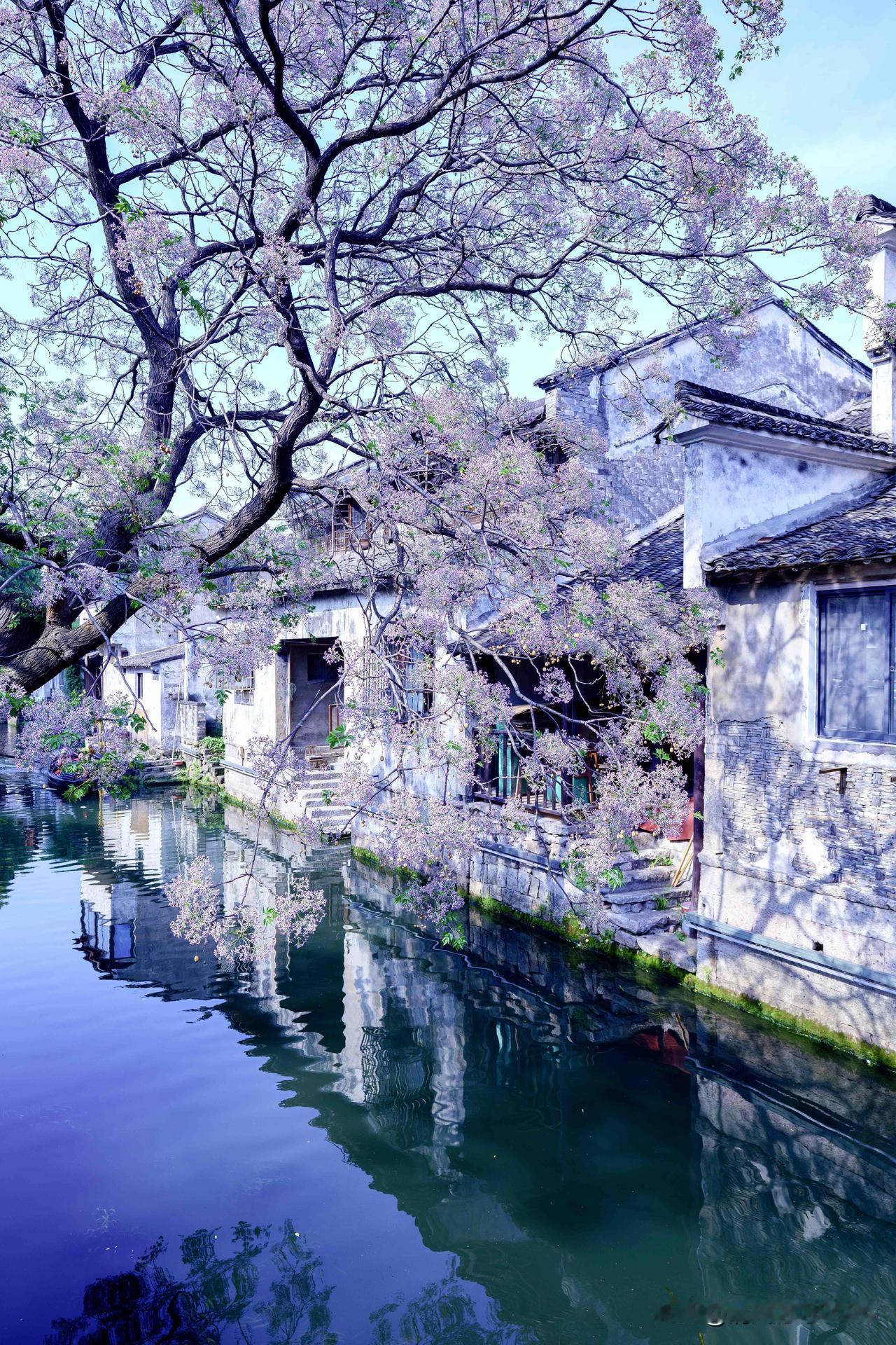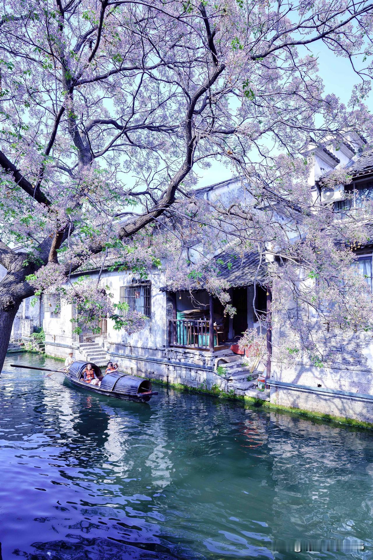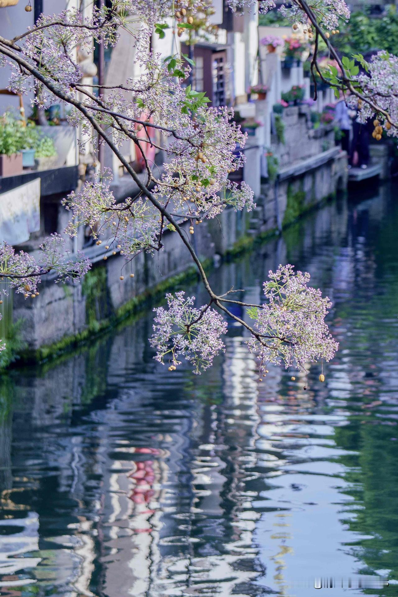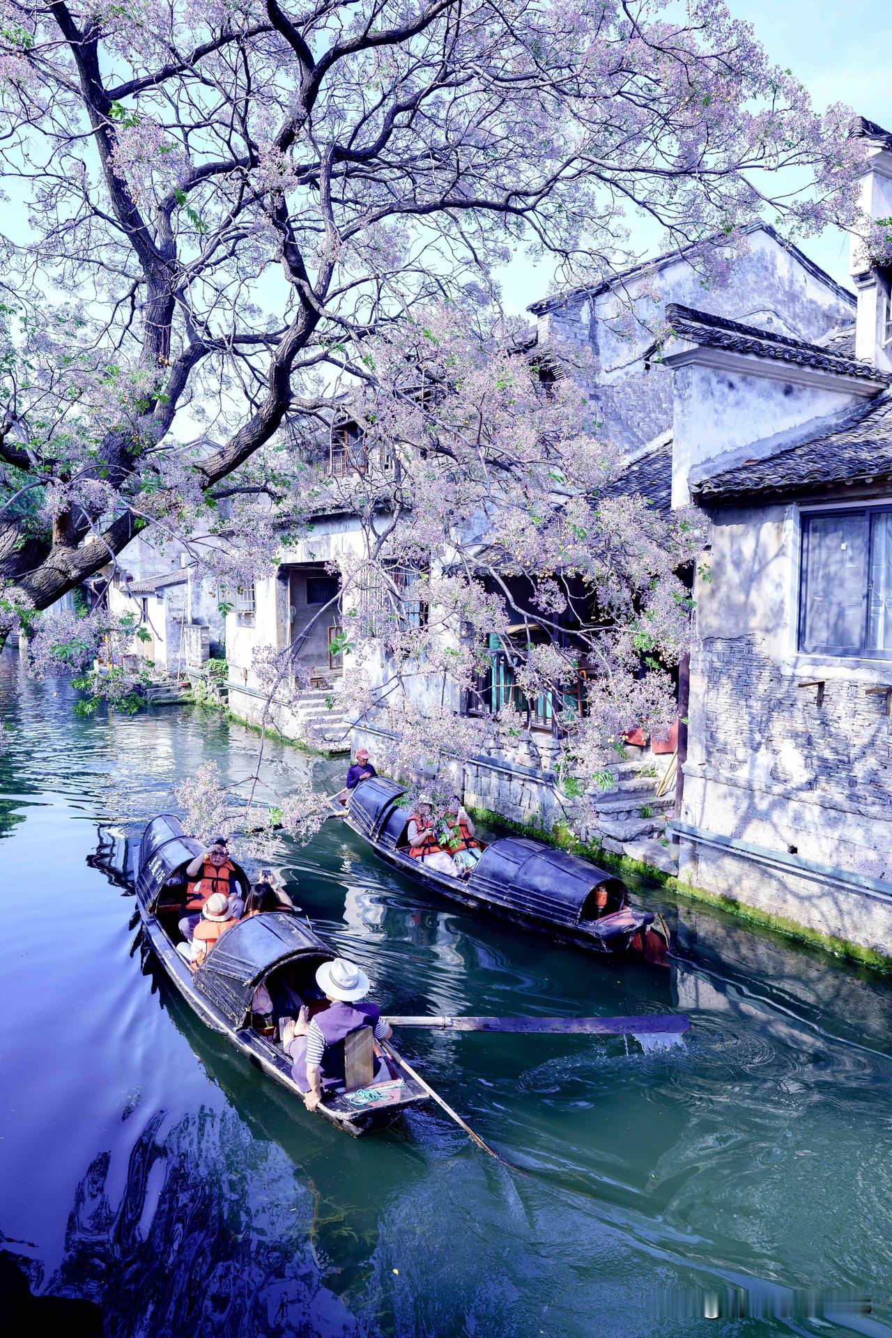 枝桠横斜巷陌,细碎柔紫的花簇静静垂落。清风拂过,花枝轻晃,花影漫过青石板,融进潺潺流水。乌篷船缓缓摇荡,橹声悠悠,水波温柔荡漾。那一对悠游的白鹅,自在追船而行,临水休憩,悠然自得,为安静的江南街巷,添了灵动鲜活的气息。