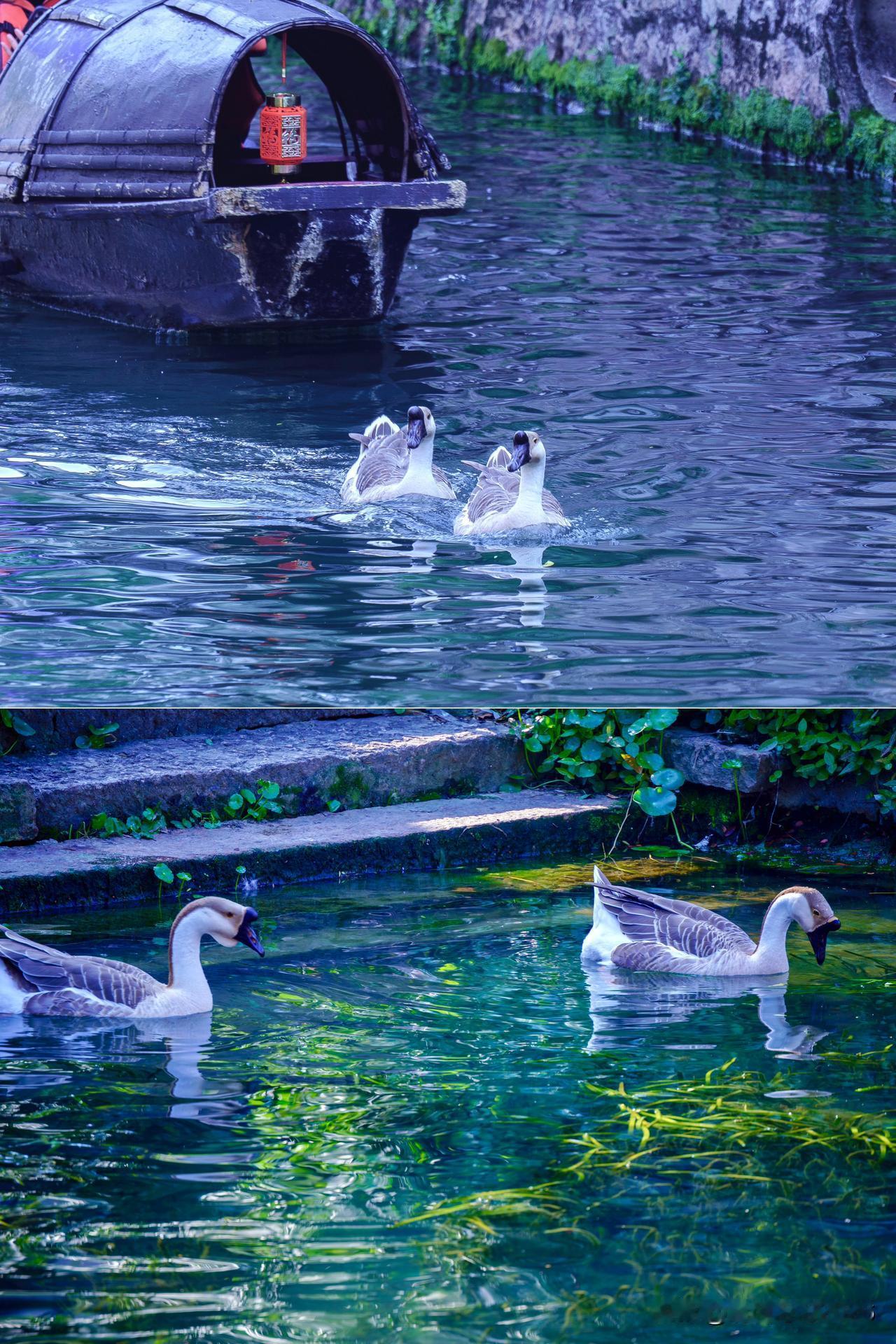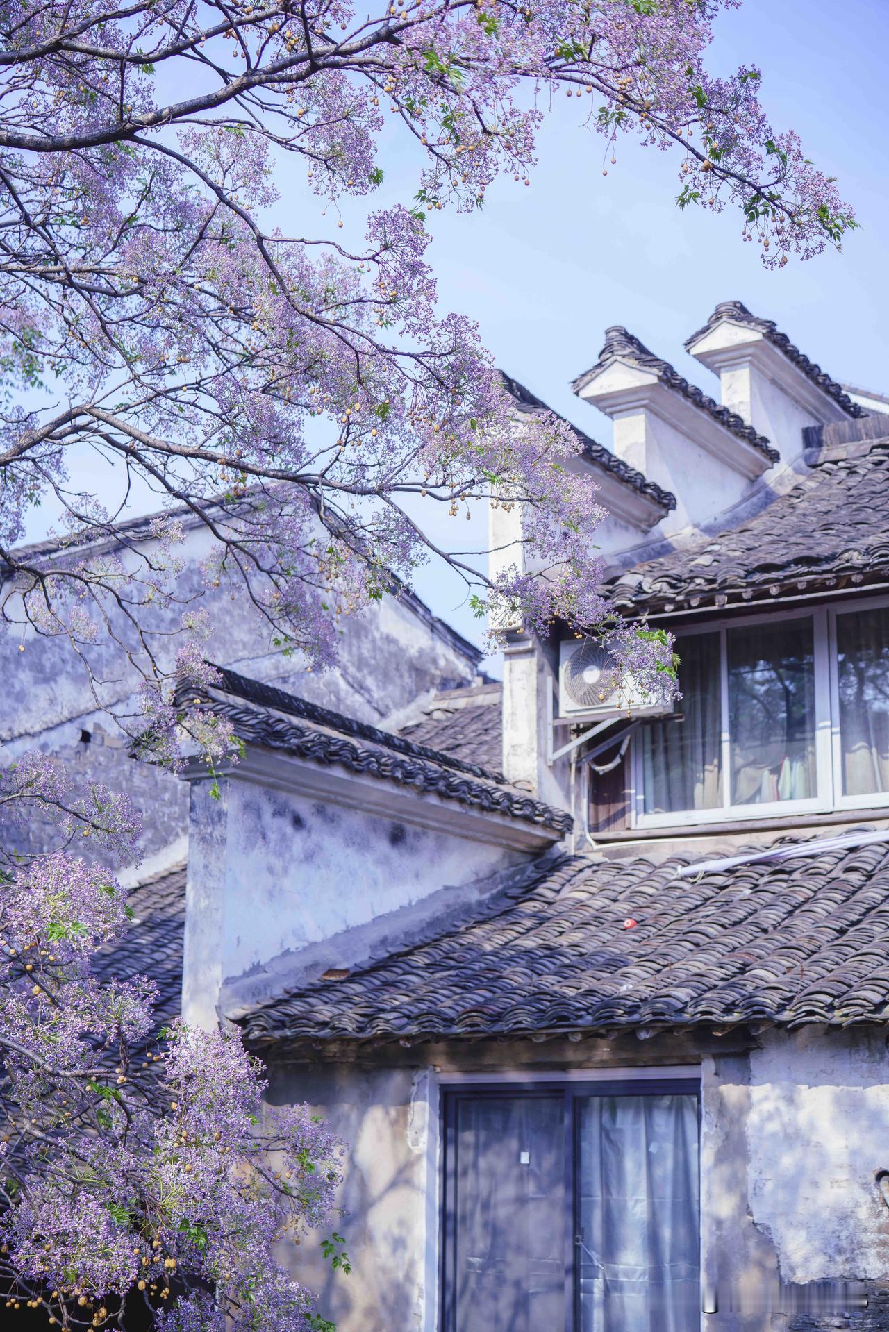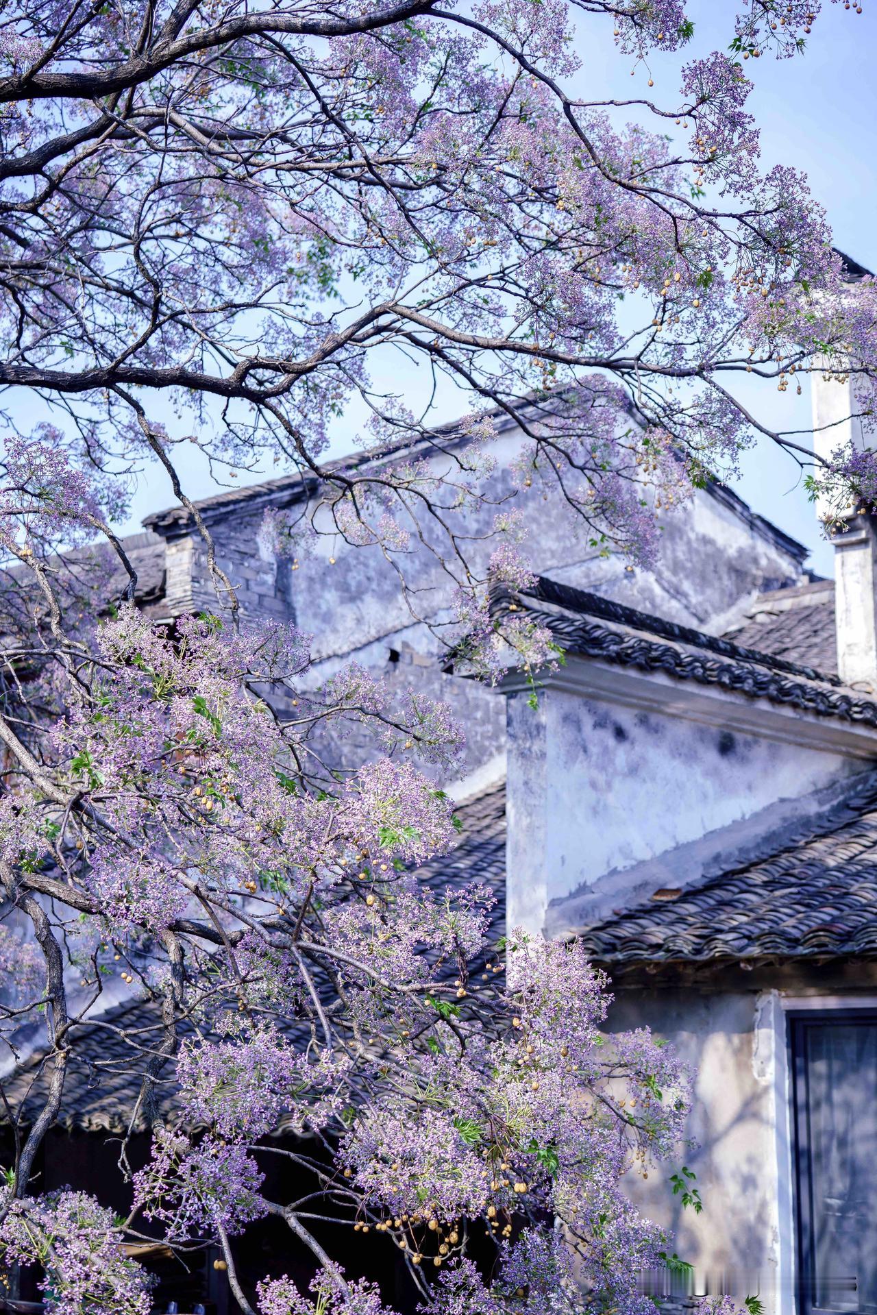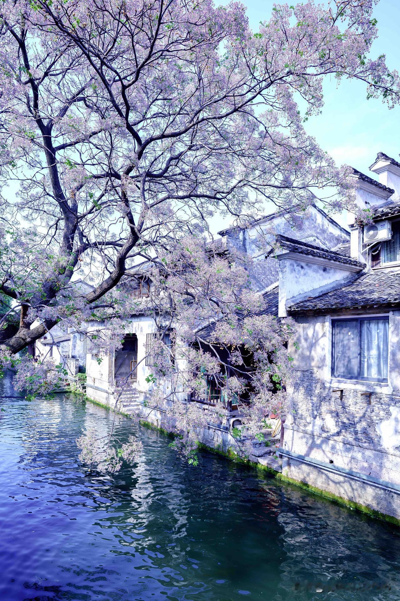 枝桠横斜巷陌,细碎柔紫的花簇静静垂落。清风拂过,花枝轻晃,花影漫过青石板,融进潺潺流水。乌篷船缓缓摇荡,橹声悠悠,水波温柔荡漾。那一对悠游的白鹅,自在追船而行,临水休憩,悠然自得,为安静的江南街巷,添了灵动鲜活的气息。