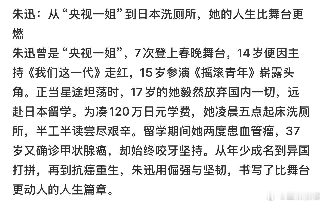 朱迅曾因手术差点告别舞台朱迅17年前差点告别舞台术后15天绑着绷带重返舞台,20年抗癌跑赢3场半马。她把无常活成日常,把疼痛熬成糖。致敬永远的“朱大胆”!