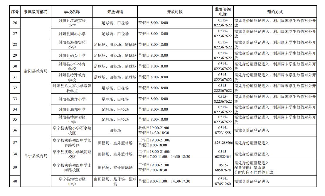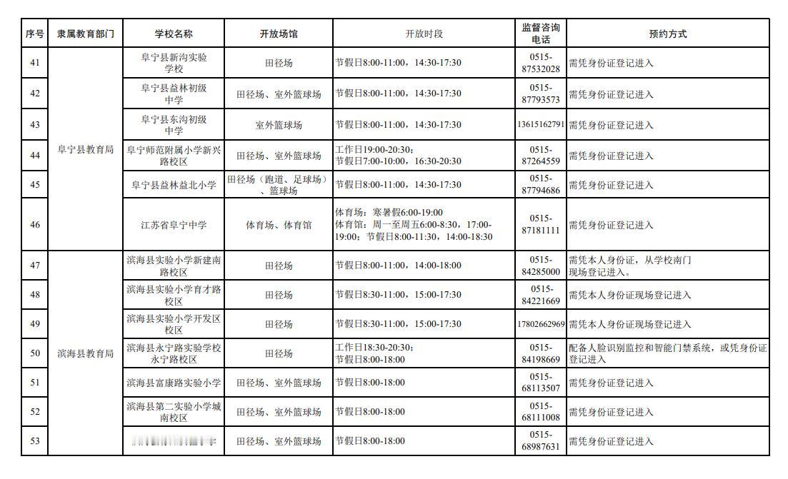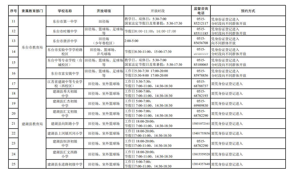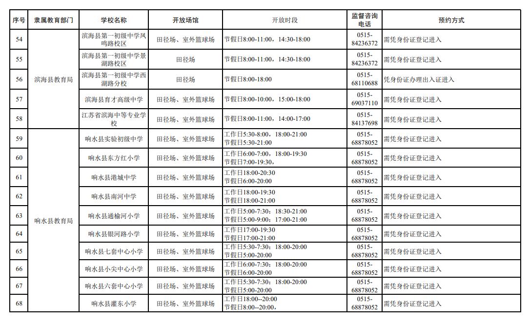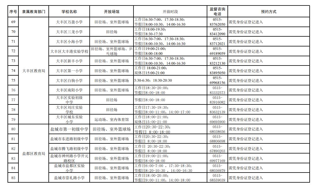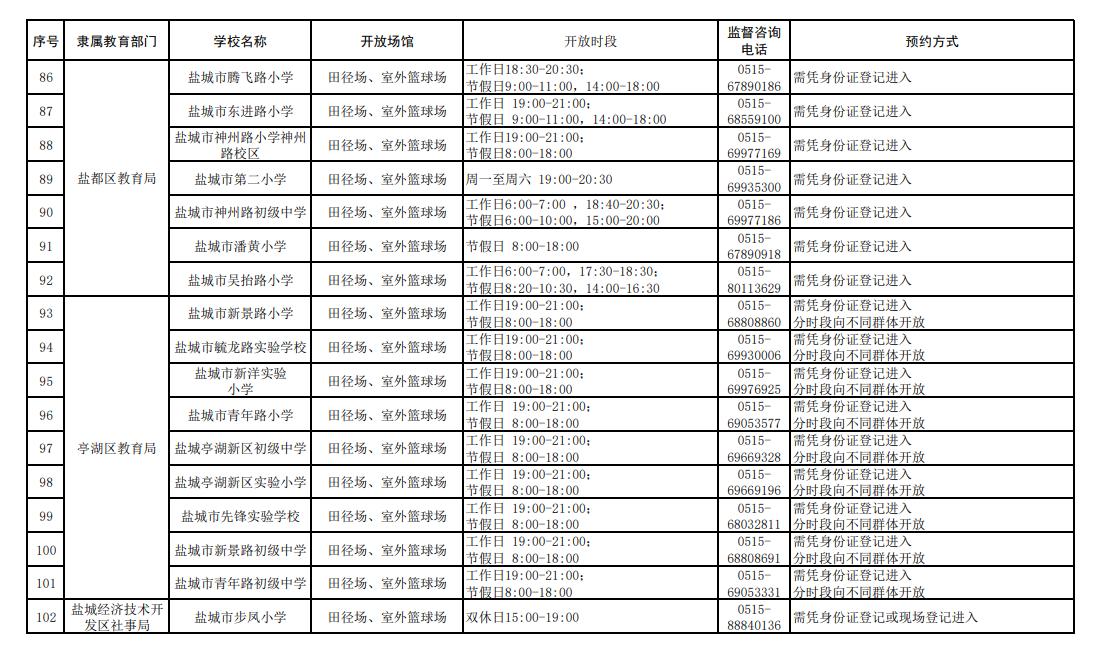 盐城市公示了全市102所中小学体育设施向社会开放的信息,覆盖市教育局及各县区,其中:市教育局4家、东台市12家、建湖县9家、射阳县10家、阜宁县10家、滨海县10家、响水县9家、大丰区11家、盐都区11家、亭湖经开区16家。开放场馆以田径场、室外篮球场为主,部分学校开放足球场、乒乓球场或体育馆;各学校分工作日、节假日设置了差异化开放时段,市民凭身份证登记或办理出入证即可进入,部分学校配备了智能门禁系统,同时公布了监督咨询电话,方便市民文明、安全使用校园体育设施。