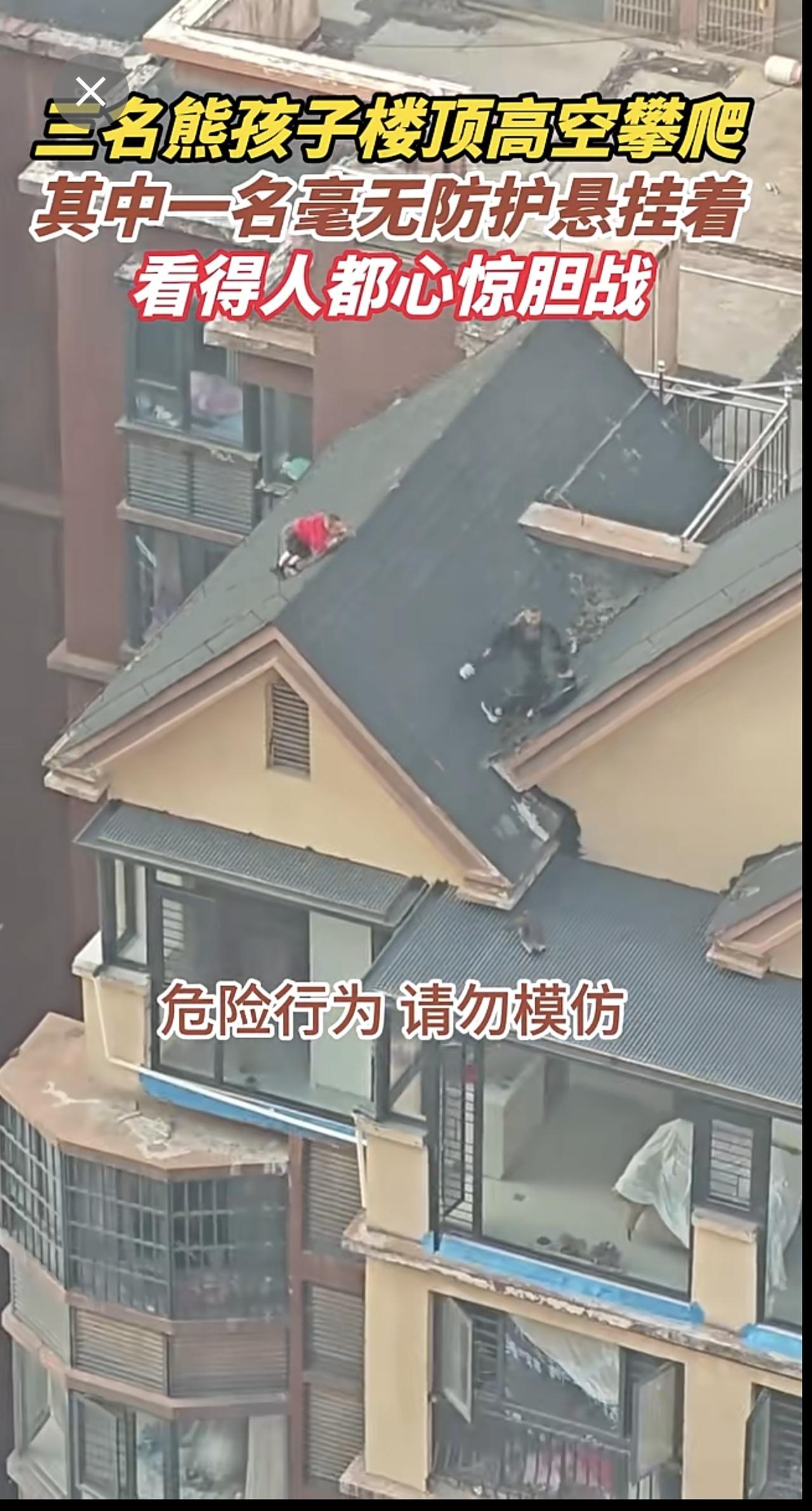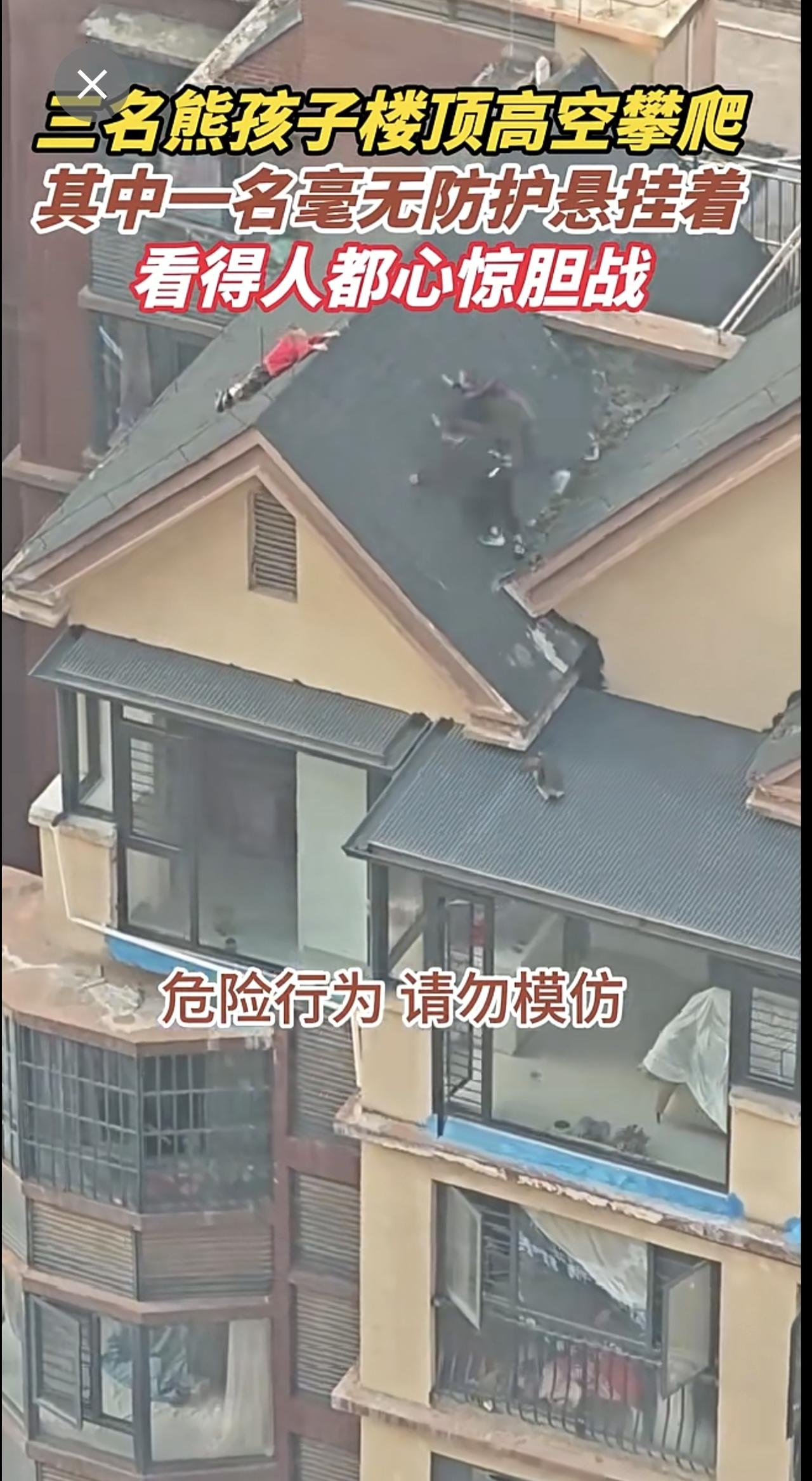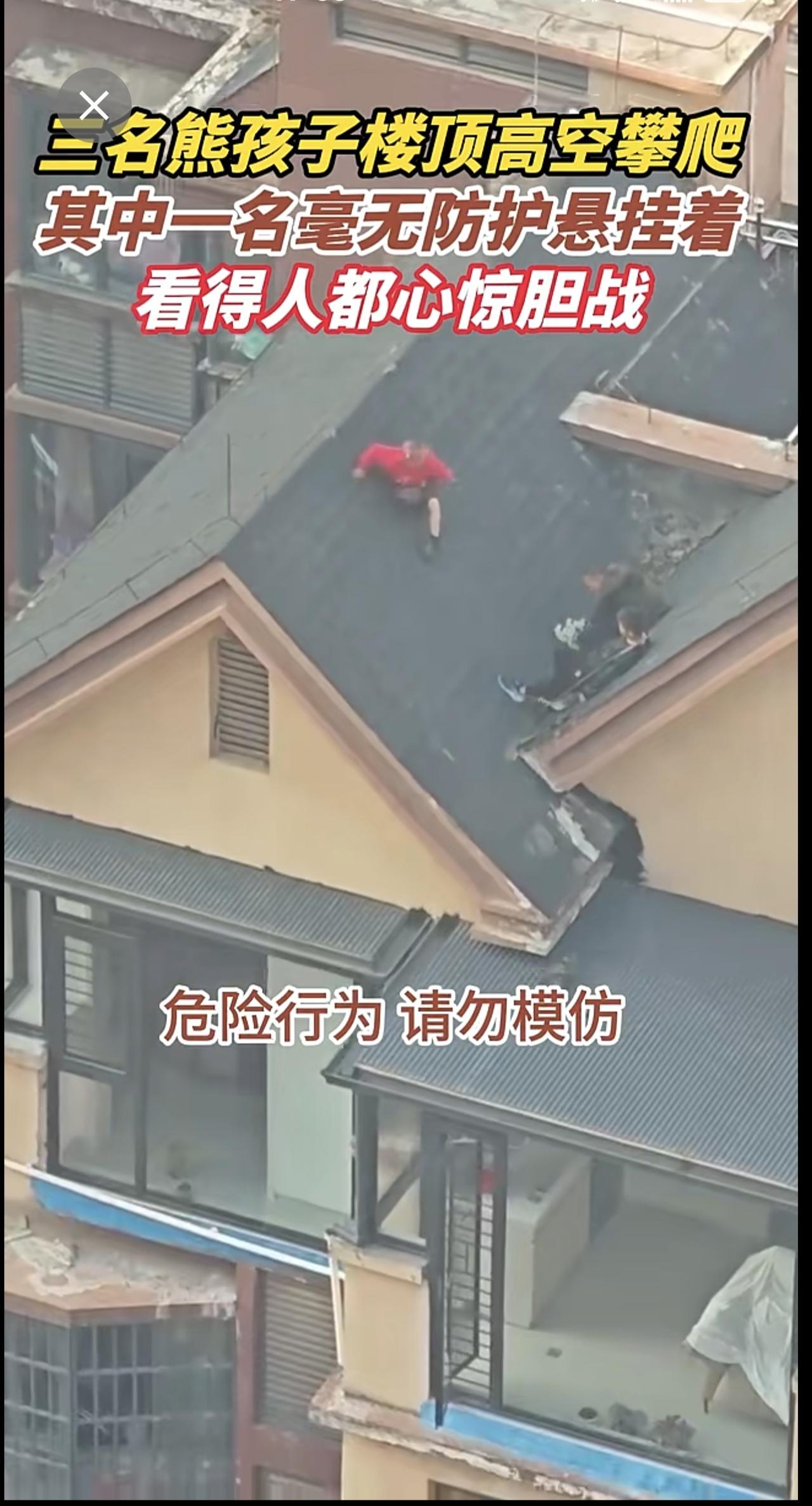 三名熊孩子楼顶高空攀爬,其中一名毫无防护悬挂着,看得人都心惊胆战