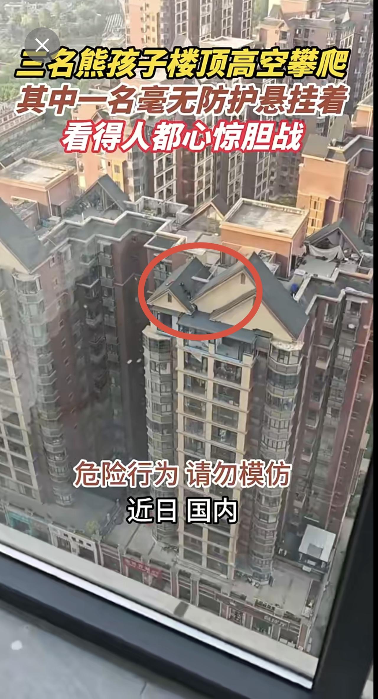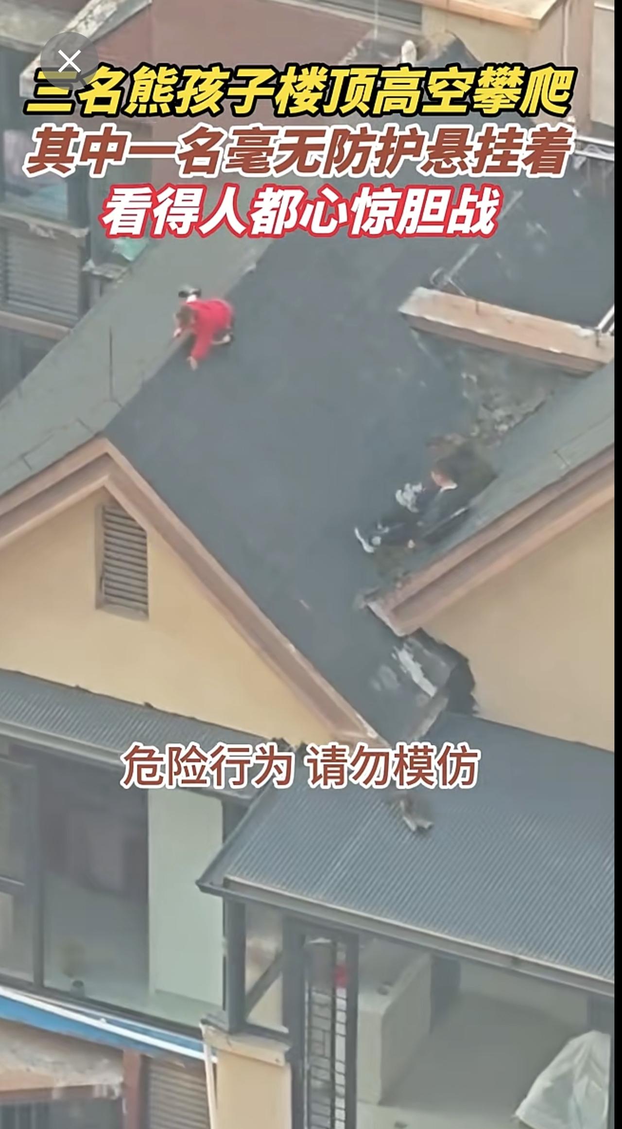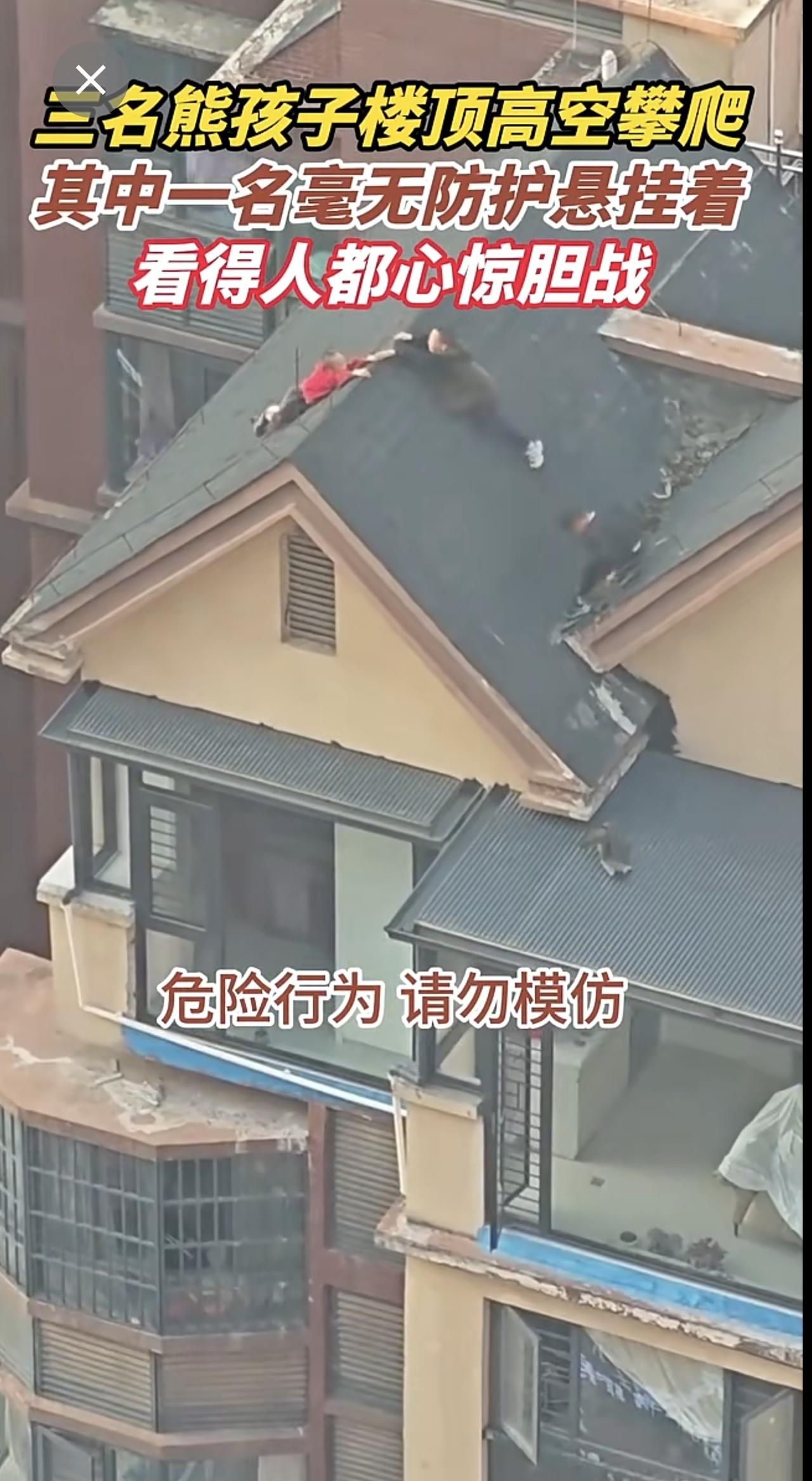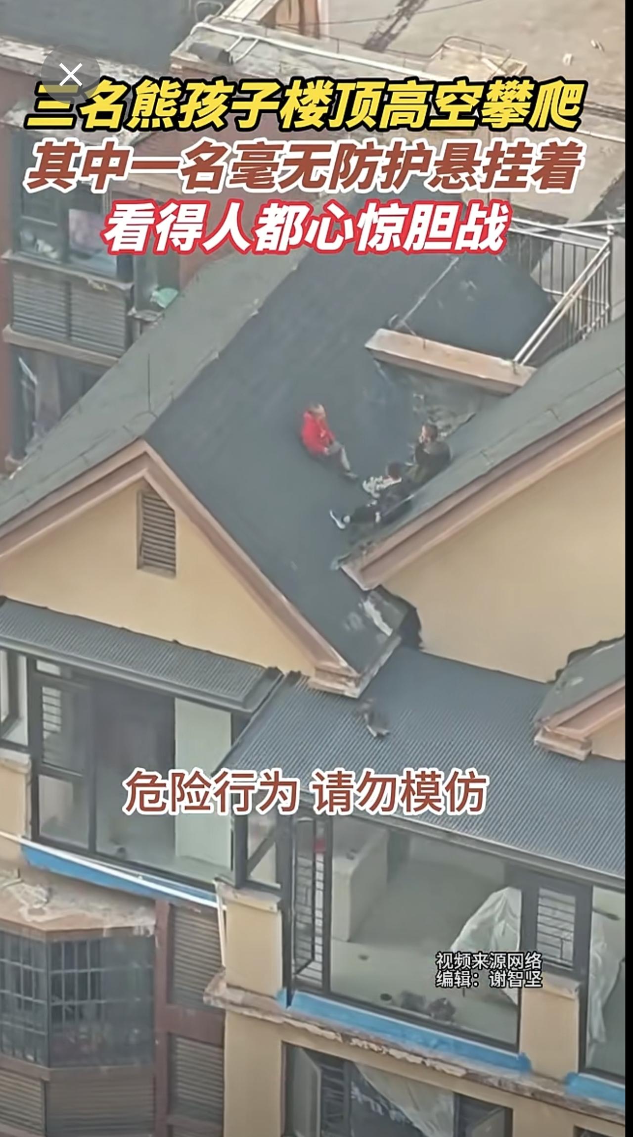 三名熊孩子楼顶高空攀爬,其中一名毫无防护悬挂着,看得人都心惊胆战