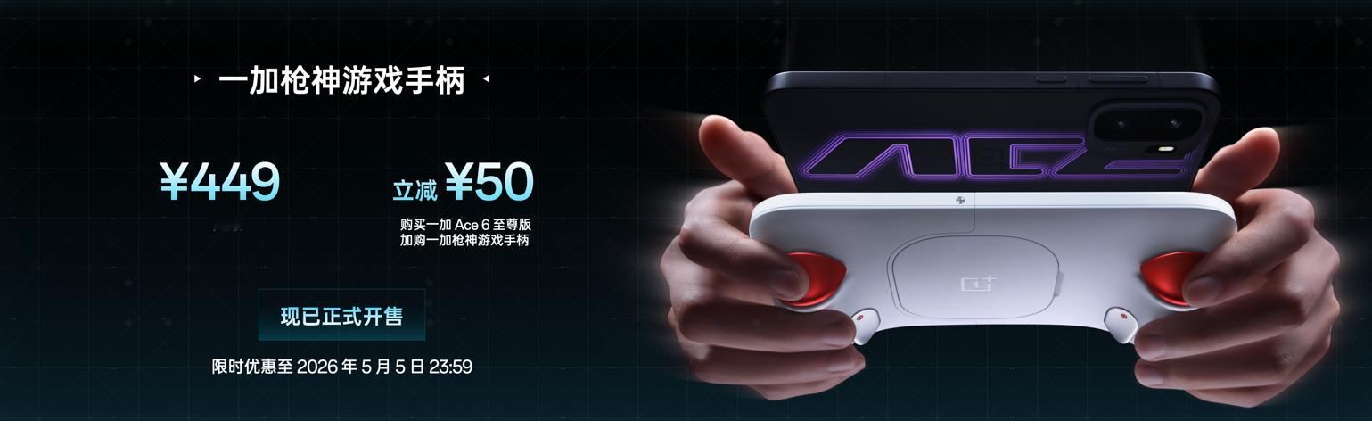 一加枪神游戏手柄,零售价449元,加购一加 Ace 6 至尊版立减50元。