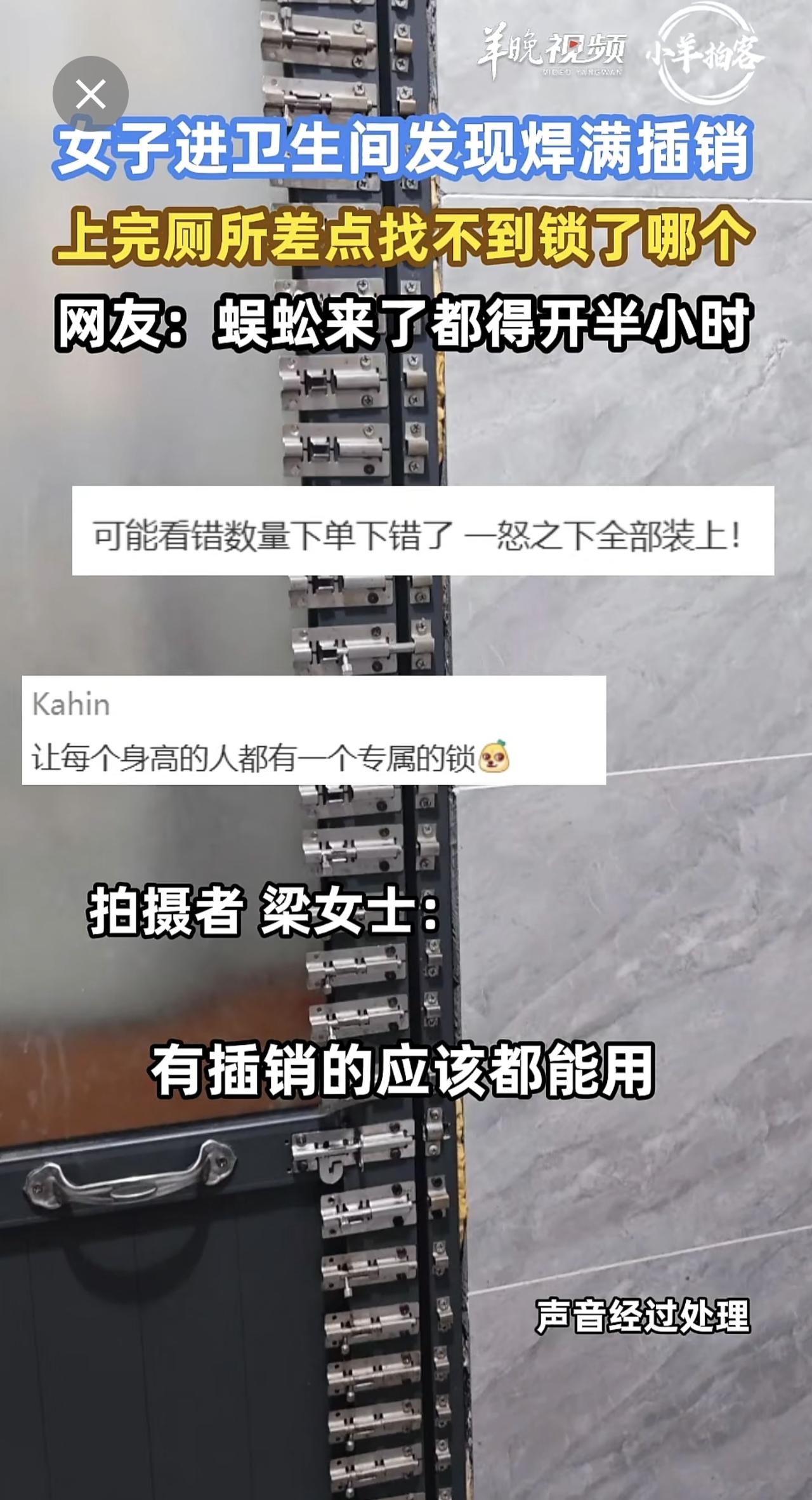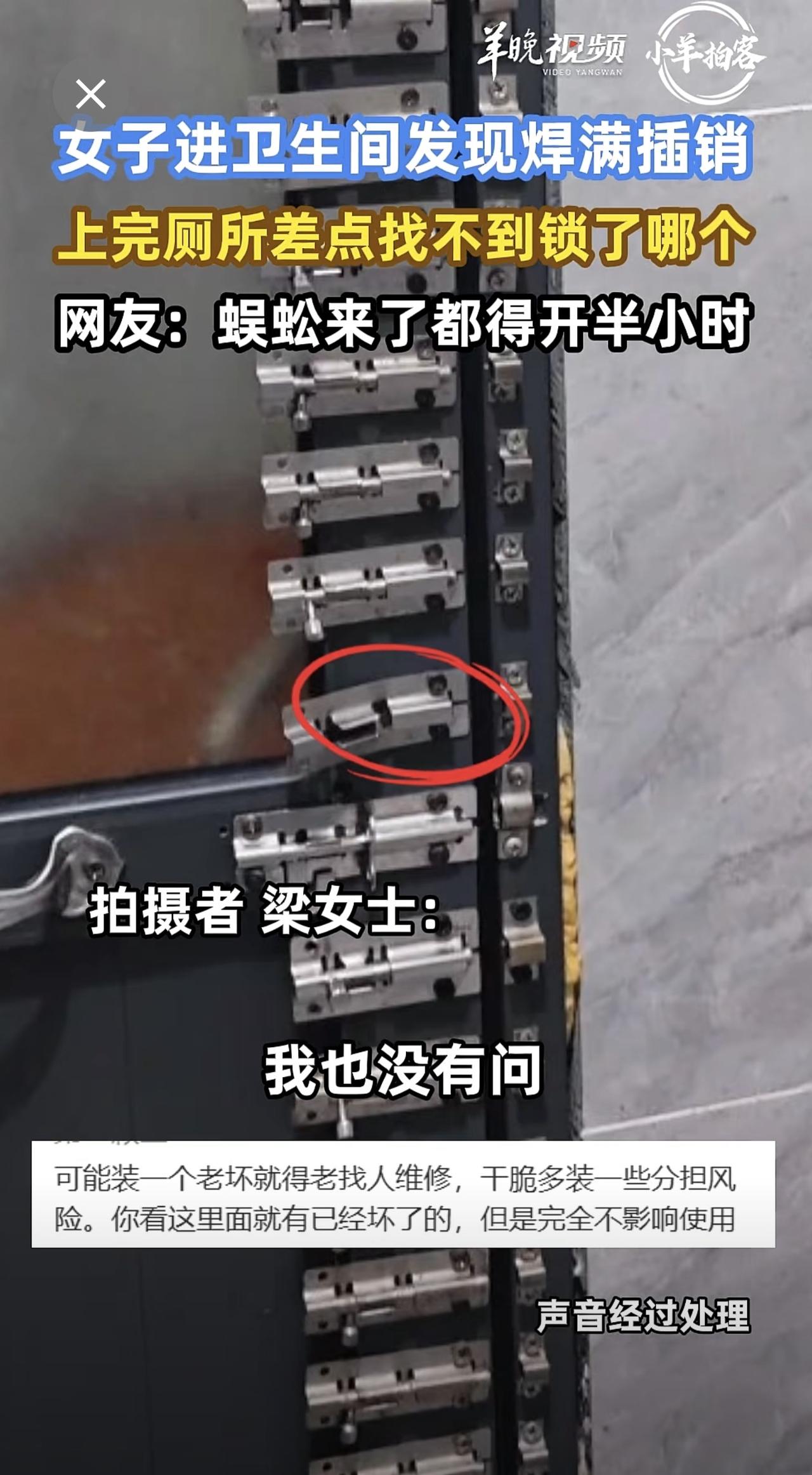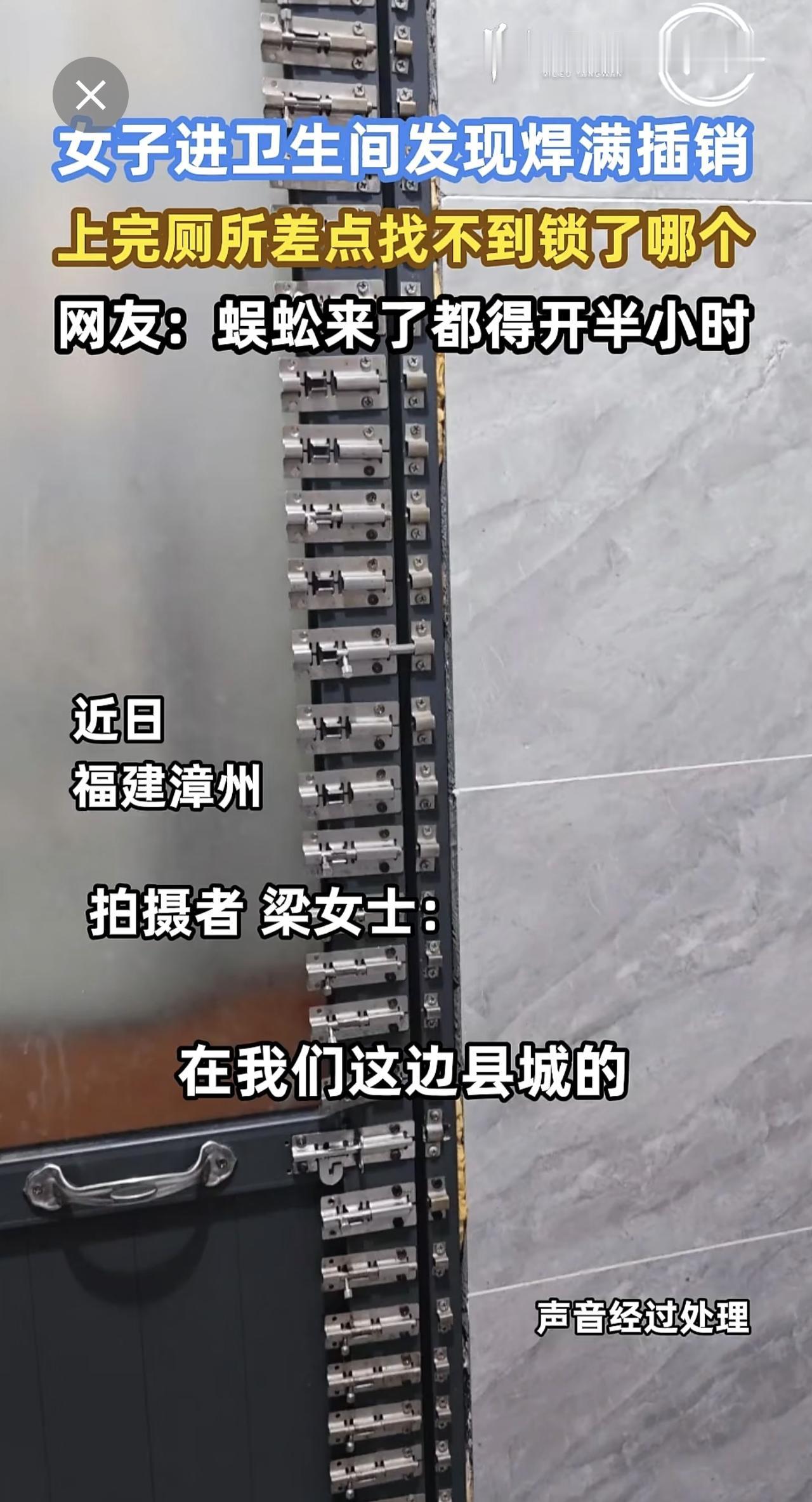 女子进卫生间发现焊满插销,上完厕所差点找不到锁了哪个,网友:蜈蚣来了都得开半小时