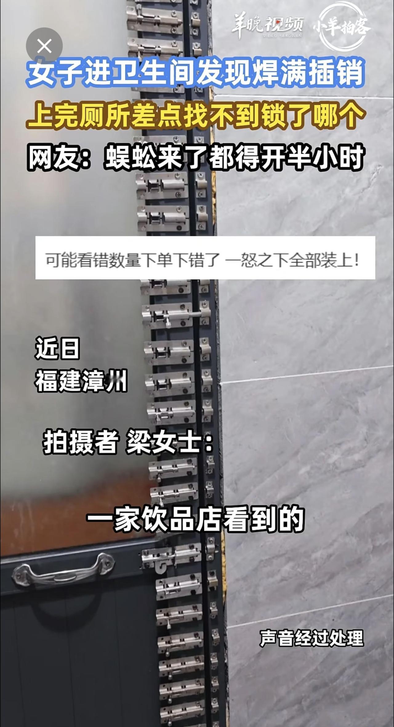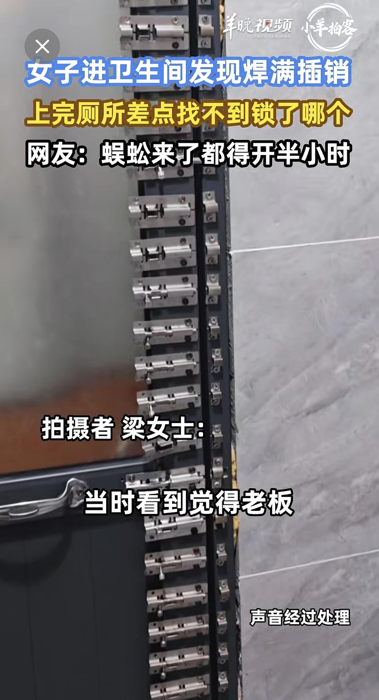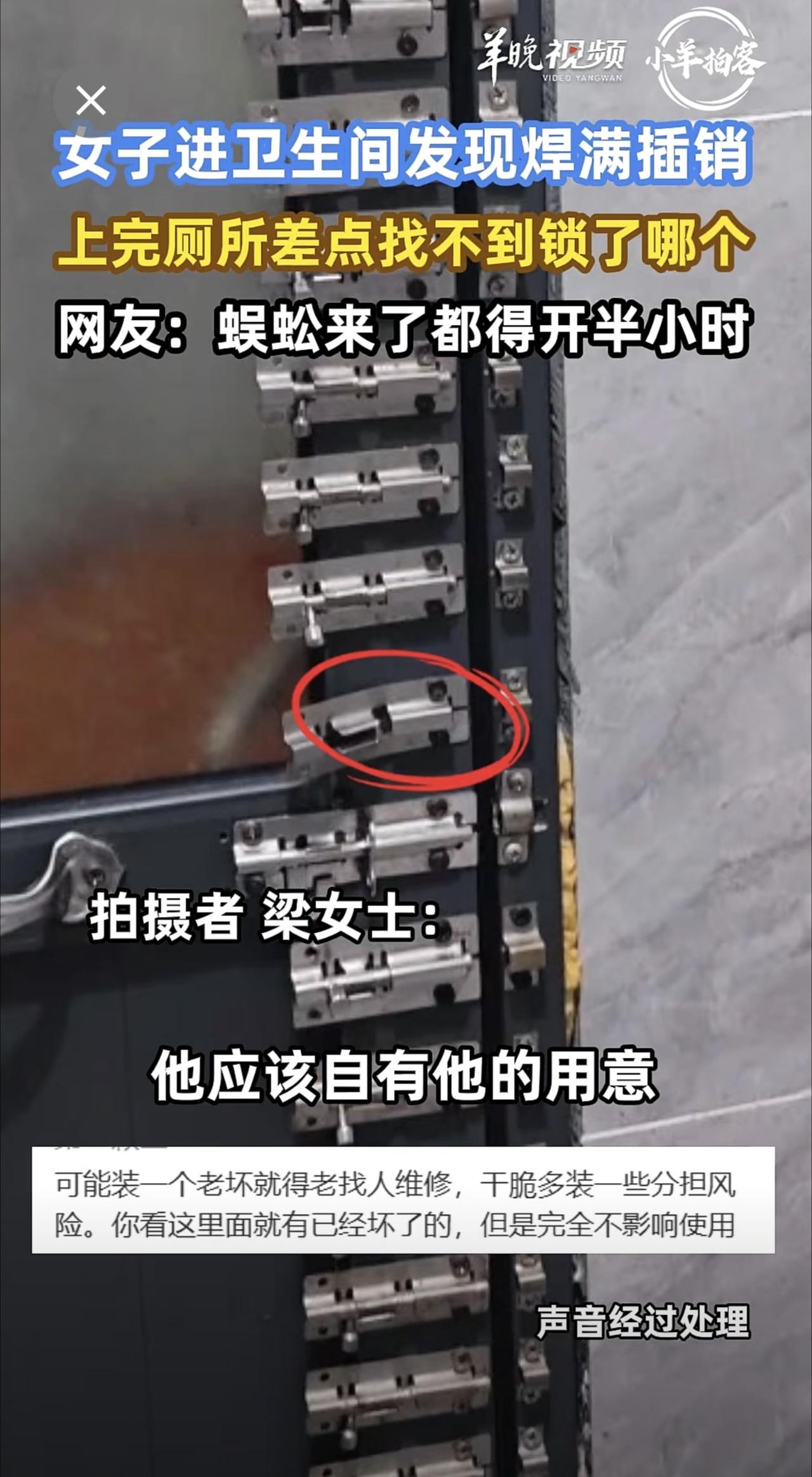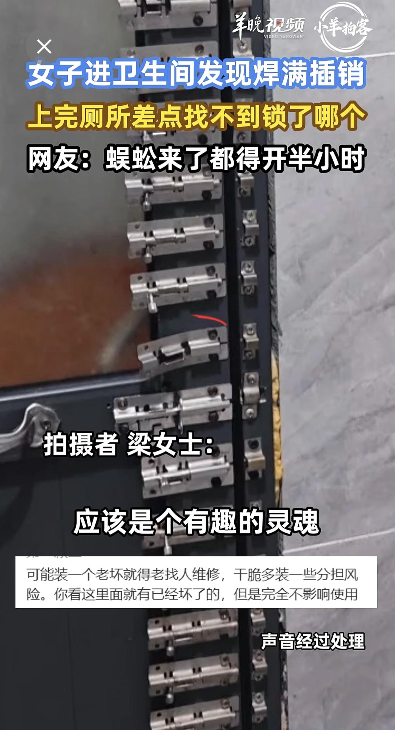 女子进卫生间发现焊满插销,上完厕所差点找不到锁了哪个,网友:蜈蚣来了都得开半小时。来源:布嗷耶 小羊拍客2026([原创]记者:王中杰;实习生:王梓睿;编辑:罗钧栋;审签:胡军)