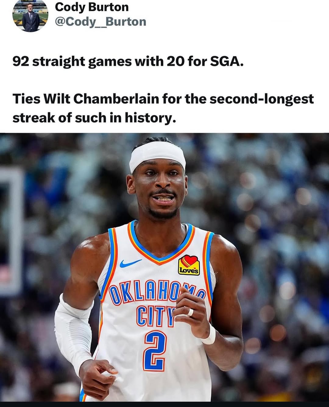 【亚历山大连续92场得分20+,追平张伯伦,排名历史第2!】在昨日战胜太阳队的比赛中,雷霆球星亚历山大获得37分并送出8次助攻,这是他连续92场比赛得分达到20+。这也让他追平张伯伦,成为连续得分20+场次第二多的球员。