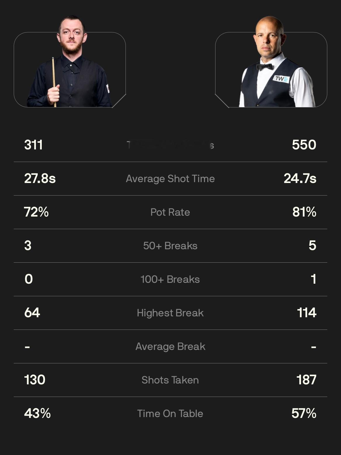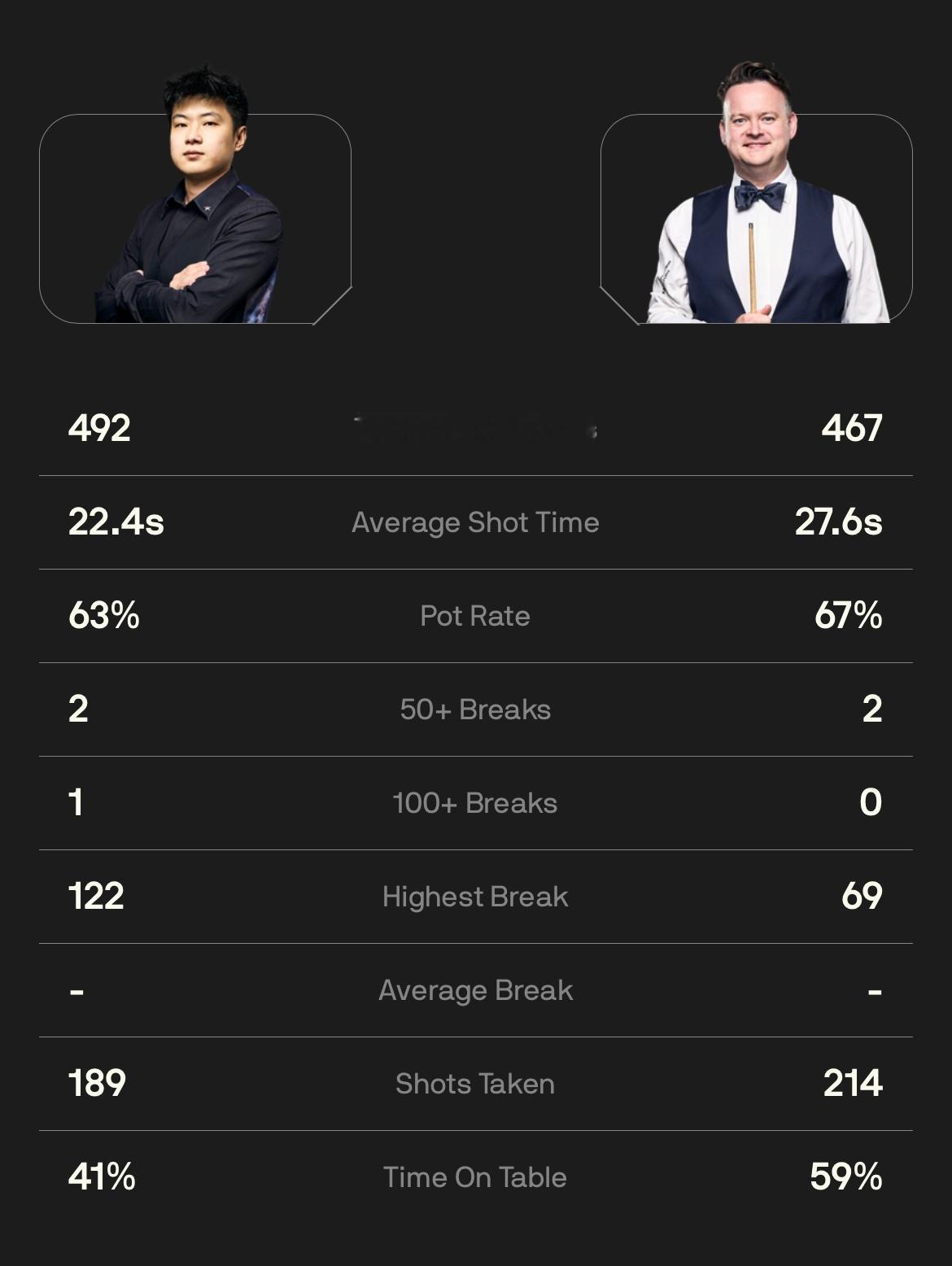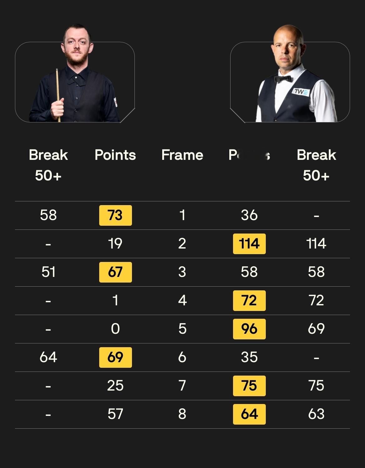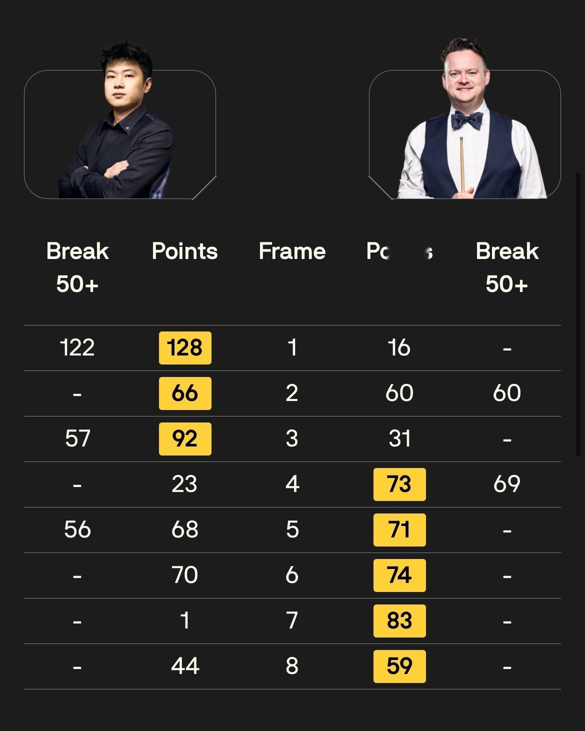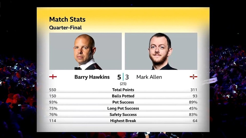 2026斯诺克世锦赛 1/4决赛第一阶段打满8局,17:00场次两桌比分: