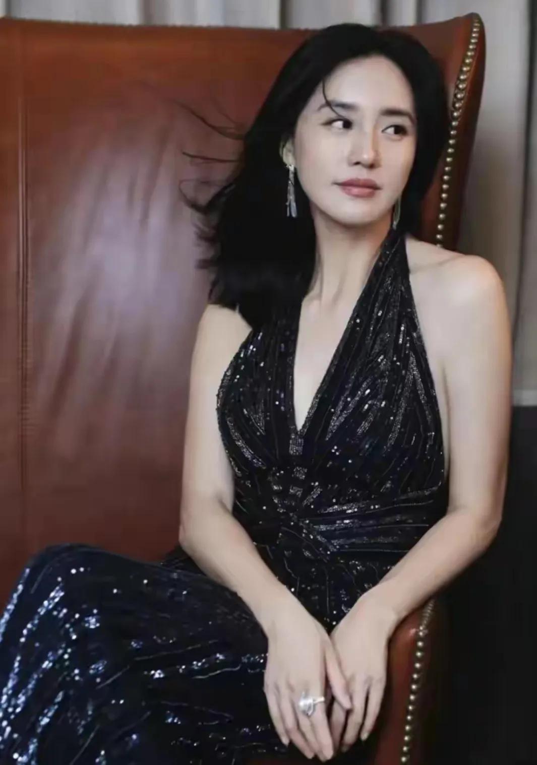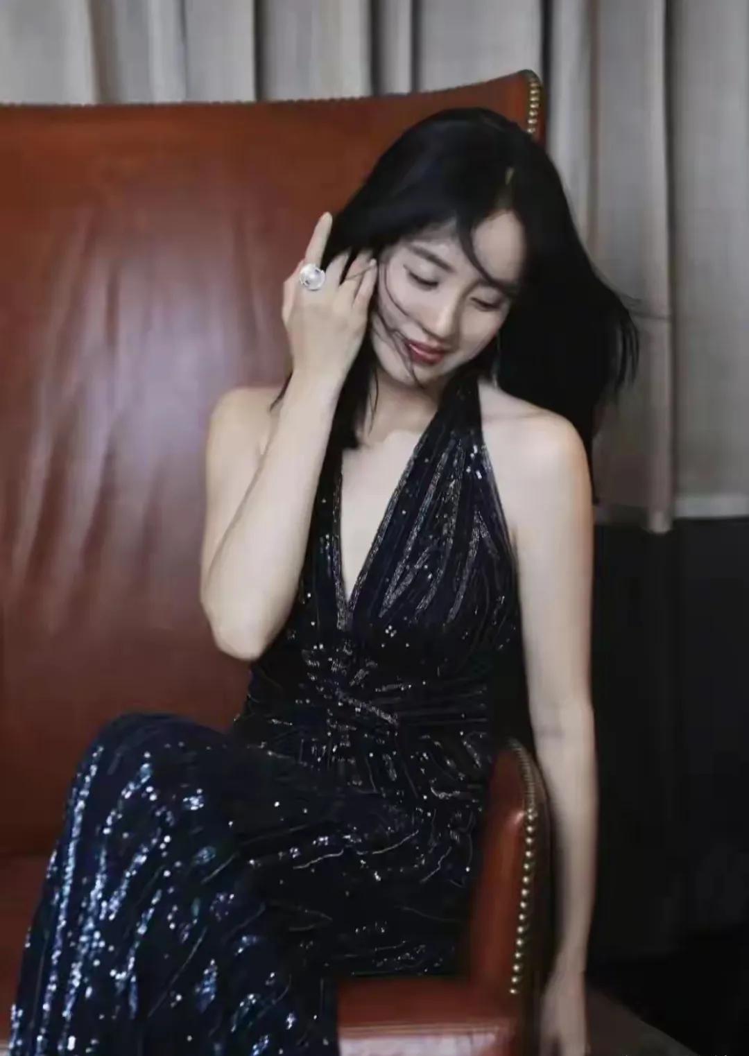 一袭挂脖黑亮片长裙,深V剪裁衬出优越肩颈,利落黑发自带风情。