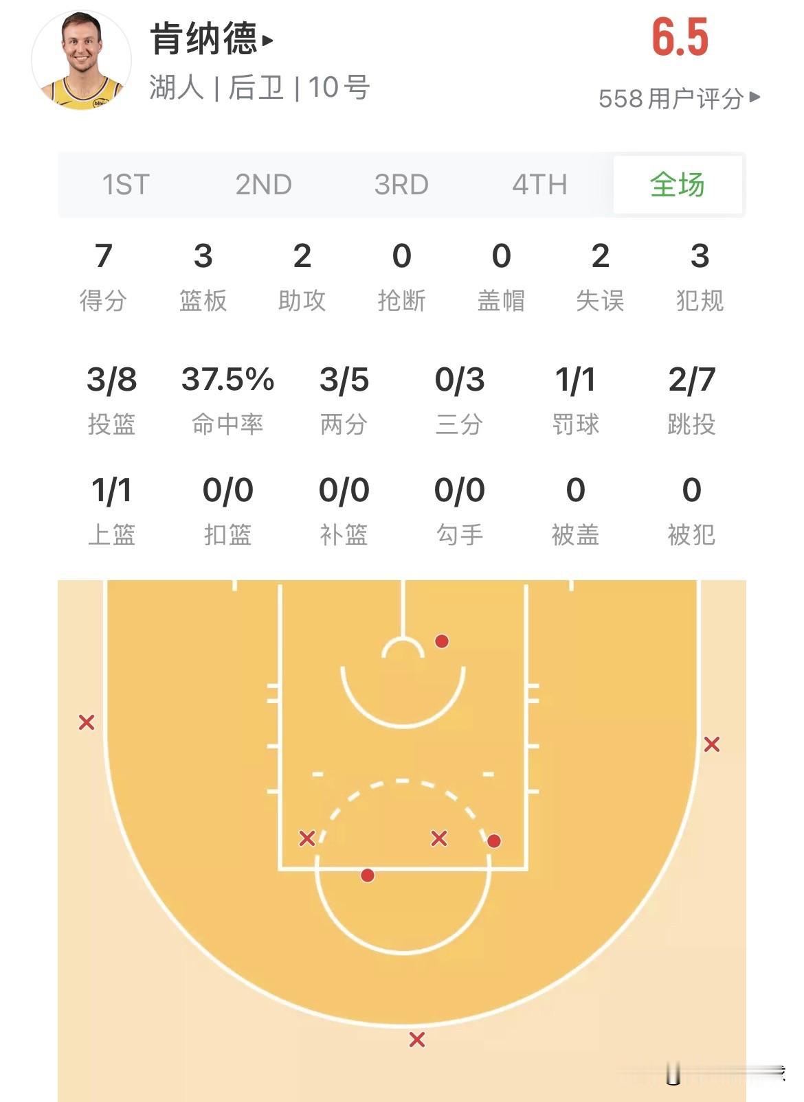 全场比赛打完,肯纳德首发出战32分15秒,投篮8中3、三分3中0,仅拿到7分3篮板2助攻,场上正负值低至-13。