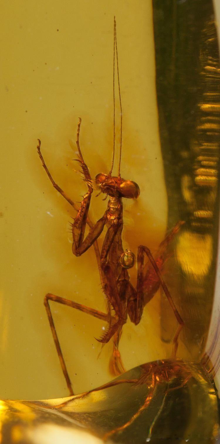 一只被困在琥珀中的螳螂,距今约有1200万年历史。