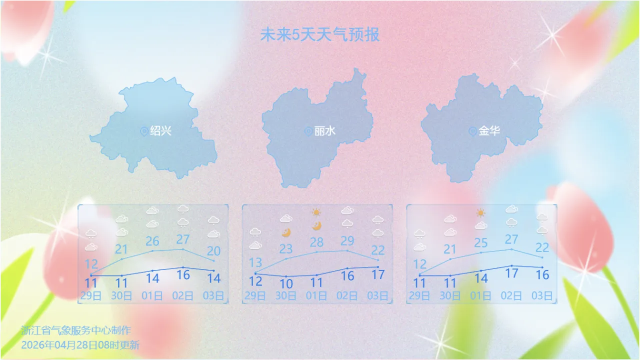 以杭州为例,4月30日至5月1日,无明显天气系统干扰,阳光全线回归,气温舒适回升,适合外出游玩、居家洗晒。5月2日后期至5月4日,受暖湿气流与低涡切变共同影响,全市会有新一轮降水过程。