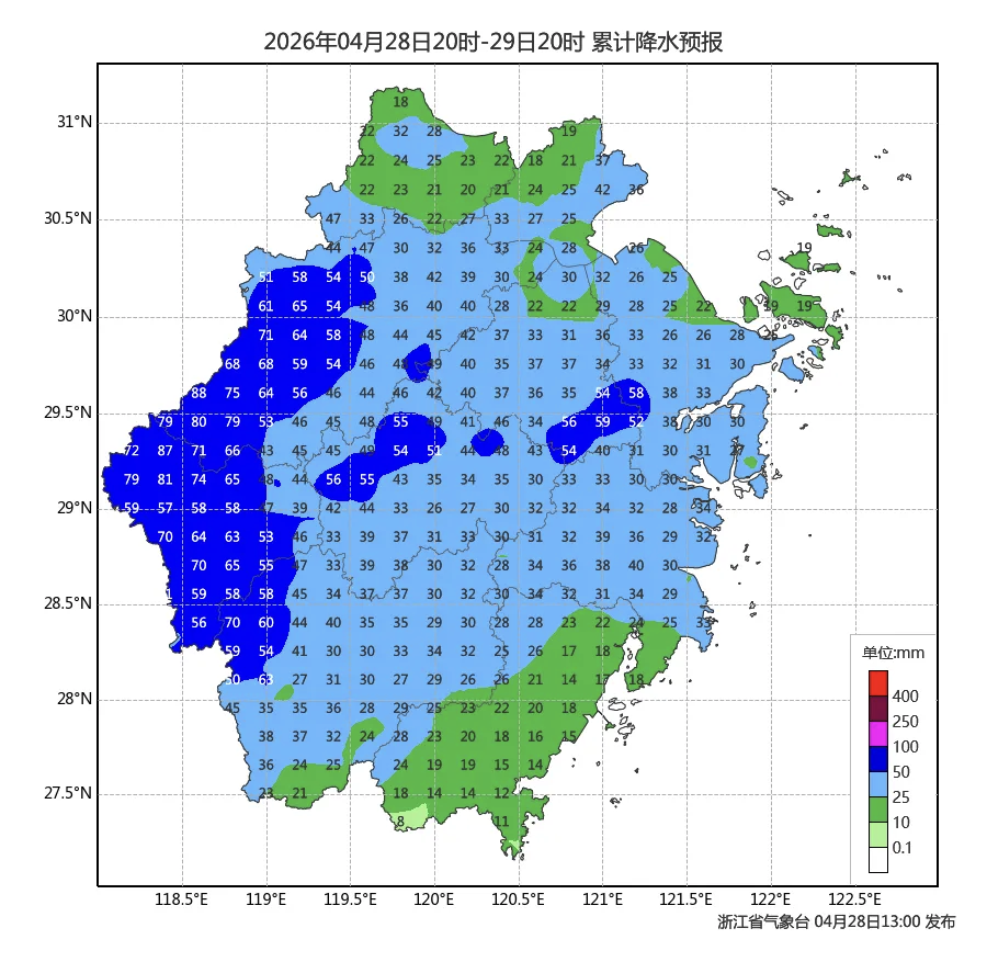 值得注意的是,28日白天的降雨只是“开胃小菜”,降雨主力在夜间才全面登陆浙江。昨夜到今天白天,全省有中到大阵雨或雷雨,浙北南部、浙中及丽水等地部分时段可达大到暴雨,个别站点甚至会出现大暴雨,浙中北地区部分仍有5-7级偏北风。