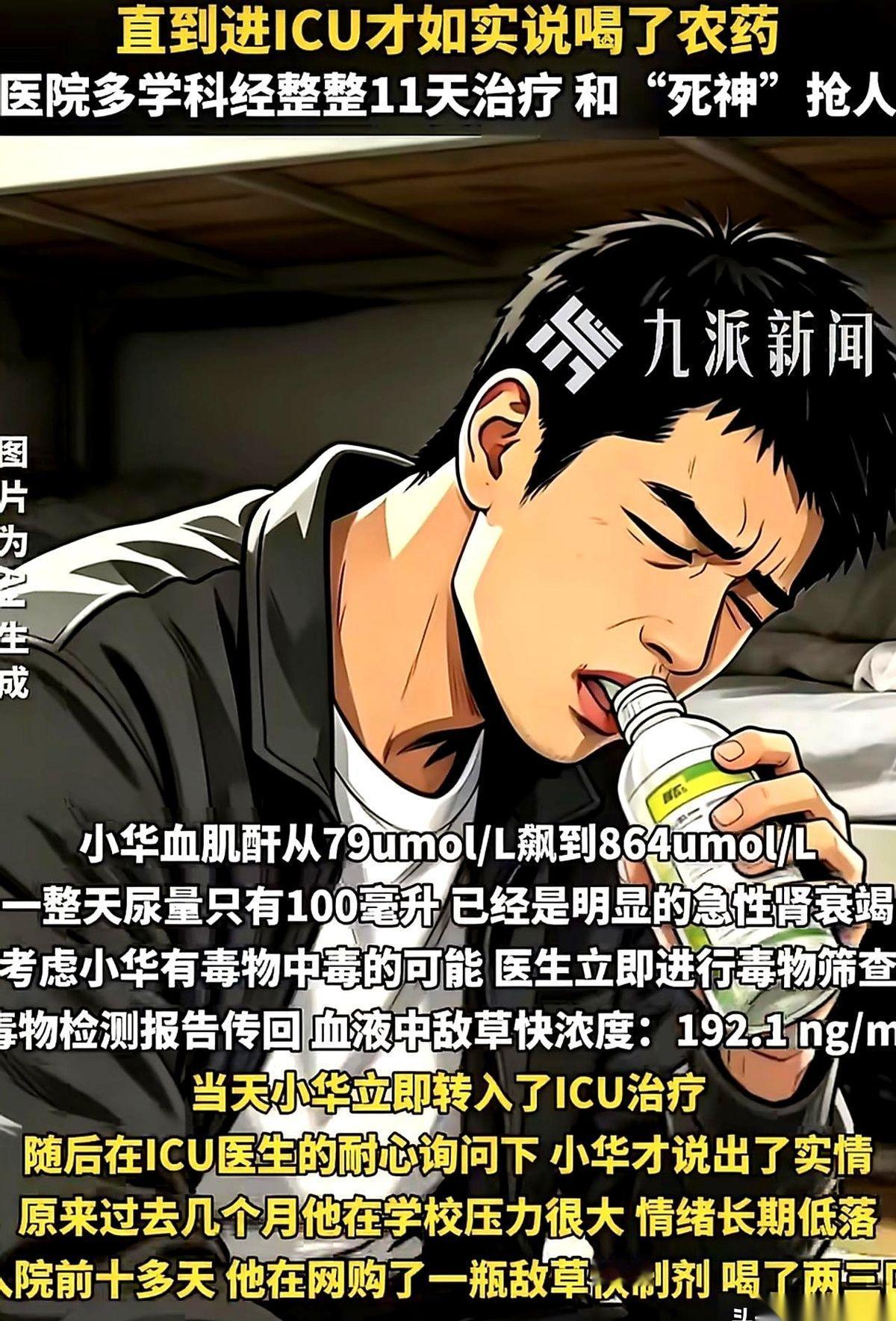 这整整十天,他像个没事人一样照常上课、吃饭、睡觉。哪怕农药正在身体里悄悄溶解他的内脏,哪怕学业的压力大到让他想消失,他都没跟家里人吐露半个字。直到身体彻底“停摆”,连路都走不动了,这个秘密才被腹痛给顶了出来。