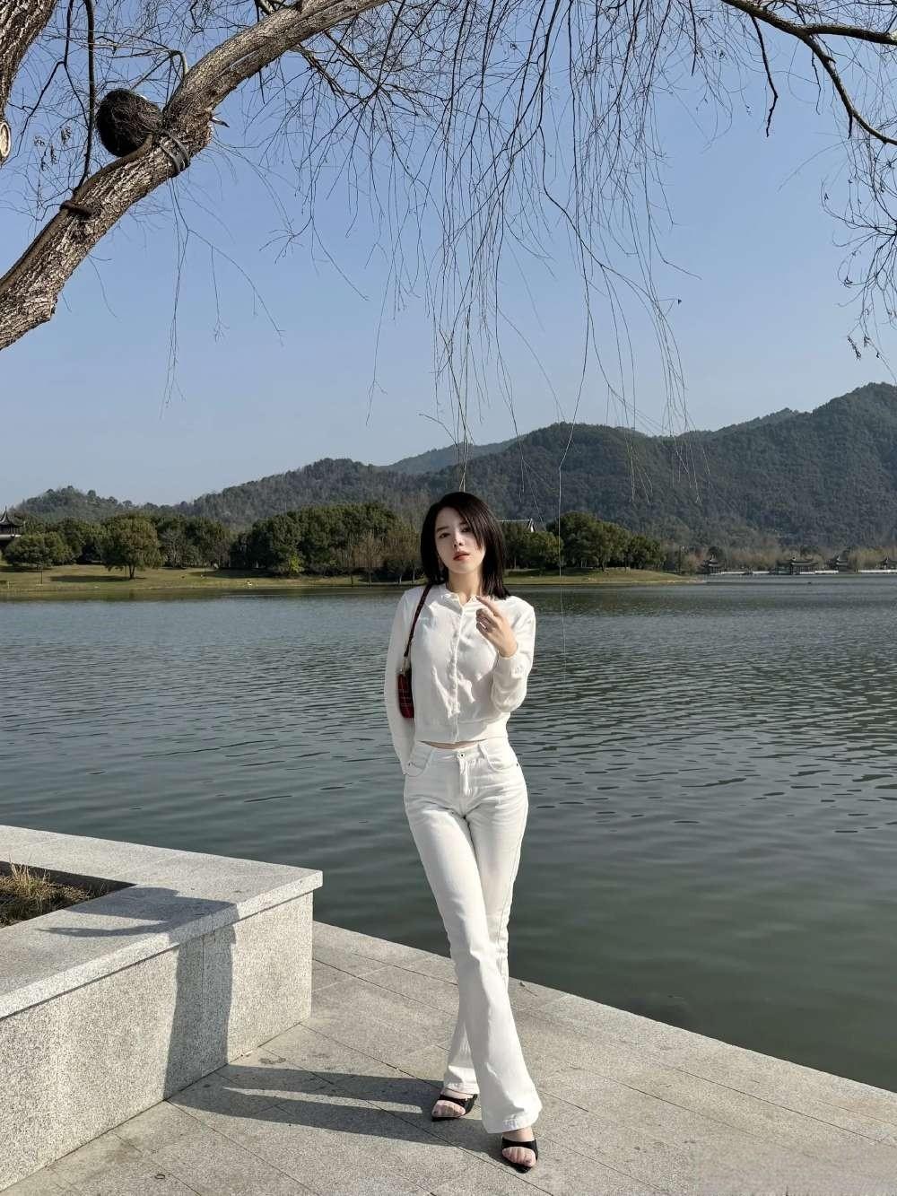 - 下装搭白色微喇牛仔裤,微喇版型修饰腿型,全白配色干净高级,和自然背景形成柔和对比;