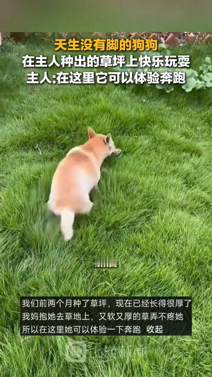天生没有脚的狗狗在主人种出的草坪上快乐玩耍。主人:在这里它可以体验奔跑。