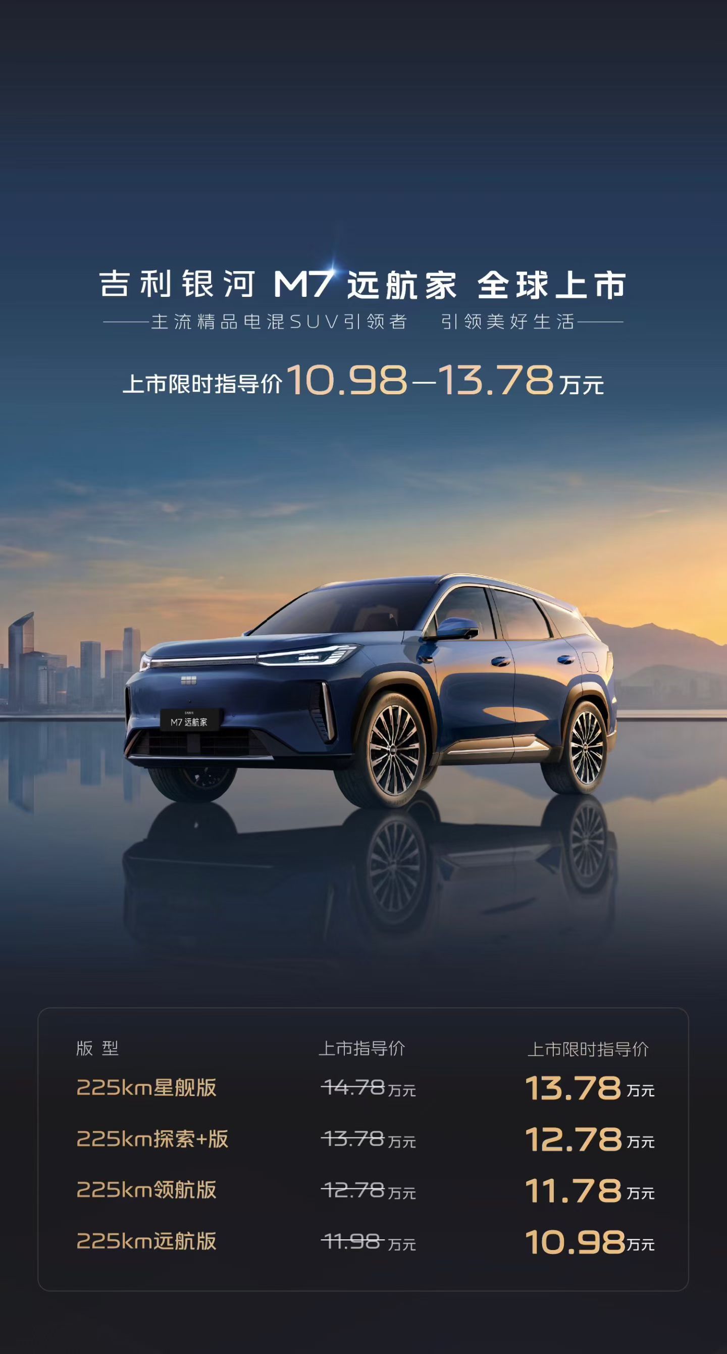 吉利银河M7远航家上市,四款配置,六个车漆颜色、四个内饰配色,限时价10.98-13.78万元。