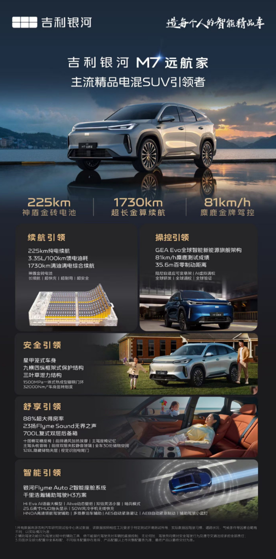 纯电续航225km、综合续航1730km,百公里馈电油耗只有3.35L。智能这块儿也不含糊,Flyme Auto2智能座舱、千里浩瀚H3驾驶辅助,主打一个好开又好停。吉利银河M7远航家
