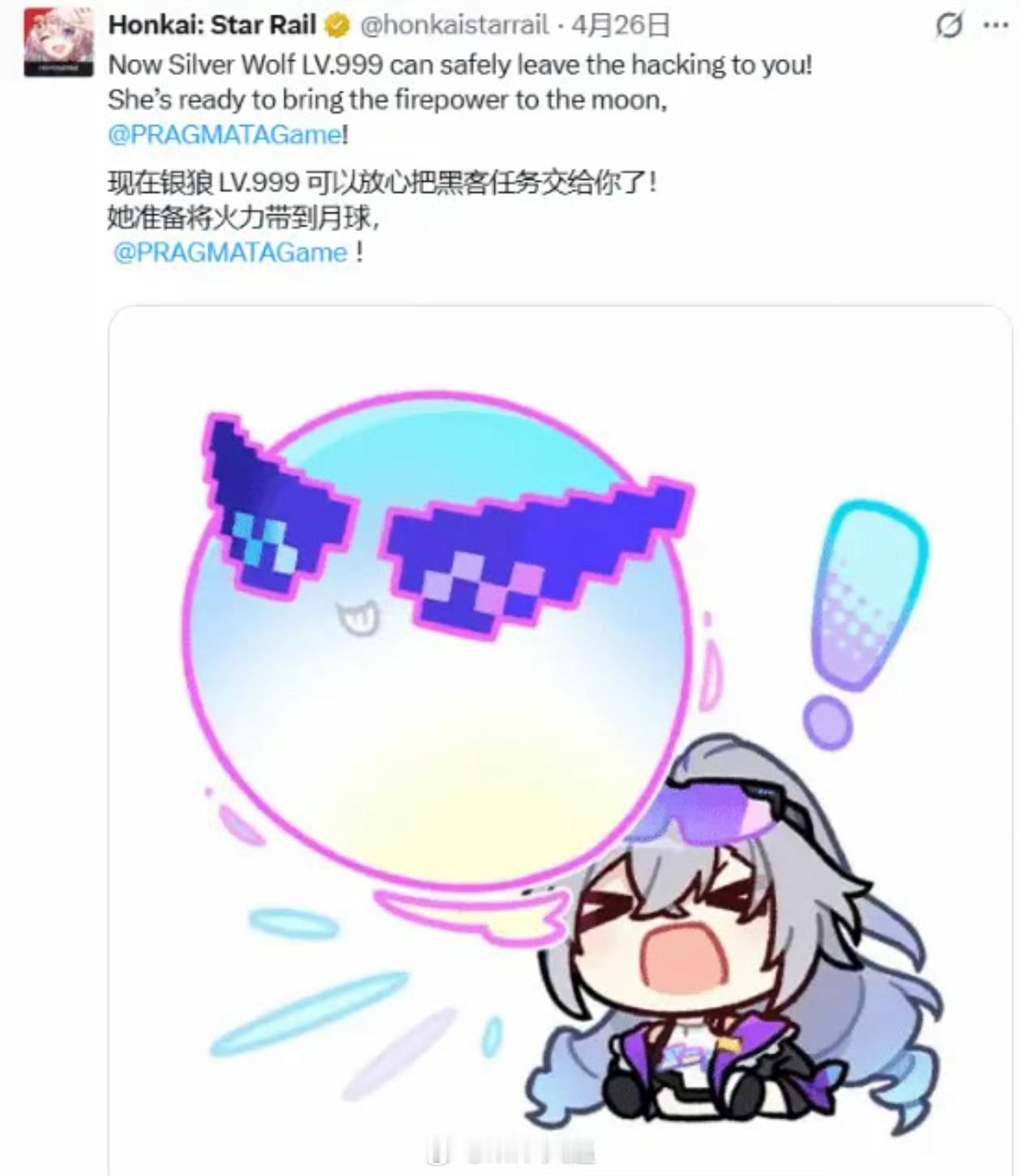 银狼和戴安娜聊上了 当崩铁为银狼的LV.999挑战征集难题,戴安娜从《识质存在》中“穿越”而来回应啦!一个是星穹铁道的酷炫黑客,一个是卡普空新作的天才少女,这场跨次元互动太有爱,仿佛能看到她们隔空击掌的可爱画面。