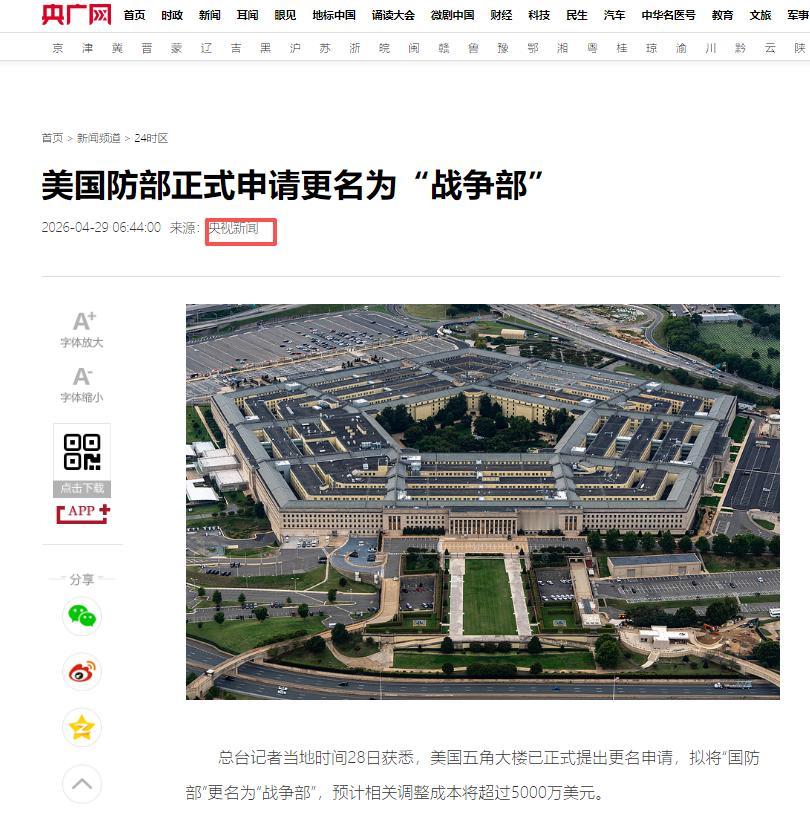 4月29日,五角大楼正式提交立法申请,计划把沿用近80年的“国防部”,改回极具攻击性的“战争部”。预计相关调整成本将超过5000万美元。