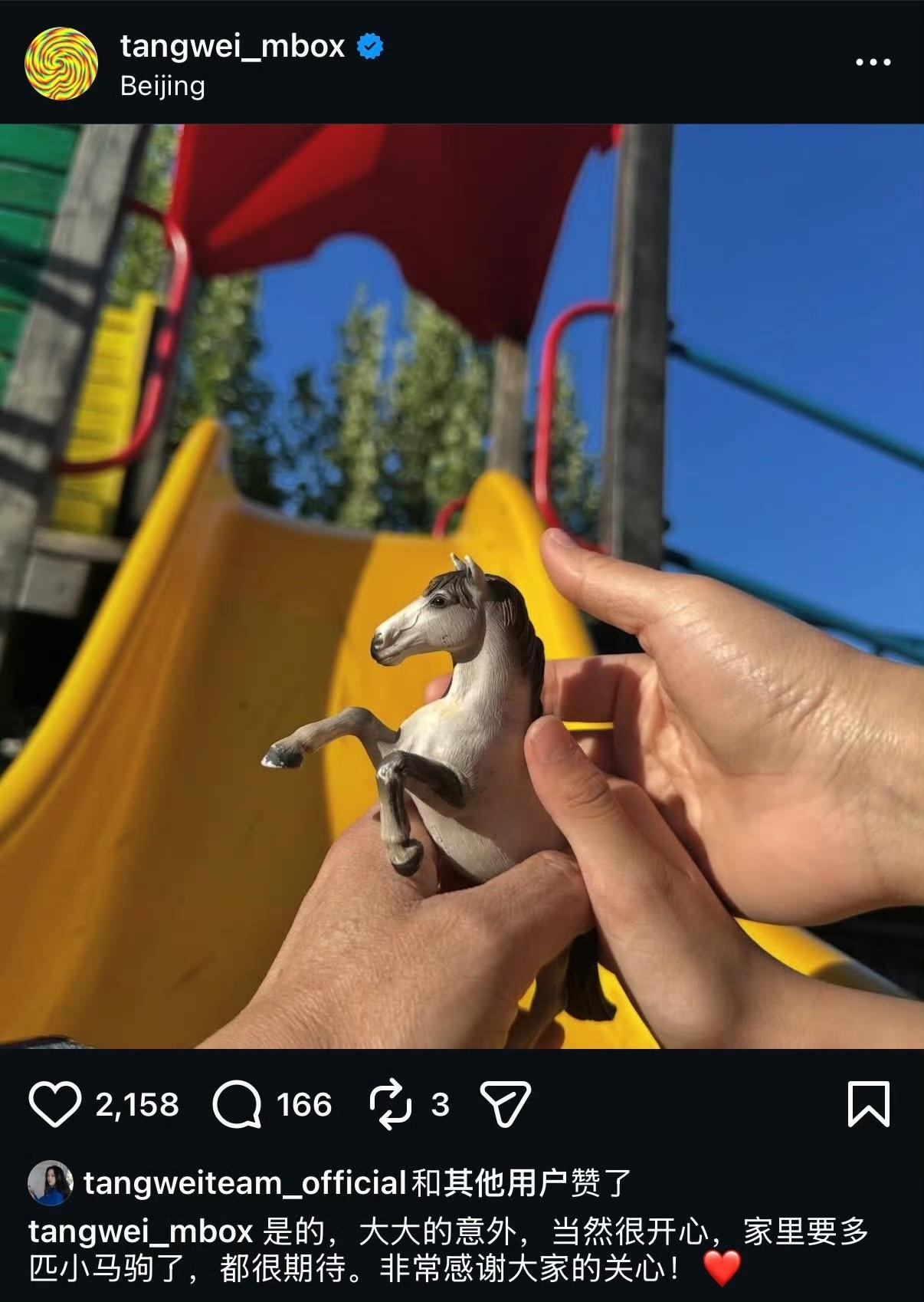 47岁的汤唯在社交平台晒出小马照片,官宣了怀二胎的喜讯:“是的,大大的意外,当然很开心,家里要多匹小马驹了,都很期待。”